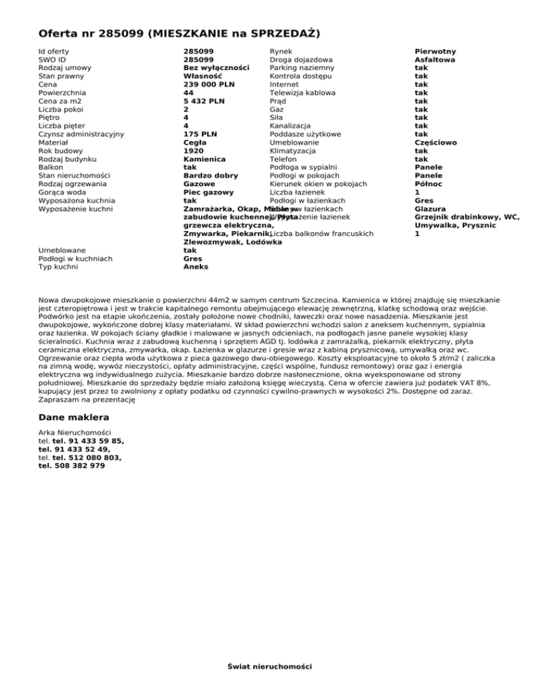 Oferta nr 285099 (MIESZKANIE na SPRZEDAŻ) Id oferty SWO ID Rodzaj umowy Stan prawny Cena Powierzchnia Cena za m2 Liczba pokoi Piętro Liczba pięter Czynsz administracyjny Materiał Rok budowy Rodzaj budynku Balkon Stan nieruchomości Rodzaj ogrzewania Gorąca woda Wyposażona kuchnia Wyposażenie kuchni Umeblowane Podłogi w kuchniach Typ kuchni 285099 Rynek 285099 Droga dojazdowa Bez wyłączności Parking naziemny Własność Kontrola dostępu 239 000 PLN Internet 44 Telewizja kablowa 5 432 PLN Prąd 2 Gaz 4 Siła 4 Kanalizacja 175 PLN Poddasze użytkowe Cegła Umeblowanie 1920 Klimatyzacja Kamienica Telefon tak Podłoga w sypialni Bardzo dobry Podłogi w pokojach Gazowe Kierunek okien w pokojach Piec gazowy Liczba łazienek tak Podłogi w łazienkach Zamrażarka, Okap, Meble Scianyww łazienkach zabudowie kuchennej, Wyposażenie Płyta łazienek grzewcza elektryczna, Zmywarka, Piekarnik,Liczba balkonów francuskich Zlewozmywak, Lodówka tak Gres Aneks Pierwotny Asfaltowa tak tak tak tak tak tak tak tak tak Częściowo tak tak Panele Panele Północ 1 Gres Glazura Grzejnik drabinkowy, WC, Umywalka, Prysznic 1 Nowa dwupokojowe mieszkanie o powierzchni 44m2 w samym centrum Szczecina. Kamienica w której znajduję się mieszkanie jest czteropiętrowa i jest w trakcie kapitalnego remontu obejmującego elewację zewnętrzną, klatkę schodową oraz wejście. Podwórko jest na etapie ukończenia, zostały położone nowe chodniki, ławeczki oraz nowe nasadzenia. Mieszkanie jest dwupokojowe, wykończone dobrej klasy materiałami. W skład powierzchni wchodzi salon z aneksem kuchennym, sypialnia oraz łazienka. W pokojach ściany gładkie i malowane w jasnych odcieniach, na podłogach jasne panele wysokiej klasy ścieralności. Kuchnia wraz z zabudową kuchenną i sprzętem AGD tj. lodówka z zamrażalką, piekarnik elektryczny, płyta ceramiczna elektryczna, zmywarka, okap. Łazienka w glazurze i gresie wraz z kabiną prysznicową, umywalką oraz wc. Ogrzewanie oraz ciepła woda użytkowa z pieca gazowego dwu-obiegowego. Koszty eksploatacyjne to około 5 zł/m2 ( zaliczka na zimną wodę, wywóz nieczystości, opłaty administracyjne, części wspólne, fundusz remontowy) oraz gaz i energia elektryczna wg indywidualnego zużycia. Mieszkanie bardzo dobrze nasłonecznione, okna wyeksponowane od strony południowej. Mieszkanie do sprzedaży będzie miało założoną księgę wieczystą. Cena w ofercie zawiera już podatek VAT 8%, kupujący jest przez to zwolniony z opłaty podatku od czynności cywilno-prawnych w wysokości 2%. Dostępne od zaraz. Zapraszam na prezentację Dane maklera Arka Nieruchomości tel. tel. 91 433 59 85, tel. 91 433 52 49, tel. tel. 512 080 803, tel. 508 382 979 Świat nieruchomości Powered by TCPDF (www.tcpdf.org)