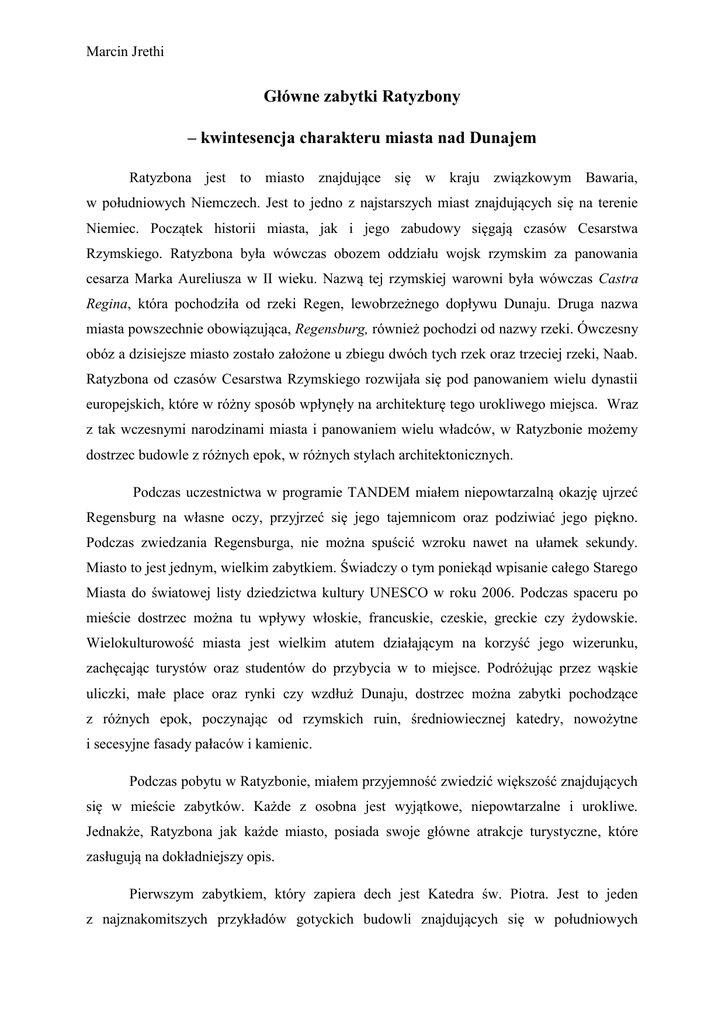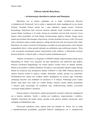 Marcin Jrethi Główne zabytki Ratyzbony – kwintesencja charakteru miasta nad Dunajem Ratyzbona jest to miasto znajdujące się w kraju związkowym Bawaria, w południowych Niemczech. Jest to jedno z najstarszych miast znajdujących się na terenie Niemiec. Początek historii miasta, jak i jego zabudowy sięgają czasów Cesarstwa Rzymskiego. Ratyzbona była wówczas obozem oddziału wojsk rzymskim za panowania cesarza Marka Aureliusza w II wieku. Nazwą tej rzymskiej warowni była wówczas Castra Regina, która pochodziła od rzeki Regen, lewobrzeżnego dopływu Dunaju. Druga nazwa miasta powszechnie obowiązująca, Regensburg, również pochodzi od nazwy rzeki. Ówczesny obóz a dzisiejsze miasto zostało założone u zbiegu dwóch tych rzek oraz trzeciej rzeki, Naab. Ratyzbona od czasów Cesarstwa Rzymskiego rozwijała się pod panowaniem wielu dynastii europejskich, które w różny sposób wpłynęły na architekturę tego urokliwego miejsca. Wraz z tak wczesnymi narodzinami miasta i panowaniem wielu władców, w Ratyzbonie możemy dostrzec budowle z różnych epok, w różnych stylach architektonicznych. Podczas uczestnictwa w programie TANDEM miałem niepowtarzalną okazję ujrzeć Regensburg na własne oczy, przyjrzeć się jego tajemnicom oraz podziwiać jego piękno. Podczas zwiedzania Regensburga, nie można spuścić wzroku nawet na ułamek sekundy. Miasto to jest jednym, wielkim zabytkiem. Świadczy o tym poniekąd wpisanie całego Starego Miasta do światowej listy dziedzictwa kultury UNESCO w roku 2006. Podczas spaceru po mieście dostrzec można tu wpływy włoskie, francuskie, czeskie, greckie czy żydowskie. Wielokulturowość miasta jest wielkim atutem działającym na korzyść jego wizerunku, zachęcając turystów oraz studentów do przybycia w to miejsce. Podróżując przez wąskie uliczki, małe place oraz rynki czy wzdłuż Dunaju, dostrzec można zabytki pochodzące z różnych epok, poczynając od rzymskich ruin, średniowiecznej katedry, nowożytne i secesyjne fasady pałaców i kamienic. Podczas pobytu w Ratyzbonie, miałem przyjemność zwiedzić większość znajdujących się w mieście zabytków. Każde z osobna jest wyjątkowe, niepowtarzalne i urokliwe. Jednakże, Ratyzbona jak każde miasto, posiada swoje główne atrakcje turystyczne, które zasługują na dokładniejszy opis. Pierwszym zabytkiem, który zapiera dech jest Katedra św. Piotra. Jest to jeden z najznakomitszych przykładów gotyckich budowli znajdujących się w południowych Niemczech. Budowa katedry została sfinansowana przez zamożnych mieszczan na prośbę ówczesnego biskupa miasta, Leo Tundorfera. Budowa świątyni rozpoczęła się w XIII wieku. Prace nad takim dużym obiektem, trwały ponad dwa wieki, wraz z wielokrotnymi zmianami tkanki budynku trwającymi do dzisiaj. Za głównych budowniczych katedry na przestrzeni lat uważa się Wenzla Roritzera, Konrada Roritzera, Mateusza Roritzera, Erharda i Urlyka Heydenreicha. Wszyscy powyżej wymieni odpowiedzialni są za średniowieczny charakter katedry. W kolejnych latach katedra otrzymywała elementy wystroju wnętrz jak i sklepienia w stylu aktualnie panującym, czyli w stylach wówczas „modnych”. W XIX wieku postawiono przywrócić katedrze jej czysto gotycki charakter, za co odpowiedzialny jest ówczesny król Bawarii Ludwik I Wittelsbach. Nurt romantyczny, który w XIX wieku miał ogromne znaczenie dla państw niemieckich, zakładał powrót do korzeni, ponowne zainteresowanie gotykiem. Dlatego też na zlecenie króla, zdjęto m.in. barokową kopułę, przywrócono sklepienie krzyżowo – żebrowe oraz usunięto wszystkie ornamenty dodawane po okresie średniowiecza z wnętrza kościoła. Fasada kościoła robi wspaniałe wrażenie. Jest ona pięciokondygnacyjna. Pierwszą kondygnacje stanowią trzy portale wejściowe. Centralny portal jest spektakularny, bowiem poprzedza je trójkątny, zdobiony baldachim, zwieńczony małym pinaklem. Nad bocznymi portalami znajdują się długie i wąskie okna. Zazwyczaj okna w katedrach gotyckich znajdują się dopiero w drugiej kondygnacji. W następnej kondygnacji, w jej centralnej części znajdują się dwa szerokie okna, a po bokach tzw. „ślepe okna”, czyli blendy udające okna. W następnych kondygnacjach również znajdują się okna, ostatnią jednakże stanowią pięknie ozdobione żabkami i zwieńczone kwiatonami hełmy wież. W fasadzie możemy dostrzec takie elementy architektoniczne jak maswerki, laskowanie, blendy, czy znajdująca się w trzeciej kondygnacji wimperga wieńcząca centralną część fasady. Wnętrze kościoła nie jest już tak bogate jak jego fasada. Wszystkie elementy zdobnicze dodawane po okresie średniowiecza zostały usunięte. Jednakże, zabieg ten był zadziałał na korzyść kościoła. W środku znajdują się jedynie zdobienia i rzeźby średniowieczne, które wykonane były z wielka dbałością o szczegóły. Najbardziej rozpoznawalnymi rzeźbami kościoła są rzeźby Matki Boskiej, Archanioła Gabriela, św. Piotra oraz św. Pawła. Katedra posiada również witraże, które zachowały się do naszych czasów. Wejście do kościoła jest obowiązkowe dla każdej osoby, która odwiedza Ratyzbonę. Jest to klejnot miasta, który porównywany jest do znakomitej Katedry św. Wita w Pradze oraz Katedry św. Szczepana w Wiedniu. Będąc w Ratyzbonie, nie sposób jest nie przejść przez lub chociaż obok Kamiennego Mostu, łączącego oba brzegi miasta. Obok Katedry św. Piotra, jest to najbardziej znany zabytek Ratyzbony. Ma on ponad 336 metrów długości oraz 16 przęseł, z czego tylko 15 jest widocznych. Dla małych turystów czeka fascynująca legenda dotycząca mostu. Legenda głosi, że budowniczy mostu założył się z budowniczym katedry o to, który z nich ukończy swoje zadanie w krótszym czasie. Budowla katedry szła jednak znacznie szybciej, dlatego zazdrosny budowniczy mostu zawarł pakt z diabłem. W zamian za użyczenie