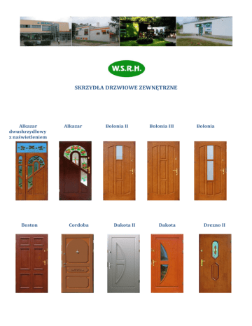 SKRZYDŁA DRZWIOWE ZEWNĘTRZNE Alkazar dwuskrzydłowy z naświetleniem Boston Alkazar Cordoba Bolonia II Dakota II Bolonia III Dakota Bolonia Drezno II Drezno IV Drezno Glasgow II Glasgow Hanower II Hanower Kadyks III-2 Kadyks III z witrażem Kadyks IV Kolonia Korynt Livorno I dwuskrzydłowe z naświetleniem Hamburg II Kadyks III Livorno I z witrażami Livorno I Mediolan z witrażem Nicea Livorno II Mediolan Orlean dwuskrzydłowy z witrażem Londyn Mykeny II Orlean dwuskrzydłowy Lozanna Neapol Orlean Lyon Nicea II Palermo dwuskrzydłowe Palermo II Rzym Tilburg Palermo III Sewilla II Tivoli II-2 Parma Sewilla Tivoli II Parma z witrażem dwuskrzydłowy Syrakuzy Tivoli z witrażem Parma z witrażem Tilburg II Tivoli Toledo Tulon Tuluza Tuluza II Tuluza IV Tuluza VI Tuluza Turyn I-B Turyn II Walencja Wenecja II Wenecja Tuluza III Turyn II z witryną York II z witrażem York II York Więcej informacji: WSRH Sp. z o.o. ul. Średzka 32-36 54-017 Wrocław tel. (071) 355-79-26 [email protected] www.wsrh.pl