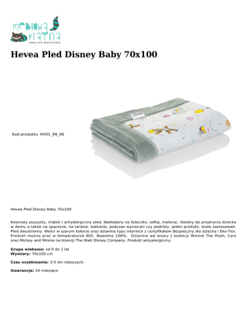 Hevea Pled Disney Baby 70x100 Kod produktu HV01_99_06 Hevea Pled Disney Baby 70x100 Kolorowy puszysty, miękki i antyalergiczny pled. Nakładany na łóżeczko, sofkę, materac. Idealny do przykrycia dziecka w domu a także na spacerze, na tarasie, balkonie, podczas wycieczki czy podróży. Jeden produkt, wiele zastosowań. Pled dwustronny. Welur w szarym kolorze oraz dzianina typu interlock z certyfikatem Bezpieczny dla dziecka i Eko-Tex. Produkt można prać w temperaturze 60C. Bawełna 100%. Dzianina we wzory z kolekcji Winnie The Pooh, Cars oraz Mickey and Minnie na licencji The Walt Disney Company. Produkt antyalergiczny. Grupa wiekowa: od 0 do 2 lat Wymiary: 70x100 cm Czas oczekiwania: 3-5 dni roboczych. Gwarancja: 24 miesiące.