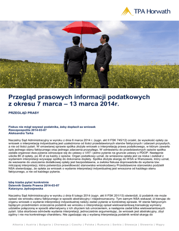 Przegląd prasowych informacji podatkowych z okresu 7 marca – 13 marca 2014r. PRZEGLĄD PRASY Fiskus nie mógł wzywać podatnika, żeby dopłacił za wniosek Rzeczpospolita 2014-03-07 Aleksandra Tarka Naczelny Sąd Administracyjny w wyroku z dnia 6 marca 2014 r. (sygn. akt II FSK 745/12) orzekł, że wysokość opłaty za wniosek o interpretację indywidualną jest uzależniona od ilości przedstawionych stanów faktycznych i zdarzeń przyszłych, a nie od ilości pytań. W omawianej sprawie spółka złożyła wniosek o interpretację prawa podatkowego, w którym zawarła opis jednego stanu faktycznego oraz jednego zdarzenia przyszłego. W odniesieniu do przedstawionych opisów spółka zadała organowi dwa pytania odnoszące się do ustawy o VAT i jedno pytanie na gruncie ustawy o PDOP. Następnie uiściła 80 zł opłaty, po 40 zł za każdy z opisów. Organ podatkowy uznał, że wniesiona opłata jest za niska i zwlekał z wydaniem interpretacji wzywając spółkę do dokonania dopłaty. Spółka złożyła skargę do WSA w Warszawie, który uznał, że wezwanie do uiszczenia dodatkowej opłaty jest bezpodstawne, a zwłoka fiskusa doprowadziła do wydania tzw. milczącej interpretacji, która potwierdza prawidłowość stanowiska wnioskodawcy Przedstawione stanowisko podzielił NSA stwierdzając, że opłata za wniosek o wydanie interpretacji indywidualnej jest wnoszona od każdego stanu faktycznego, a nie od każdego pytania. Izbę trzeba pytać konkretnie Dziennik Gazeta Prawna 2014-03-07 Katarzyna Jędrzejewska Naczelny Sąd Administracyjny w wyroku z dnia 6 lutego 2014 (sygn. akt II FSK 201/13) stwierdził, iż podatnik nie może opisać we wniosku stanu faktycznego w sposób abstrakcyjny i niejednoznaczny. Tym samym NSA wskazał, iż kierując do organu wniosek o wydanie interpretacji indywidualnej należy zadać pytanie w konkretnej sprawie. W stanie faktycznym będącym przedmiotem orzeczenia podatnik we wniosku o interpretację opisał wielowariantową transakcję wymiany udziałów połączoną w sposób alternatywny z ich zbyciem lub umorzeniem, a następnie zadał kilka wielowariantowych pytań. Izba skarbowa odmówiła wydania interpretacji, jednocześnie argumentując, że wniosek jest abstrakcyjny, zbyt ogólny i nie ma konkretnego charakteru. Nie zgadzając się z wydaną interpretacją podatnik wniósł skargę do Albania | Austria | Bułgaria | Chorwacja | Czechy | Polska | Rumunia | Serbia | Słowacja | Słowenia | Węgry Wojewódzkiego Sądu Administracyjnego w Warszawie. Sąd przychylając się do stanowiska podatnika stwierdził, iż wniosek o wydanie interpretacji indywidualnej „może cechować się abstrakcyjnością”. Nie zgadzając się z sentencja wyroku dyrektor izby skarbowej wniósł skargę kasacyjną. NSA rozpoznając sprawę uznał, iż przedstawienie stanu faktycznego w sposób warunkowy, wielowariantowy i abstrakcyjny wyklucza możliwość wydania interpretacji podatkowej. Równocześnie NSA podkreślił, że z opisu stanu faktycznego nie wynika, jakim konkretnym, rzeczywistym podmiotom odpowiadają użyte pojęcia spółek. Jednocześnie wyraził pogląd, iż wydana interpretacja indywidualna stanowiłaby jedynie opinię Ministra Finansów pozbawioną funkcji ochronnych. Kto odzyska nadpłatę Rzeczpospolita 2014-03-11 Maciej Zborowski Wojewódzki Sąd Administracyjny w Warszawie w precedensowym wyroku z dnia 5 grudnia 2013 r. (sygn. akt VIII SA/Wa 696/13) stwierdził, iż płatnik, podobnie jak podatnik, może wystąpić z wnioskiem o stwierdzenie nadpłaty. Dotychczas organy podatkowe w przeważającej mierze prezentowały stanowisko, zgodnie z którym wyłącznie podatnik jest uprawniony do występowania z wnioskiem o stwierdzenie nadpłaty, ponieważ to jego majątek, a nie płatnika, doznaje uszczerbku w wyniku nadpłaty. W opinii autora, przedstawiony pogląd nie znajduje odzwierciedlenia w normach prawnych. Sąd uznał, że kwestia zubożenia podatnika nie ma znaczenia z punktu istnienia prawa do wystąpienia z wnioskiem o zwrot nadpłaty. Podobne stanowisko zajął NSA w wyroku z 2 października 2012 roku (sygn. akt II FSK 289/11) uznając, że w sytuacji, gdy płatnik odprowadzi niewłaściwie obliczony podatek, z wnioskiem o nadpłatę może wystąpić zarówno podatnik jak i płatnik. Wówczas rozpatrzenie złożonego wniosku musi odbywać się przy udziale obydwu podmiotów, a zbadanie, u którego z nich wystąpiła nadpłata należy do zadań właściwych organów podatkowych. Choć firma zaufała fiskusowi, daninę musi dopłacić Rzeczpospolita 2014-03-11 Aleksandra Tarka Podatnik sprzedawał towary stosując obniżoną stawkę VAT. Przed uzyskaniem zwrotu VAT były przeprowadzane kontrole podatkowe zakończone wydaniem protokołów, w których organ podatkowy nie podważał zasadności stosowania obniżonej stawki VAT. Problem wystąpił przy kolejnej kontroli, w której fiskus uznał, że podatnik powinien stosować podstawową stawkę VAT zamiast obniżonej. Podatnik złożył skargę do WSA w Gorzowie powołując się na naruszenie zasady zaufania do organów podatkowych. WSA, a następnie NSA uznały, iż zobowiązanie podatkowe musi być określone w prawidłowej wysokości i zgodnie z obowiązującymi przepisami nawet, gdy fiskus wcześniej nie podważał stosowanej przez podatnika stawki. Tym samym, zastosowanie znajdzie podstawowa stawka VAT. Jednakże, jak podkreślił NSA, zasada zaufania do organów podatkowych powinna być uwzględniona w omawianej sytuacji, np. poprzez nieobciążenie podatnika odsetkami od zaległości podatkowych, niestosowanie sankcji z kodeksu karnego skarbowego czy zastosowanie ulgi w spłacie lub umorzenia podatku. Cash-pooling może być bez podatku Dziennik Gazeta Prawna 2014-03-12 Magdalena Mucha-Prymas W wyroku z dnia 27 lutego 2014 r. (sygn. akt III SA/Wa 2375/13) Wojewódzki Sąd Administracyjny w Warszawie uznał, że jeżeli w umowie o unikaniu podwójnego opodatkowania nie została 