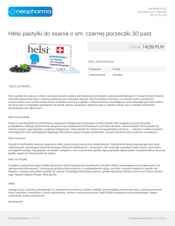 Neopharma.pl Mickiewicza 5, Mikstat 531-470-109 Helsi pastylki do ssania o sm. czarnej porzeczki 30 past. Cena: 14,39 PLN Opis słownikowy Producent Krotex Zastosowanie Chrypka Opis produktu helsi pastylki do ssania o smaku czarnej porzeczki zawiera standaryzowany ekstrakt z porostu islandzkiego 4:1 (Iceland Moss Extract), naturalny koncentrat soku z czarnej porzeczki oraz naturalny aromat; helsi to produkt naturalny, nie zawiera cukru; produkt po rozpuszczeniu się w jamie ustnej tworzy powłokę ochronną w gardle o właściwościach nawilżających oraz osłaniających; helsi zaleca się stosować w przypadku podrażnień na skutek stanów zapalnych, zatkania nosa w stanach alergii oraz w okresie nadmiernej eksploatacji strun głosowych helsi na ból gardła Każdy z nas doświadczył wielokrotnie uciążliwych dolegliwości związanych z bólem gardła. Bez względu na przyczynę bólu – przeziębienie, infekcję, podrażnienie alergiczne czy nadużywanie klimatyzacji w pomieszczeniach i samochodach, helsi pastylki do ssania przynosi ulgę łagodząc uciążliwe dolegliwości. helsi pastylki do ssania tworzą powłokę ochronną – „ barierę” o właściwościach nawilżających oraz osłaniających łagodząc dokuczliwe objawy chrypki, podrażnień, uczucia pieczenia oraz trudności w połykaniu. helsi na kaszel Kaszel to mechanizm obronny organizmu który służy oczyszczaniu dróg oddechowych. Podrażnienie błony śluzowej górnych dróg oddechowych wywołujące kaszel towarzyszy infekcjom bakteryjnym i wirusowym, ale może być wywołane także innymi czynnikami, szczególnie alergią. Gdy pojawia się kaszel i związane z nim uczucie bólu gardła, ulgę przyniesie odpowiednie nawilżenie błony śluzowej gardła, sięgnij po helsi pastylki do ssania. helsi na chrypkę Chrypka to zaburzenie drgań fałdów głosowych krtani najczęściej wywołanych wskutek infekcji, nadwyrężenia strun głosowych czy nadużywania klimatyzacji. Towarzyszą jej dokuczliwe trudności z wydobywaniem głosu, suchość i uczucie drapania w gardle. Na kłopoty z chrypką stosuj helsi pastylki do ssania. Powlekając tkanki jamy ustnej i gardła naturalnym filmem ochronnym helsi przynosi ulgę i łagodzi objawy chrypki i bólu gardła. skład wyciąg suchy z porostu islandzkiego 4:1 (Iceland moss extract), sorbitol, maltitol, guma arabska, koncentrat soku z czarnej porzeczki, kwas cytrynowy, acesulfam K, kwas askorbinowy, aromat z czarnej porzeczki, Capol 4348 (mieszanka wosku pszczelego i olejów roślinnych), woda oczyszczona. dawkowanie Plik wygenerowano: 03-03-2017 Oprogramowanie sklepu: AptusShop Neopharma.pl Mickiewicza 5, Mikstat 531-470-109 ssać powoli 1-2 pastylki kilka razy na dobę Plik wygenerowano: 03-03-2017 Powered by TCPDF (www.tcpdf.org) Oprogramowanie sklepu: AptusShop