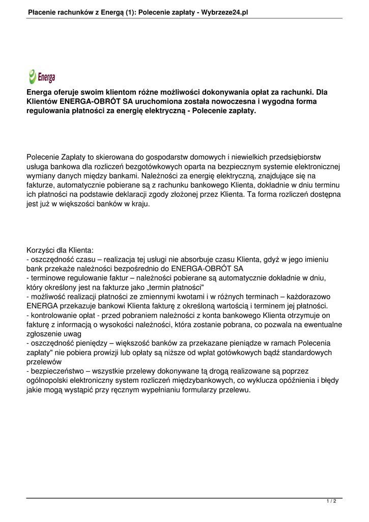 Płacenie rachunków z Energą (1): Polecenie zapłaty - Wybrzeze24.pl Energa oferuje swoim klientom różne możliwości dokonywania opłat za rachunki. Dla Klientów ENERGA-OBRÓT SA uruchomiona została nowoczesna i wygodna forma regulowania płatności za energię elektryczną - Polecenie zapłaty. Polecenie Zapłaty to skierowana do gospodarstw domowych i niewielkich przedsiębiorstw usługa bankowa dla rozliczeń bezgotówkowych oparta na bezpiecznym systemie elektronicznej wymiany danych między bankami. Należności za energię elektryczną, znajdujące się na fakturze, automatycznie pobierane są z rachunku bankowego Klienta, dokładnie w dniu terminu ich płatności na podstawie deklaracji zgody złożonej przez Klienta. Ta forma rozliczeń dostępna jest już w większości banków w kraju. Korzyści dla Klienta: - oszczędność czasu – realizacja tej usługi nie absorbuje czasu Klienta, gdyż w jego imieniu bank przekaże należności bezpośrednio do ENERGA-OBRÓT SA - terminowe regulowanie faktur – należności pobierane są automatycznie dokładnie w dniu, który określony jest na fakturze jako „termin płatności" - możliwość realizacji płatności ze zmiennymi kwotami i w różnych terminach – każdorazowo ENERGA przekazuje bankowi Klienta fakturę z określoną wartością i terminem jej płatności. - kontrolowanie opłat - przed pobraniem należności z konta bankowego Klienta otrzymuje on fakturę z informacją o wysokości należności, która zostanie pobrana, co pozwala na ewentualne zgłoszenie uwag - oszczędność pieniędzy – większość banków za przekazane pieniądze w ramach Polecenia zapłaty" nie pobiera prowizji lub opłaty są niższe od wpłat gotówkowych bądź standardowych przelewów - bezpieczeństwo – wszystkie przelewy dokonywane tą drogą realizowane są poprzez ogólnopolski elektroniczny system rozliczeń międzybankowych, co wyklucza opóźnienia i błędy jakie mogą wystąpić przy ręcznym wypełnianiu formularzy przelewu. 1/2 Płacenie rachunków z Energą (1): Polecenie zapłaty - Wybrzeze24.pl Uruchomienie Polecenia zapłaty Aby opłacać rachunki za energię elektryczną w drodze Polecenie zapłaty wystarczy wypełnić druk Zgody na obciążenie rachunku. Deklarację należy wypełnić w dwóch egzemplarzach, jeden dla ENERGA-OBRÓT SA, a drugi dla banku Klienta. Formularze winny być podpisane zgodnie ze wzorem podpisu złożonym przez Klienta w jego banku. Wypełniony druk Zgody należy złożyć w Biurze Obsługi Klienta, w którym zawarto umowę kompleksową energii elektrycznej bądź przesłać na jego adres. Klient może odwołać pojedynczą płatność zrealizowaną w drodze Polecenie zapłaty, a także w dowolnym czasie zrezygnować z usługi. Chcąc odstąpić od usługi należy wypełnić formularz Odwołania zgody na obciążenie rachunku. Wypełniony formularz odwołania zgody Klient winien dostarczyć: Odwołanie usługi - jeden egzemplarz do Biura Obsługi Klienta - drugi do swojego banku, w którym uruchomione zostało polecenie zapłaty. Dokumenty do pobrania ze strony http://www.energa.pl/obsluga_klienta_platnosci_polecenie_zaplaty: - Zgoda na obciążenie rachunku - Odwołanie zgody na obciążenie rachunku 2/2