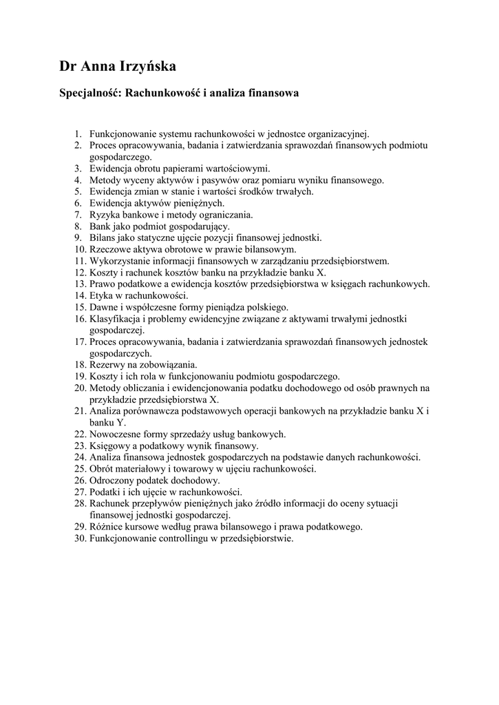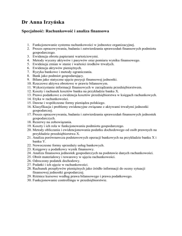 Dr Anna Irzyńska Specjalność: Rachunkowość i analiza finansowa 1. Funkcjonowanie systemu rachunkowości w jednostce organizacyjnej. 2. Proces opracowywania, badania i zatwierdzania sprawozdań finansowych podmiotu gospodarczego. 3. Ewidencja obrotu papierami wartościowymi. 4. Metody wyceny aktywów i pasywów oraz pomiaru wyniku finansowego. 5. Ewidencja zmian w stanie i wartości środków trwałych. 6. Ewidencja aktywów pieniężnych. 7. Ryzyka bankowe i metody ograniczania. 8. Bank jako podmiot gospodarujący. 9. Bilans jako statyczne ujęcie pozycji finansowej jednostki. 10. Rzeczowe aktywa obrotowe w prawie bilansowym. 11. Wykorzystanie informacji finansowych w zarządzaniu przedsiębiorstwem. 12. Koszty i rachunek kosztów banku na przykładzie banku X. 13. Prawo podatkowe a ewidencja kosztów przedsiębiorstwa w księgach rachunkowych. 14. Etyka w rachunkowości. 15. Dawne i współczesne formy pieniądza polskiego. 16. Klasyfikacja i problemy ewidencyjne związane z aktywami trwałymi jednostki gospodarczej. 17. Proces opracowywania, badania i zatwierdzania sprawozdań finansowych jednostek gospodarczych. 18. Rezerwy na zobowiązania. 19. Koszty i ich rola w funkcjonowaniu podmiotu gospodarczego. 20. Metody obliczania i ewidencjonowania podatku dochodowego od osób prawnych na przykładzie przedsiębiorstwa X. 21. Analiza porównawcza podstawowych operacji bankowych na przykładzie banku X i banku Y. 22. Nowoczesne formy sprzedaży usług bankowych. 23. Księgowy a podatkowy wynik finansowy. 24. Analiza finansowa jednostek gospodarczych na podstawie danych rachunkowości. 25. Obrót materiałowy i towarowy w ujęciu rachunkowości. 26. Odroczony podatek dochodowy. 27. Podatki i ich ujęcie w rachunkowości. 28. Rachunek przepływów pieniężnych jako źródło informacji do oceny sytuacji finansowej jednostki gospodarczej. 29. Różnice kursowe według prawa bilansowego i prawa podatkowego. 30. Funkcjonowanie controllingu w przedsiębiorstwie. DR TADEUSZ MIŁOSZ Specjalność: Rachunkowość i analiza finansowa 1 Rozwój rynku pieniężnego w Polsce 2. Bank centralny i instrumenty polityki monetarnej 3. Bankowość elektroniczna w Polsce 4. Hipoteka jako zabezpieczenie kredytu 5. Charakterystyka bankowości spółdzielczej w Polsce 6. Rozwój sektora małych i średnich przedsiębiorstw w Polsce 7. Działalność kredytowa banków 8. Rynek kapitałowy w Polsce 9. Giełda papierów wartościowych S.A. w Warszawie 10. Rola międzynarodowych instytucji finansowych w gospodarce światowej 11. System podatkowy w Polsce 12. Kredyty bankowe i ich zabezpieczenia 13. Metody oceny zdolności kredytowej i ryzyka kredytowego 14. Zarządzanie ryzykiem w banku komercyjnym 15. Leasing jako źródło finansowania inwestycji 16. Finansowanie działalności gospodarczej 17. Analiza finansowa wybranego przedsiębiorstwa 18. Gospodarka finansowa samorządu terytorialnego w Polsce 19. Podatek dochodowy od osób fizycznych w Polsce 20. Systemy podatkowe krajów Unii Europejskiej 21. Rozwój rynku kart płatniczych w Polsce 22. Analiza bilansu wybranego przedsiębiorstwa 23. Wykorzystanie dotacji unijnych w sektorze MSP na wybranym przykładzie 24. Indeksy giełdowe 25. Ryzyko kredytowe i sposoby jego ograniczenia i zarządzania 26. Ryzyko operacyjne w banku