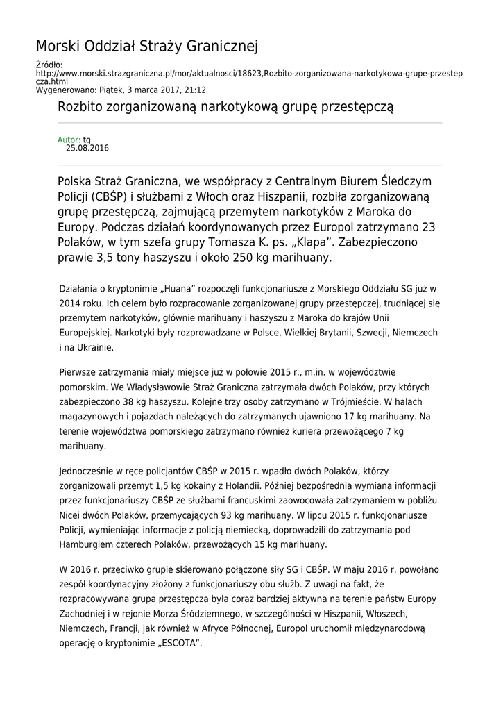 Morski Oddział Straży Granicznej Źródło: http://www.morski.strazgraniczna.pl/mor/aktualnosci/18623,Rozbito-zorganizowana-narkotykowa-grupe-przestep cza.html Wygenerowano: Piątek, 3 marca 2017, 21:12 Rozbito zorganizowaną narkotykową grupę przestępczą Autor: tg 25.08.2016 Polska Straż Graniczna, we współpracy z Centralnym Biurem Śledczym Policji (CBŚP) i służbami z Włoch oraz Hiszpanii, rozbiła zorganizowaną grupę przestępczą, zajmującą przemytem narkotyków z Maroka do Europy. Podczas działań koordynowanych przez Europol zatrzymano 23 Polaków, w tym szefa grupy Tomasza K. ps. „Klapa”. Zabezpieczono prawie 3,5 tony haszyszu i około 250 kg marihuany. Działania o kryptonimie „Huana” rozpoczęli funkcjonariusze z Morskiego Oddziału SG już w 2014 roku. Ich celem było rozpracowanie zorganizowanej grupy przestępczej, trudniącej się przemytem narkotyków, głównie marihuany i haszyszu z Maroka do krajów Unii Europejskiej. Narkotyki były rozprowadzane w Polsce, Wielkiej Brytanii, Szwecji, Niemczech i na Ukrainie. Pierwsze zatrzymania miały miejsce już w połowie 2015 r., m.in. w województwie pomorskim. We Władysławowie Straż Graniczna zatrzymała dwóch Polaków, przy których zabezpieczono 38 kg haszyszu. Kolejne trzy osoby zatrzymano w Trójmieście. W halach magazynowych i pojazdach należących do zatrzymanych ujawniono 17 kg marihuany. Na terenie województwa pomorskiego zatrzymano również kuriera przewożącego 7 kg marihuany. Jednocześnie w ręce policjantów CBŚP w 2015 r. wpadło dwóch Polaków, którzy zorganizowali przemyt 1,5 kg kokainy z Holandii. Później bezpośrednia wymiana informacji przez funkcjonariuszy CBŚP ze służbami francuskimi zaowocowała zatrzymaniem w pobliżu Nicei dwóch Polaków, przemycających 93 kg marihuany. W lipcu 2015 r. funkcjonariusze Policji, wymieniając informacje z policją niemiecką, doprowadzili do zatrzymania pod Hamburgiem czterech Polaków, przewożących 15 kg marihuany. W 2016 r. przeciwko grupie skierowano połączone siły SG i CBŚP. W maju 2016 r. powołano zespół koordynacyjny złożony z funkcjonariuszy obu służb. Z uwagi na fakt, że rozpracowywana grupa przestępcza była coraz bardziej aktywna na terenie państw Europy Zachodniej i w rejonie Morza Śródziemnego, w szczególności w Hiszpanii, Włoszech, Niemczech, Francji, jak również w Afryce Północnej, Europol uruchomił międzynarodową operację o kryptonimie „ESCOTA”. Na podstawie informacji polskiej Straży Granicznej służby hiszpańskie objęły niejawną kontrolą jacht pod polską banderą. Z posiadanych informacji wynikało bowiem, że grupa planuje przerzucić na nim znaczne ilości narkotyków z Afryki Północnej do Hiszpanii. Załoga jachtu wypłynęła z Maroka i kierując się po wodach międzynarodowych Morza Śródziemnego nie wpłynęła jednak na wody terytorialne Hiszpanii. Na początku lipca jacht wpłynął na wody terytorialne Włoch, gdzie, w okolicy portu w Civitavecchia, służby włoskie przejęły kontrolę nad jachtem i zmusiły załogę do zawinięcia do portu. Funkcjonariusze Gwardii Finansowej w wyniku przeszukania łodzi ujawnili ponad 3 tony haszyszu. Członkowie załogi, 2 Polaków, zostali zatrzymani. Pod koniec lipca 2016 r. przeprowadzono kolejne realizacje, których celem było zatrzymanie innych osób zamieszanych w nielegalny proceder. Działania odbyły się w Polsce i Hiszpanii. Wzięli w nich udział funkcjonariusze Guardia Civil, Straży Granicznej, CBŚP i Guardia Di Finanza. Zatrzymano kolejne 2 osoby i zabezpieczono 14 tys. euro, karty kredytowe, mercedesa oraz motocykl marki Honda, komputery, nośniki danych, telefony i karty SIM, a także dwie maczety, które zostaną poddane badaniom pod kątem ujawnienia na nich śladów biologicznych. Wśród zatrzymanych był szef grupy, Tomasz K. ps. „Klapa”. W sumie do sprawy zatrzymano 23 obywateli RP, zabezpieczono 3,4 tony haszyszu, 250 kg marihuany, 1,5 kg kokainy i 1 kg amfetaminy. Śledztwo w sprawie udziału obywateli Polski w zorganizowanej grupie przestępczej o przestępstwo wewnątrzwspólnotowego przemytu narkotyków pomiędzy państwami Unii Europejskiej prowadzi Prokuratura Krajowa Wydział Zamiejscowy w Gdańsku.
