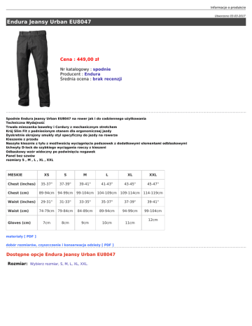 Informacje o produkcie Utworzono 03-03-2017 Endura Jeansy Urban EU8047 Cena : 449,00 zł Nr katalogowy : spodnie Producent : Endura Średnia ocena : brak recenzji Spodnie Endura Jeansy Urban EU8047 na rower jak i do codziennego użytkowania Techniczna Wydajność Trwała mieszanka bawełny i Cordury z mechanicznym stretchem Krój Slim Fit z podniesionym stanem dla ergonomicznej jazdy Dyskretnie skrojony smukły styl specyficzny do jazdy na rowerze Kieszenie z przodu Naszyte kiesznie z tyłu z możliwością wyciągnięcia podszewek z dodatkowymi elementami odblaskowymi Uchwyty D-lock do szybkiego wyciągania rzeczy z kieszeni Odbaskowy wzór widoczny po podwinięciu nogawek Panel bez szwów rozmiary S , M , L , XL , XXL MESKIE Chest (inches) Chest (cm) Waist (inches) Waist (cm) Gloves (cm) XS S M L XL XXL 35-37" 37-39" 39-41" 41-43" 43-45" 45-47" 89-94cm 94-99cm 99-104cm 104-109cm 109-114cm 114-119cm 29-31" 31-33" 74-79cm 79-84cm 7cm 8cm 33-35" 35-37" 37-39" 39-41" 84-89cm 89-94cm 94-99cm 99-104cm 9cm 10cm 11cm materiały [ PDF ] dobór rozmiarów, czyszcczenie i konserwacja odzieży [ PDF ] Dostępne opcje Endura Jeansy Urban EU8047 Rozmiar: Wybierz rozmiar, S, M, L, XL, XXL. 12cm