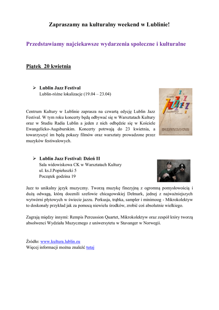 Zapraszamy na kulturalny weekend w Lublinie! Przedstawiamy najciekawsze wydarzenia społeczne i kulturalne Piątek 20 kwietnia Lublin Jazz Festival Lublin-różne lokalizacje (19.04 – 23.04) Centrum Kultury w Lublinie zaprasza na czwartą edycję Lublin Jazz Festival. W tym roku koncerty będą odbywać się w Warsztatach Kultury oraz w Studiu Radia Lublin a jeden z nich odbędzie się w Kościele Ewangelicko-Augsburskim. Koncerty potrwają do 23 kwietnia, a towarzyszyć im będą pokazy filmów oraz warsztaty prowadzone przez muzyków festiwalowych. Lublin Jazz Festival: Dzień II Sala widowiskowa CK w Warsztatach Kultury ul. ks.J.Popiełuszki 5 Początek godzina 19 Jazz to unikalny język muzyczny. Tworzą muzykę finezyjną z ogromną pomysłowością i dużą odwagą, którą docenili szefowie chicagowskiej Delmark, jednej z najważniejszych wytwórni płytowych w świecie jazzu. Perkusja, trąbka, sampler i minimoog - Mikrokolektyw to doskonały przykład jak za pomocą niewielu środków, zrobić coś absolutnie wielkiego. Zagrają między innymi: Rempis Percussion Quartet, Mikrokolektyw oraz zespół który tworzą absolwenci Wydziału Muzycznego z uniwersytetu w Stavanger w Norwegii. Źródło: www.kultura.lublin.eu Więcej informacji można znaleźć tutaj Warsztaty „Mamo! Rób zdjęcia - nie fotki!” Dzielnicowy Dom Kultury "Węglin", ul. Judyma 2a Początek godzina 17 „Mamo! Rób zdjęcia – nie fotki”, są to warsztaty fotograficzne, które poprowadzi Marcin Pietrusza – z zamiłowania i wykształcenia fotograf, animator i menedżer kultury. Warsztaty będą miały 2 części: Część I - 20 kwietnia Podczas której Mamy dowiedzą się, gdzie szukać inspiracji do fotografowania dzieci, jak komponować fotografię i manipulować światłem oraz jak odnaleźć swój własny styl w fotografowaniu. Część II - 27 kwietnia To wyjątkowa sesja zdjęciowa dla Dzieci i Mam, które będą miały okazję wykazać się pomysłowością i zdobytą wiedzą. Warsztaty odbywają się w ramach cyklu spotkań "My Mamy". Źródło: www.kultura.lublin.eu Więcej informacji można znaleźć tutaj Performance zespołu "Słowo" Przestrzeń Działań Twórczych "Tektura", ul. Wieniawska 15a Początek godzina 19 Mówi się, że artysta żyje w swoim świecie. To nie do końca prawda ponieważ osoby, które tworzą sztukę współczesną chcą być jak najbliżej innych ludzi. Tworząc sztukę zdobniczą, użytkową ale również jedyne w swoim rodzaju przedstawienia z udziałem artystów czyli performance. Performance to sytuacja artystyczna, której przedmiotem i podmiotem jest ciało performera. Tematyka performance: apokaliptyczna, przedstawiona w oparciu o Biblię. Zespół "Słowo" w składzie: Anna Zygadło i Agnieszka Niemiec. Źródło: www.kultura.lublin.eu Więcej informacji można znaleźć tutaj Koncert João de Sousa Czarny Tulipan, ul. Grodzka 1 Początek godzina 20 Mieszka we Wrocławiu od 2005. Artystycznie porusza się pomiędzy różnymi latynoskimi stylami muzycznymi, głównie tango i fado. Swoją karierę artystyczną zaczął w 2010 roku kiedy razem z Arielem Ramirezem, wybitnym bandoneonistą z Argentyny, stworzył Tango Quartet. Z tym kwartetem João de Sousa nagrał płytę „Aires” i rozpoczął serię koncertów w całej Polsce, między innymi w filharmoniach w Opolu, Radomiu i Wrocławiu. W swoim solowym projekcie João de Sousa czerpie z fado i folkloru swojego kraju, co pozwala mu oddawać siłę ekspresji portugalskiej muzyki i śpiewu. João de Sousa pokazuje w swoim fado nostalgię, tęsknotę i mieszankę kultur które tworzyły i nadal inspirują tę ponad 150-letnią sztukę. De Sousa na żywo potrafi swoim głosem przekazać emocje, które przekraczają kulturowe i językowe bariery. Każdy jego koncert to wydarzenie, które nie pozostawia nikogo obojętnym. Źródło: www.kultura.lublin.eu Więcej informacji można znaleźć tutaj Sobota 21 kwietnia Występ grupy "No Potatoes" Centrum Języka i Kultury Polskiej, ul. Weteranów 18 Początek godzina 18 Grupa Improwizacji Teatralnej "No Potatoes" zaprasza na kolejny pokaz impro. Spektakle ”No Potatoes” oparte są na kanadyjskim stylu improwizacji teatralnej, która uznana została za jedną z najatrakcyjniejszych scenicznie form IMPROV na świecie. Dochód z biletów zostanie przeznaczony na pokrycie kosztów leczenia Katarzyny Bierzanowskiej- studentki „Lingwistyki Stosowanej” na Uniwersytecie Marii CurieSkłodowskiej. Od 10 lat zmaga się z genetyczną chorobą mięśni, która nie jest uleczalna. Prowadzone obecnie badania dają jednak szanse zatrzymania postępu choroby, a nawet poprawy sprawności dla takich osób. Koszty takiego leczenia są jednak bardzo wysokie, a terapia wymaga powtarzania jej średnio co pół roku i prowadzona jest za granicą, co niesie za sobą kolejne koszty. Czas, odgrywa tu kluczową rolę, ponieważ choroba nieustannie postępuje. Źródło: www.kultura.lublin.eu Więcej informacji można znaleźć tutaj Spektakl "Na końcu łańcucha" Teatr im. Juliusza Osterwy, ul. Gabriela Narutowicza 17 Początek godzina 19 „Na końcu łańcucha” to projekt hardcore’owego koncertu, multikompilacja, krwiożercza zabawa z Szekspirem, Müllerem, Schwabem i Koltѐsem, zbiór coverów coverów coverów. Zanurzona w popkulturze, okrutnie śmieszna, politycznie niepoprawna opowieść o ludzkiej psiości. „Na końcu łańcucha” to sztuka o Tytusie Andronikusie. O specyficznym typie człowieka. Spektakl przeznaczony dla widzów powyżej 16 roku życia. Źródło: www.kultura.lublin.eu Więcej informacji można znaleźć tutaj Koncert z cyklu "Electric Nights Warm-up" Scena Opium, ul. Langiewicza 10 Początek godzina 20 Podczas koncertu zagrają: Lora Lie Muzyka inspirowana dokonaniami PJ Harvey i CocoRosie, a gdzieś w tle przebija się duch Black Tambourine. Crab Invasion Po rocznej przerwie zespół wraca na scenę. Ma on dorobku EPkę "Extend Your Life" (2010) i si