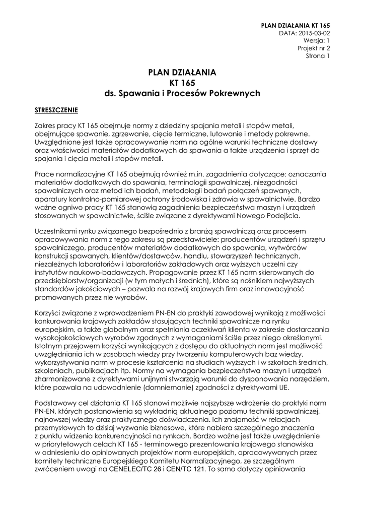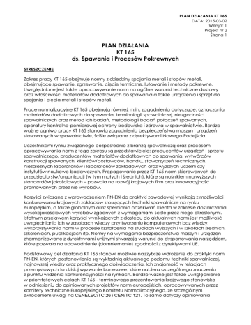 PLAN DZIAŁANIA KT 165 DATA: 2015-03-02 Wersja: 1 Projekt nr 2 Strona 1 PLAN DZIAŁANIA KT 165 ds. Spawania i Procesów Pokrewnych STRESZCZENIE Zakres pracy KT 165 obejmuje normy z dziedziny spajania metali i stopów metali, obejmujące spawanie, zgrzewanie, cięcie termiczne, lutowanie i metody pokrewne. Uwzględnione jest także opracowywanie norm na ogólne warunki techniczne dostawy oraz właściwości materiałów dodatkowych do spawania a także urządzenia i sprzęt do spajania i cięcia metali i stopów metali. Prace normalizacyjne KT 165 obejmują również m.in. zagadnienia dotyczące: oznaczania materiałów dodatkowych do spawania, terminologii spawalniczej, niezgodności spawalniczych oraz metod ich badań, metodologii badań połączeń spawanych, aparatury kontrolno-pomiarowej ochrony środowiska i zdrowia w spawalnictwie. Bardzo ważne ogniwo pracy KT 165 stanowią zagadnienia bezpieczeństwa maszyn i urządzeń stosowanych w spawalnictwie, ściśle związane z dyrektywami Nowego Podejścia. Uczestnikami rynku związanego bezpośrednio z branżą spawalniczą oraz procesem opracowywania norm z tego zakresu są przedstawiciele: producentów urządzeń i sprzętu spawalniczego, producentów materiałów dodatkowych do spawania, wytwórców konstrukcji spawanych, klientów/dostawców, handlu, stowarzyszeń technicznych, niezależnych laboratoriów i laboratoriów zakładowych oraz wyższych uczelni czy instytutów naukowo-badawczych. Propagowanie przez KT 165 norm skierowanych do przedsiębiorstw/organizacji (w tym małych i średnich), które są nośnikiem najwyższych standardów jakościowych – pozwala na rozwój krajowych firm oraz innowacyjność promowanych przez nie wyrobów. Korzyści związane z wprowadzeniem PN-EN do praktyki zawodowej wynikają z możliwości konkurowania krajowych zakładów stosujących techniki spawalnicze na rynku europejskim, a także globalnym oraz spełniania oczekiwań klienta w zakresie dostarczania wysokojakościowych wyrobów zgodnych z wymaganiami ściśle przez niego określonymi. Istotnym przejawem korzyści wynikających z dostępu do aktualnych norm jest możliwość uwzględniania ich w zasobach wiedzy przy tworzeniu komputerowych baz wiedzy, wykorzystywania norm w procesie kształcenia na studiach wyższych i w szkołach średnich, szkoleniach, publikacjach itp. Normy na wymagania bezpieczeństwa maszyn i urządzeń zharmonizowane z dyrektywami unijnymi stwarzają warunki do dysponowania narzędziem, które pozwala na udowodnienie (domniemanie) zgodności z dyrektywami UE. Podstawowy cel działania KT 165 stanowi możliwie najszybsze wdrożenie do praktyki norm PN-EN, których postanowienia są wykładnią aktualnego poziomu techniki spawalniczej, najnowszej wiedzy oraz praktycznego doświadczenia. Ich znajomość w relacjach przemysłowych to dzisiaj wyzwanie biznesowe, które nabiera szczególnego znaczenia z punktu widzenia konkurencyjności na rynkach. Bardzo ważne jest także uwzględnienie w priorytetowych celach KT 165 - terminowego prezentowania krajowego stanowiska w odniesieniu do opiniowanych projektów norm europejskich, opracowywanych przez komitety techniczne Europejskiego Komitetu Normalizacyjnego, ze szczególnym zwróceniem uwagi na CENELEC/TC 26 i CEN/TC 121. To samo dotyczy opiniowania PLAN DZIAŁANIA KT 165 DATA: 2015-03-02 Wersja: 1 Projekt nr 2 Strona 2 projektów norm międzynarodowych komitetów technicznych ISO i IEC związanych ze spawalnictwem, np. IEC/TC 26 i ISO/TC 44. 1 ŚRODOWISKO BIZNESOWE KT 1.1 Opis środowiska biznesowego Na działalność gospodarczą objętą zakresem KT znaczący wpływ mają następujące uwarunkowania polityczne, gospodarcze, techniczne, prawne, społeczne i/lub aspekty regionalne/międzynarodowe: KT 165 ds. Spawania i Procesów Pokrewnych powstał w roku 2010 z połączenia wcześniej działających w branży spawalniczej od roku 1994 trzech Komitetów Technicznych a mianowicie KT Nr 165 ds. Technologii Spawalniczych, KT Nr 166 ds. Jakości w Spawaniu i KT Nr 167 ds. Urządzeń Spawalniczych. Tym samym skupił w zakresie swojej działalności te dziedziny spawalnictwa, które wcześniej były przedmiotem działania ww. trzech komitetów. KT 165 zajmuje się zagadnieniami związanymi ze spawaniem i procesami pokrewnymi spawaniu jak zgrzewanie, lutowanie, obróbka cieplna złączy spawanych, cięcie termiczne, ochroną środowiska spawalniczego a także zagadnieniami związanymi z badaniami niszczącymi i nieniszczącymi złączy spawanych. Procesy te występują praktycznie w całej gospodarce, w różnych dziedzinach przemysłu takich jak przemysł maszynowy, hutniczy, górniczy, rolno-spożywszy, petrochemiczny, samochodowy stoczniowy, w energetyce, w budownictwie itp a także na wyższych uczelniach technicznych i w placówkach naukowo-badawczych zajmujących się działalnością badawczą oraz w licznych ośrodkach szkolenia personelu spawalniczego i personelu badań złączy spawanych. Działalność KT Nr 165 obejmuje zatem : producentów i dystrybutorów urządzeń spawalniczych i materiałów spawalniczych; użytkowników procesów spawalniczych i procesów badania złączy spawanych w różnych dziedzinach przemysłu krajowego; zaplecze naukowo-badawcze spawalnictwa; personel spawalniczy i personel kontroli i badania złączy spawanych. jednostki szkoleniowe dla personelu spawalniczego i personelu badań złączy spawanych KT 165 na szczeblu krajowym przynależy do Sektora Normalizacyjnego PKN - WPN Sektor Hutnictwa, zaś zakres jego współpracy międzynarodowej i regionalnej obejmuje: ASD-STAN/D4/S4; CENELEC/TC 26A; CENELEC/TC 26A/WG 4; CENELEC/TC 26B; CEN/TC 121; CEN/TC 121/SC 3; CEN/TC 121/SC 4; CEN/TC 121/SC 4/WG 1; CEN/TC 121/SC 5; CEN/TC 121/SC 5/WG 1; CEN/TC 121/SC 5/WG 2; CEN/TC 121/SC 7; CEN/TC 121/SC 8; CEN/TC 121/SC 9; CEN/TC 121/SC 9/WG 4; CEN/TC 121/WG 13; IEC/TC 26; ISO/TC 44; ISO/TC 44/SC 10; ISO/TC 44/SC 11; ISO/TC 44/SC 12; ISO/TC 44/SC 3; IS