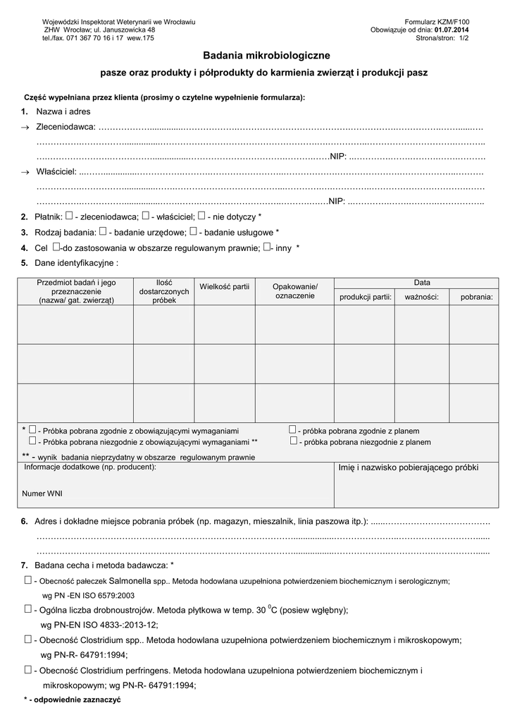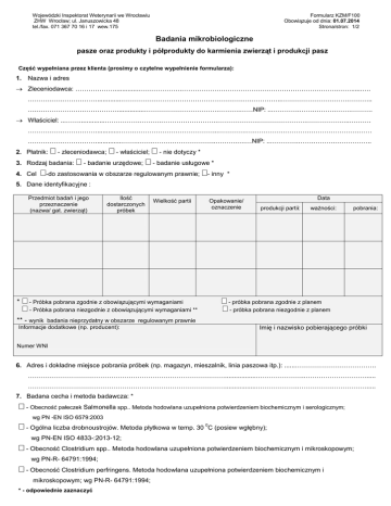 Wojewódzki Inspektorat Weterynarii we Wrocławiu ZHW Wrocław; ul. Januszowicka 48 tel./fax. 071 367 70 16 i 17 wew.175 Formularz KZM/F100 Obowiązuje od dnia: 01.07.2014 Strona/stron: 1/2 Badania mikrobiologiczne pasze oraz produkty i półprodukty do karmienia zwierząt i produkcji pasz Część wypełniana przez klienta (prosimy o czytelne wypełnienie formularza): 1. Nazwa i adres → Zleceniodawca: ………………..............……………….………………………………….…………….…………….……......…. …………….……………...............……………………………………………….….…………..………………………….……….. ….………………….……………...............…………………………….……….……NIP: ..………….…….……….…….………. → Właściciel: ...……..............…………….……….……………………..……………….………………….………………..………. …………….…………….............…….………………………………...………….….…………..…………………………….…… …………….……………...............…….…….………………………..……….….…NIP: ..………….…….……….…………….. 2. Płatnik: - zleceniodawca; 3. Rodzaj badania: 4. Cel - właściciel; - badanie urzędowe; - nie dotyczy * - badanie usługowe * -do zastosowania w obszarze regulowanym prawnie; - inny * 5. Dane identyfikacyjne : Przedmiot badań i jego przeznaczenie (nazwa/ gat. zwierząt) * Ilość dostarczonych próbek Wielkość partii Opakowanie/ oznaczenie - Próbka pobrana zgodnie z obowiązującymi wymaganiami - Próbka pobrana niezgodnie z obowiązującymi wymaganiami ** Data produkcji partii: ważności: pobrania: - próbka pobrana zgodnie z planem - próbka pobrana niezgodnie z planem ** - wynik badania nieprzydatny w obszarze regulowanym prawnie Informacje dodatkowe (np. producent): Imię i nazwisko pobierającego próbki Numer WNI 6. Adres i dokładne miejsce pobrania próbek (np. magazyn, mieszalnik, linia paszowa itp.): ......………………………………. ……………………………………………………………………………….................…………………..………………………...... ……………………………………………………………………………….................……………….…………….……………...... 7. Badana cecha i metoda badawcza: * - Obecność pałeczek Salmonella spp.. Metoda hodowlana uzupełniona potwierdzeniem biochemicznym i serologicznym; wg PN -EN ISO 6579:2003 0 - Ogólna liczba drobnoustrojów. Metoda płytkowa w temp. 30 C (posiew wgłębny); wg PN-EN ISO 4833-:2013-12; - Obecność Clostridium spp.. Metoda hodowlana uzupełniona potwierdzeniem biochemicznym i mikroskopowym; wg PN-R- 64791:1994; - Obecność Clostridium perfringens. Metoda hodowlana uzupełniona potwierdzeniem biochemicznym i mikroskopowym; wg PN-R- 64791:1994; * - odpowiednie zaznaczyć Formularz KZM/F100 Obowiązuje od dnia: 01.07.2014 Strona/stron: 2/2 - Liczba Enterobacteriaceae. Metoda płytkowa (posiew wgłębny); wg PN-ISO 21528-2:2005; - Obecność antybiotyków lub innych substancji o działaniu przeciwbakteryjnym Metoda dyfuzji w żelu agarowym (8-płytkowa); wg. PB-02/ZM edycja 03 z dnia 16.07.2012r. - Liczba gronkowców koagulazo-dodatnich (Staphylococcus aureus i innych gatunków). Metoda płytkowa (posiew wgłębny); wg PN-EN ISO 6888-2:2001 + A1:2004; - Obecność beztlenowych laseczek przetrwalnikujących; Metoda hodowlana uzupełniona potwierdzeniem mikroskopowym; wg PN-R 64791:1994; - Ogólna liczba grzybów; metoda płytkowa (posiew powierzchniowy); wg PN-ISO 21527-1:2009; PN-ISO 21527-2:2009; - Woda z poideł dla zwierząt - Obecność pałeczek Salmonella spp. Metoda hodowlana uzupełniona potwierdzeniem biochemicznym i serologicznym; wg PN -EN ISO 6579:2003 - Obecność kwasu nukleinowego DNA specyficznego dla Salmonella spp..Metoda real – time PCR; wg PB-01/ZM edycja 04 z dn. 16.07.2012r - inne z zakresu wykonywanych badań: ……………………………........................…….……………………………………... 8. Wyniki badań podane będą wraz z ich niepewnością: - tak; - nie * 9. Forma przekazania sprawozdania z badania: * - odbiór osobisty; 10. Sposób płatności: 1. 2. 3. 4. 5. 6. 7. 8. 9. - poczta; - przelew ; - fax. Nr…….....................…......; - e-mail : ........................…..………...... - gotówka * Podpis jest akceptacją metod badawczych stosowanych w ZHW we Wrocławiu w badaniach wykonywanych na rzecz klienta; Podpis jest potwierdzeniem zapoznania się z poniższymi informacjami. Zmiana zlecenia wymaga formy pisemnej ZHW we Wrocławiu ma prawo odstąpić od wykonania badania w momencie braku w/w danych, przekazania nieaktualnego formularza zlecenia oraz gdy stan próbki jest niezgodny z wymaganiami laboratorium (umieszczonymi na stronie http://wroc.wiw.gov.pl). Klient ma prawo do wnoszenia skarg kierując się bezpośrednio lub za pośrednictwem ZHW we Wrocławiu do WIW we Wrocławiu w terminie 14 dni od momentu uzyskania wyników z badań. Laboratorium zapewnia poufność badań; ZHW we Wrocławiu nie podaje częściowych wyników badań. Jeżeli uzyskane wyniki wskazywałyby na zagrożenie zdrowia ludzi lub zwierząt, albo ze względów epizootycznych, powiadomiony zostaje właściwy terytorialnie Powiatowy Lekarz Weterynarii i Wojewódzki Lekarz Weterynarii. Pozostałości próbek przeznaczonych do badań nie podlegają zwrotowi i pozostają w dyspozycji ZHW. Laboratorium posiada akredytację PCA nr AB 584. Aktualny zakres akredytacji dostępny na stronie http://www.pca.gov.pl.oraz http://www.wroc.wiw.gov.pl Niepewność wyników podawana jest w przypadku wartości granicznych, gdy ma to znaczenie dla
