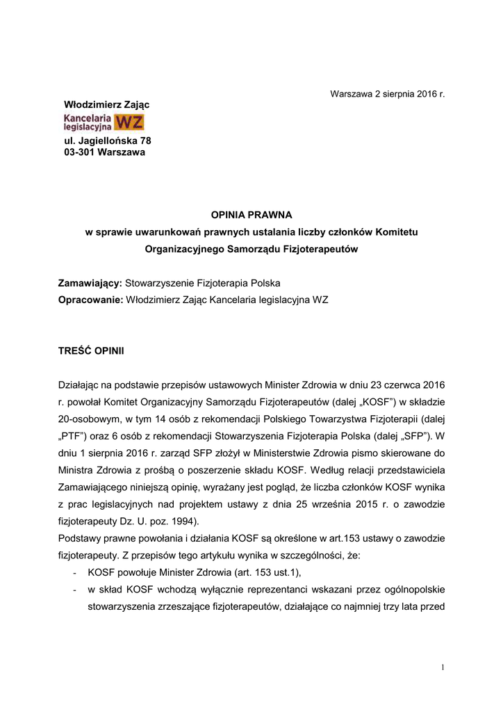 Warszawa 2 sierpnia 2016 r. Włodzimierz Zając ul. Jagiellońska 78 03-301 Warszawa OPINIA PRAWNA w sprawie uwarunkowań prawnych ustalania liczby członków Komitetu Organizacyjnego Samorządu Fizjoterapeutów Zamawiający: Stowarzyszenie Fizjoterapia Polska Opracowanie: Włodzimierz Zając Kancelaria legislacyjna WZ TREŚĆ OPINII Działając na podstawie przepisów ustawowych Minister Zdrowia w dniu 23 czerwca 2016 r. powołał Komitet Organizacyjny Samorządu Fizjoterapeutów (dalej „KOSF”) w składzie 20-osobowym, w tym 14 osób z rekomendacji Polskiego Towarzystwa Fizjoterapii (dalej „PTF”) oraz 6 osób z rekomendacji Stowarzyszenia Fizjoterapia Polska (dalej „SFP”). W dniu 1 sierpnia 2016 r. zarząd SFP złożył w Ministerstwie Zdrowia pismo skierowane do Ministra Zdrowia z prośbą o poszerzenie składu KOSF. Według relacji przedstawiciela Zamawiającego niniejszą opinię, wyrażany jest pogląd, że liczba członków KOSF wynika z prac legislacyjnych nad projektem ustawy z dnia 25 września 2015 r. o zawodzie fizjoterapeuty Dz. U. poz. 1994). Podstawy prawne powołania i działania KOSF są określone w art.153 ustawy o zawodzie fizjoterapeuty. Z przepisów tego artykułu wynika w szczególności, że: KOSF powołuje Minister Zdrowia (art. 153 ust.1), w skład KOSF wchodzą wyłącznie reprezentanci wskazani przez ogólnopolskie stowarzyszenia zrzeszające fizjoterapeutów, działające co najmniej trzy lata przed 1 dniem wejścia w życie ustawy (art. 153 ust. 2). Brak jest jakichkolwiek przepisów, które określałyby konkretną liczbę członków KOSF lub określały granice liczbowe w jakich może „poruszać” się Minister Zdrowia. W ocenie autora opinii jedynie pośrednio można wywodzić przesłanki, według jakich powinny być ustalane liczba i skład KOSF. Po pierwsze, zadaniem KOSF jest podjęcie działań w celu przeprowadzenia pierwszego Krajowego Zjazdu Fizjoterapeutów, sprowadzających się do rozpoznawania wniosków o wpis i dokonywania wpisów do Krajowego Rejestru Fizjoterapeutów, zorganizowania i zwołania zebrań wyłaniających delegatów na pierwszy Krajowy Zjazd Fizjoterapeutów oraz ustalenie jego regulaminu. W tym zakresie musi być zapewniona liczba członków, którzy będą w stanie zapewnić wykonanie tych zadań w terminach przewidzianych ustawą, uwzględniająca charakter i zakres czynności wykonywanych bezpośrednio przez członków KOSF. Po drugie, skoro KOSF do czasu powołania organów Krajowej Izby Fizjoterapeutów, jest organem właściwym w sprawach organizacji samorządu zawodowego fizjoterapeutów, to jego skład powinien opierać się na zasadzie równej reprezentacji całego środowiska. Inne rozwiązanie mogłoby być przyczyną zniekształcenia pierwszych wyborów, a w efekcie ukształtowania ustroju samorządu fizjoterapeutów bez odzwierciedlenia rzeczywistej woli całego środowiska zawodowego. W przypadku samorządu fizjoterapeutów jest to tym bardziej niepożądane, że przynależność do samorządu jest obowiązkowa (art. 3 ust. 2 ustawy) i już przy jego konstytuowaniu powinna być zapewniona możliwie szeroka reprezentatywność wszystkich potencjalnych członków. Należy podkreślić, że przynależność do samorządu zawodowego i prawo do jego reprezentacji opiera się na zasadzie równości i powszechności dostępu, istota samorządu polega na samodzielnym wykonywaniu części zadań publicznych przez bezpośrednio zainteresowanych. Skład KOSF powinien być więc kształtowany zgodnie z tymi uwarunkowaniami. Jeżeli więc ustawodawca w art. 153 ust. 2 zdecydował się na wyłonienie składu KOSF tylko spośród reprezentantów stowarzyszeń spełniających ustawowo określone warunki, to jednym z podstawowym kryteriów ustalania składu powinna być równa reprezentacja uprawnionych podmiotów – PTF i SFP. Pojęcie „reprezentanta” należy zdaniem autora opinii rozumieć dwojako. Z jednej strony 2 reprezentant, o którym mowa w art. 153 ust. 2, jest reprezentantem przyszłej wspólnoty samorządowej, z drugiej zaś reprezentantem stowarzyszenia, które obecnie jest swego rodzaju rzecznikiem interesów fizjoterapeutów. Zarówno w jednym, jak i drugim rozumieniu istotą rozwiązania zawartego w art. 153 ust. 2 jest zapewnienie równych praw całej wspólnoty fizjoterapeutów w procesie tworzenia organów samorządu i jego ustroju. Niezależnie od powyższego należy wskazać, że punktem odniesienia dla ustalenia odpowiedniej liczby członków KOSF nie może być w szczególności treść uzasadnienia poselskiego projektu ustawy o zawodzie fizjoterapeuty oraz o zmianie innych ustaw (Sejm VII kadencji, druk nr 3001)1. Projekt ten stanowił podstawę procesu ustawodawczego, przyjętej w dniu 25 września 2015 r. ustawy o zawodzie fizjoterapeuty, a w jego uzasadnieniu (pkt 3) rzeczywiście zawarto stwierdzenie, że organ powołany do organizacji samorządu ma mieć „maksymalnie 21 osób”. Należy jednak zwrócić uwagę, że projekt ten w swojej pierwotnej treści przewidywał, że organem tym miała być Tymczasowa Krajowa Rada Fizjoterapeutów. Zgodnie art. 137 projektu w jej skład mieli wchodzić: Krajowy Konsultant do spraw Fizjoterapii, Wojewódzcy Konsultanci do spraw Fizjoterapii, 2 przedstawicieli ogólnopolskich związków zawodowych zrzeszających fizjoterapeutów, 2 przedstawicieli towarzystw naukowych z dziedziny fizjoterapii (czyli łącznie 21 osób). Tymczasowa Rada miała wykonywać ustawowe zadania Krajowej Rady Fizjoterapeutów do czasu jej powołania. Skład, zadania i długość działania były więc zupełnie inne niż skład, zadania i długość działania KOSF. Nic nie uzasadnia, aby liczbę członków KOSF ustalać według pierwotnej treści projektu stanowiącego podstawę przyjęcia ustawy z dnia 25 września 2015 r. WNIOSKI 1. Brak jest przepisów, na podstawie których bezpośrednio można określić konkretną liczbę członków powoływanych przez Ministra Zd