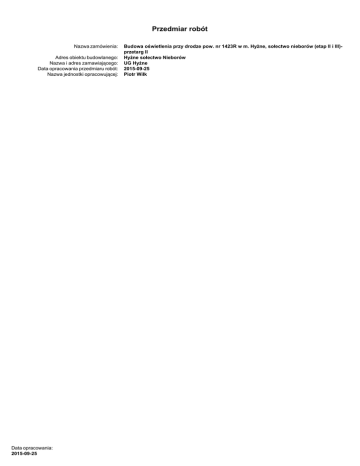 Przedmiar robót Nazwa zamówienia: Adres obiektu budowlanego: Nazwa i adres zamawiającego: Data opracowania przedmiaru robót: Nazwa jednostki opracowującej: Data opracowania: 2015-09-25 Budowa oświetlenia przy drodze pow. nr 1423R w m. Hyżne, sołectwo nieborów (etap II i III)przetarg II Hyżne sołectwo Nieborów UG Hyżne 2015-09-25 Piotr Wilk ZUZIA11 (C) Datacomp 1994-2013 (lic. 0004CA5C) strona nr: 2 Spis działów przedmiaru robót Nr 1 1.1 1.2 1.3 1.4 1.5 1.6 1.7 1.8 1.9 1.10 1.11 1.12 1.13 1.14 1.15 1.16 1.17 1.18 1.19 1.20 1.21 1.22 1.23 1.24 Nazwa działu robót Oświetlenie od słupa nr 66/25/3 do słupa nr 66/28/3 Wykopy ręczne dla słupów elektroenergetycznych linii napowietrznych niskiego napięcia, wykopy o głębokości do 1.5˙m, kategoria gruntu III Montaż i stawianie słupów linii napowietrznej NN z żerdzi wirowanych, słup pojedynczy 10,0/4,3 Montaż i stawianie słupów linii napowietrznej NN z żerdzi wirowanych, słup pojedynczy10,0/6 Montaż zabezpieczenia wzdłużnego, skrzynek bezpiecznikowych i odgromników w liniach napowietrznych NN z przewodów izolowanych, odgromnik Montaż wysięgników rurowych i przewieszek z lin stalowych, na słupie, wysięgnik do 15˙kg Montaż zabezpieczenia wzdłużnego, skrzynek bezpiecznikowych i odgromników w liniach napowietrznych NN z przewodów izolowanych, skrzynka bezpiecznikowa Montaż opraw oświetlenia zewnętrznego, na słupie SGS 150 Montaż przewodów do opraw oświetleniowych, wciąganych w słupy, rury osłonowe i wysięgniki, wysokość latarń do 10˙m Mechaniczne pogrążanie uziomów pionowych prętowych, kategoria gruntu III Montaż uziomów lub przewodów uziemiających, kategoria gruntu III Badania i pomiary instalacji uziemiającej, piorunochronnej i skutecznowści zerowania, uziemienie ochronne lub robocze, pomiar pierwszy Kopanie rowów dla kabli, ręcznie, grunt kategorii III Zasypanie rowów dla kabli, ręcznie, grunt kategorii III Nasypanie warstwy piasku na dnie rowu kablowego, szerokość do 0,4˙m Złącza napowietrzne, Z-1 Montaż rur osłonowych i skrzynek rozdzielczych, rura na słupie Układanie kabli na słupach betonowych, bezpośrednio na słupie, masa do 1,0˙kg/m, w uchwytach YAKY 4x25mm2 Ułożenie rur osłonowych PVC do Fi˙140˙mm DVK 50 Układanie kabli w rurach, pustakach lub kanałach zamkniętych, kabel do 1,0˙kg/m YAKY 4x25mm2 Układanie kabli w rowach kablowych - ręcznie, kabel do 1,0˙kg/m, przykrycie folią YAKY 4x25mm2 Montaż przewodów izolowanych linii napowietrznej NN typu AsXSn lub podobnych, przewód 4x25˙mm2 Obróbka na sucho kabli do 1˙kV o izolacji i powłoce z tworzyw sztucznych, kabel Al 4-żyłowy do 50˙mm2 Badanie linii kablowej niekiego napięcia, kabel n.n., 4-żyłowy Obsługa geodezyjna i wyłączenia PGE ZUZIA11 (C) Datacomp 1994-2013 (lic. 0004CA5C) strona nr: 3 Przedmiar robót <-NR-> <-PODST-> Nr 1 1.1 1.2 1.3 1.4 1.5 1.6 1.7 1.8 1.9 1.10 1.11 1.12 1.13 1.14 1.15 1.16 1.17 1.18 1.19 1.20 1.21 1.22 1.23 1.24 Kod pozycji Kosztorys Element KNR 201/707/2 <-OPIS-> <-JEDN-> Opis robót, wyliczenie ilości robót <-ILOSC-> Jm Ilość Budowa oświetlenia przy drodze pow. nr 1423R w m. Hyżne, sołectwo nieborów (etap II i III)- przetarg II Oświetlenie od słupa nr 66/25/3 do słupa nr 66/28/3 Wykopy ręczne dla słupów elektroenergetycznych linii napowietrznych niskiego napięcia, wykopy o głębokości do 1.5˙m, kategoria gruntu III Wyliczenie ilości robót: 2,6*3 7,80 RAZEM: 7,80 KNNR 5/903/2 Montaż i stawianie słupów linii napowietrznej NN z żerdzi wirowanych, słup pojedynczy 10,0/4,3 KNNR 5/903/2 Montaż i stawianie słupów linii napowietrznej NN z żerdzi wirowanych, słup pojedynczy10,0/6 KNNR 5/906/3 Montaż zabezpieczenia wzdłużnego, skrzynek bezpiecznikowych i odgromników w liniach napowietrznych NN z przewodów izolowanych, odgromnik KNNR 5/1002/1 Montaż wysięgników rurowych i przewieszek z lin stalowych, na słupie, wysięgnik do 15˙kg KNNR 5/906/2 Montaż zabezpieczenia wzdłużnego, skrzynek bezpiecznikowych i odgromników w liniach napowietrznych NN z przewodów izolowanych, skrzynka bezpiecznikowa KNNR 5/1004/1 Montaż opraw oświetlenia zewnętrznego, na słupie SGS 150 KNNR 5/1003/3 Montaż przewodów do opraw oświetleniowych, wciąganych w słupy, rury osłonowe i wysięgniki, wysokość (1) latarń do 10˙m KNNR 5/907/5 Mechaniczne pogrążanie uziomów pionowych prętowych, kategoria gruntu III KNNR 5/907/2 Montaż uziomów lub przewodów uziemiających, kategoria gruntu III Wyliczenie ilości robót: 1*30 30,00 RAZEM: 30,00 KNNR 5/1304/1 Badania i pomiary instalacji uziemiającej, piorunochronnej i skutecznowści zerowania, uziemienie ochronne lub robocze, pomiar pierwszy KNNR 5/701/2 Kopanie rowów dla kabli, ręcznie, grunt kategorii III Wyliczenie ilości robót: (105)*0,4*0,9 37,80 RAZEM: 37,80 KNNR 5/702/2 Zasypanie rowów dla kabli, ręcznie, grunt kategorii III Wyliczenie ilości robót: 37,8 37,80 RAZEM: 37,80 KNNR 5/706/1 Nasypanie warstwy piasku na dnie rowu kablowego, szerokość do 0,4˙m Wyliczenie ilości robót: 105*0,4 42,00 RAZEM: 42,00 KNNR 5/402/1 Złącza napowietrzne, Z-1 KNNR 5/1005/1 Montaż rur osłonowych i skrzynek rozdzielczych, rura na słupie KNNR 5/717/2 Układanie kabli na słupach betonowych, bezpośrednio na słupie, masa do 1,0˙kg/m, w uchwytach YAKY (1) 4x25mm2 KNNR 5/705/1 Ułożenie rur osłonowych PVC do Fi˙140˙mm DVK 50 KNNR 5/713/2 Układanie kabli w rurach, pustakach lub kanałach zamkniętych, kabel do 1,0˙kg/m YAKY 4x25mm2 KNNR 5/707/2 Układanie kabli w rowach kablowych - ręcznie, kabel do 1,0˙kg/m, przykrycie folią YAKY 4x25mm2 (1) Wyliczenie ilości robót: 105-25 80,00 RAZEM: 80,00 KNNR 5/905/1 Montaż przewodów izolowanych linii napowietrznej NN typu AsXSn lub podobnych, przewód 4x25˙mm2 KNR 510/603/7 Obróbka na sucho kabli do 1˙kV o izolacji i powłoce z tworzyw sztucznych, kabel Al 4-żyłowy do 50˙mm2 R= 0,955 M= 1,000 S= 1,000 KNNR 5/1302/3 Badanie