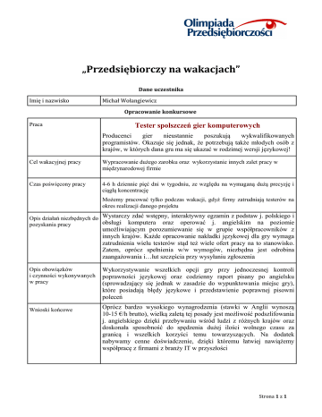 „Przedsiębiorczy na wakacjach” Dane uczestnika Imię i nazwisko Michał Wołangiewicz Opracowanie konkursowe Praca Tester spolszczeń gier komputerowych Producenci gier nieustannie poszukują wykwalifikowanych programistów. Okazuje się jednak, że potrzebują także młodych osób z krajów, w których dana gra ma się ukazać w rodzimej wersji językowej! Cel wakacyjnej pracy Wypracowanie dużego zarobku oraz wykorzystanie innych zalet pracy w międzynarodowej firmie Czas poświęcony pracy 4-6 h dziennie pięć dni w tygodniu, ze względu na wymaganą dużą precyzję i ciągłą koncentrację Możemy pracować tylko podczas wakacji, gdyż firmy zatrudniają testerów na okres realizacji danego projektu Opis działań niezbędnych do Wystarczy zdać wstępny, interaktywny egzamin z podstaw j. polskiego i obsługi komputera oraz operować j. angielskim na poziomie pozyskania pracy umożliwiającym porozumiewanie się w grupie współpracowników z innych krajów. Każde opracowanie nakładki językowej dla gry wymaga zatrudnienia wielu testerów stąd też wiele ofert pracy na to stanowisko. Zatem, oprócz spełnienia w/w wymogów, niezbędna jest odrobina zaangażowania i…łut szczęścia przy wysyłaniu zgłoszenia Opis obowiązków i czynności wykonywanych w pracy Wnioski końcowe Wykorzystywanie wszelkich opcji gry przy jednoczesnej kontroli poprawności językowej oraz codzienny raport pisany po angielsku (sprowadzający się jednak w zasadzie do wypunktowania miejsc gry), które posiadają błędy językowe i przedstawienie poprawnej pisowni poleceń Oprócz bardzo wysokiego wynagrodzenia (stawki w Anglii wynoszą 10-15 €/h brutto), wielką zaletą tej posady jest możliwość podszlifowania j. angielskiego dzięki przebywaniu wśród ludzi z różnych krajów oraz doskonała sposobność do spędzenia dużej ilości wolnego czasu za granicą i wszelkich korzyści temu towarzyszących. Na dodatek nabywamy cenne doświadczenie, dzięki któremu łatwiej nawiążemy współpracę z firmami z branży IT w przyszłości Strona 1 z 1