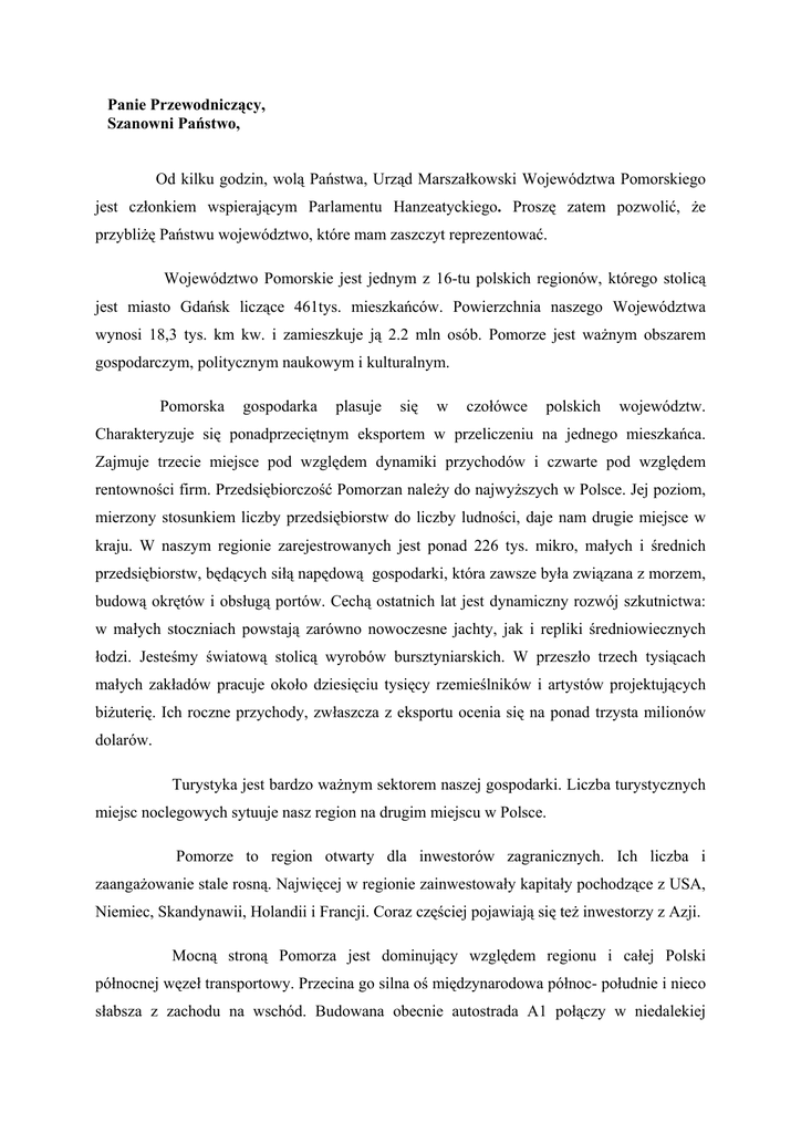 Panie Przewodniczący, Szanowni Państwo, Od kilku godzin, wolą Państwa, Urząd Marszałkowski Województwa Pomorskiego jest członkiem wspierającym Parlamentu Hanzeatyckiego. Proszę zatem pozwolić, że przybliżę Państwu województwo, które mam zaszczyt reprezentować. Województwo Pomorskie jest jednym z 16-tu polskich regionów, którego stolicą jest miasto Gdańsk liczące 461tys. mieszkańców. Powierzchnia naszego Województwa wynosi 18,3 tys. km kw. i zamieszkuje ją 2.2 mln osób. Pomorze jest ważnym obszarem gospodarczym, politycznym naukowym i kulturalnym. Pomorska gospodarka plasuje się w czołówce polskich województw. Charakteryzuje się ponadprzeciętnym eksportem w przeliczeniu na jednego mieszkańca. Zajmuje trzecie miejsce pod względem dynamiki przychodów i czwarte pod względem rentowności firm. Przedsiębiorczość Pomorzan należy do najwyższych w Polsce. Jej poziom, mierzony stosunkiem liczby przedsiębiorstw do liczby ludności, daje nam drugie miejsce w kraju. W naszym regionie zarejestrowanych jest ponad 226 tys. mikro, małych i średnich przedsiębiorstw, będących siłą napędową gospodarki, która zawsze była związana z morzem, budową okrętów i obsługą portów. Cechą ostatnich lat jest dynamiczny rozwój szkutnictwa: w małych stoczniach powstają zarówno nowoczesne jachty, jak i repliki średniowiecznych łodzi. Jesteśmy światową stolicą wyrobów bursztyniarskich. W przeszło trzech tysiącach małych zakładów pracuje około dziesięciu tysięcy rzemieślników i artystów projektujących biżuterię. Ich roczne przychody, zwłaszcza z eksportu ocenia się na ponad trzysta milionów dolarów. Turystyka jest bardzo ważnym sektorem naszej gospodarki. Liczba turystycznych miejsc noclegowych sytuuje nasz region na drugim miejscu w Polsce. Pomorze to region otwarty dla inwestorów zagranicznych. Ich liczba i zaangażowanie stale rosną. Najwięcej w regionie zainwestowały kapitały pochodzące z USA, Niemiec, Skandynawii, Holandii i Francji. Coraz częściej pojawiają się też inwestorzy z Azji. Mocną stroną Pomorza jest dominujący względem regionu i całej Polski północnej węzeł transportowy. Przecina go silna oś międzynarodowa północ- południe i nieco słabsza z zachodu na wschód. Budowana obecnie autostrada A1 połączy w niedalekiej przyszłości Pomorze z południem Polski i Europy. Autostrada A1 to zarazem odcinek najkrótszej magistrali ze Skandynawii na południe naszego kontynentu i dalej. Ruch graniczny odbywa się przez 8 przejść morskich. Rozbudowywany międzynarodowy Port Lotniczy im. Lecha Wałęsy może obsłużyć największe samoloty. Liczba stałych połączeń krajowych i międzynarodowych wzrasta rocznie o kilkadziesiąt procent. Modernizowane są drogi i linie kolejowe. W województwie pomorskim funkcjonują dwa parki naukowo-technologiczne i dwie specjalne strefy ekonomiczne. Na obrzeżach Gdańska powstaje mała „Dolina Krzemowa”. W naszym regionie działa 8 procent wszystkich polskich firm informatycznych, produkujących 18% oprogramowania. W Gdańsku zapoczątkowane zostały przemiany, które zmieniły oblicze Polski i Europy. Dumni jesteśmy z tego, że tablice z postulatami „Solidarności” zostały umieszczone przez UNESCO na liście najważniejszych dokumentów w dziejach ludzkości. Pamięć i przesłanie „Solidarności” zobowiązuje nas do działań na rzecz pomyślności regionu i kraju, na rzecz zjednoczonej Europy oraz lepszego, bezpiecznego świata. O Pomorzanach mówi się, że są otwarci i gościnni, wolni i niezależni. Od siebie możemy dodać, że jesteśmy otwarci na współpracę i kontakty z innymi ludźmi. Region nasz zawsze był silnie związany z morzem i otwarty na świat. Tysiącletni Gdańsk to historyczna stolica Pomorza i miejsce spotkań wielu kultur. Bogate hanzeatyckie miasto było w XVII wieku największym miastem Rzeczpospolitej i perłą europejskiej architektury. Dotyczyło to także pozostałych miast hanzeatyckich, które udowodniły, że współpraca może przynieść korzyści wszystkim zaangażowanym w nią partnerom. Dzisiaj podejmujemy próby powrotu do sprawdzonego wzorca współpracy, szukając w krajach leżących nad Morzem Bałtyckim partnerów do budowania przewagi konkurencyjnej, zapewniającej wzrost zamożności oraz poziomu życia zamieszkującej nasze Kraje ludności. Działania te są zgodne z polityką Unii Europejskiej, której celem jest uczynienie Europy najbardziej dynamicznym i konkurencyjnym regionem gospodarczym na świecie, rozwijającym się szybciej niż Stany Zjednoczone Ameryki. Przyjętą 7 lat temu w Lizbonie strategię oparto na zasadzie, że gospodarka krajów europejskich wykorzysta do maksimum innowacyjność opartą na szeroko zakrojonych badaniach naukowych, szczególnie w nowoczesnych dziedzinach wiedzy. Niestety, cel ten nie jest przez nas osiągany. W 2004 roku specjalny zespół sporządził raport podsumowujący efekty realizacji strategii. W ocenie zespołu „od czasu szczytu lizbońskiego Unia Europejska pozostała jeszcze bardziej w tyle za Stanami Zjednoczonymi”. Państwa UE uznają jednak, że tylko wiedza może przyczynić się do wzrostu gospodarczego. Pomorzanie uczą się, studiują i dokształcają. Co roku wzrasta liczba absolwentów szkół wyższych. W roku akademickim 2005/2006 prawie 19 tys. osób ukończyło studia na Pomorzu. Wykształcenie wyższe posiada 200 tysięcy naszych mieszkańców. Stanowi to 11,3 % ludności w wieku powyżej piętnastu lat, tj. więcej niż wynosi średnia krajowa w Polsce. Wyższy od krajowego jest także odsetek osób z wykształceniem średnim i policealnym. W regionie pomorskim znajduje się 28 szkół wyższych i osiem filii zewnętrznych uczelni. Mamy więc na Pomorzu silne środowisko akademickie oraz mocną gospodarkę opartą głównie na małych i średnich przedsiębiorstwach. Problemem jest jednak zbyt słabe powiązanie nauki z gospodark