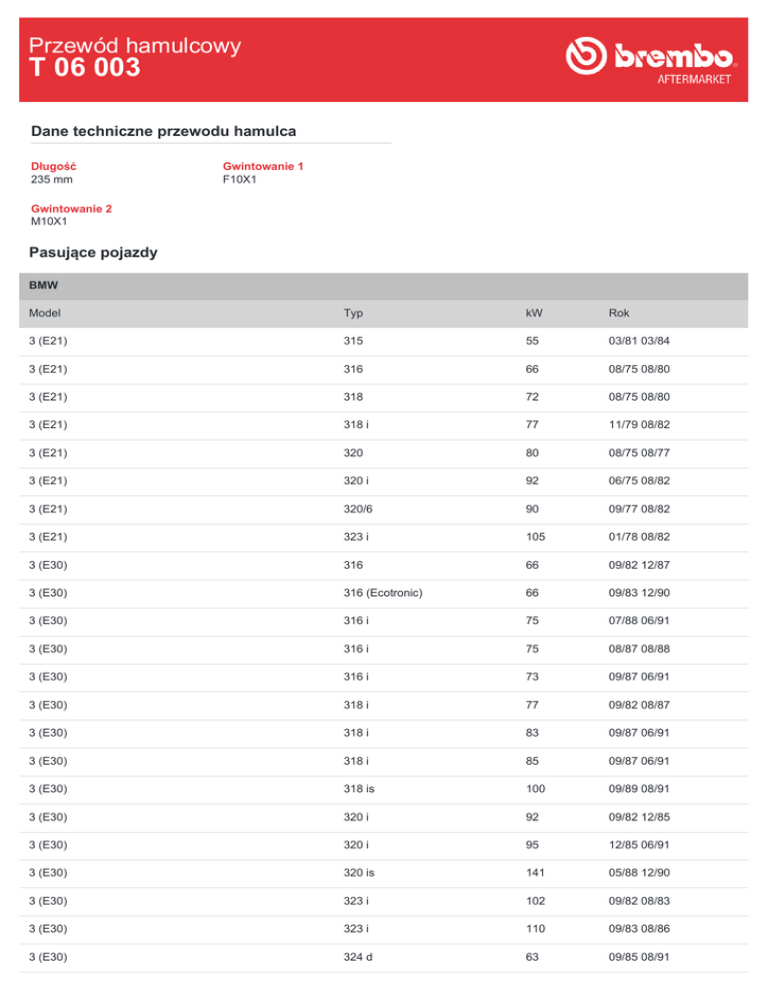 Przewód hamulcowy T 06 003 Dane techniczne przewodu hamulca Długość 235 mm Gwintowanie 1 F10X1 Gwintowanie 2 M10X1 Pasujące pojazdy BMW Model Typ kW Rok 3 (E21) 315 55 03/81 03/84 3 (E21) 316 66 08/75 08/80 3 (E21) 318 72 08/75 08/80 3 (E21) 318 i 77 11/79 08/82 3 (E21) 320 80 08/75 08/77 3 (E21) 320 i 92 06/75 08/82 3 (E21) 320/6 90 09/77 08/82 3 (E21) 323 i 105 01/78 08/82 3 (E30) 316 66 09/82 12/87 3 (E30) 316 (Ecotronic) 66 09/83 12/90 3 (E30) 316 i 75 07/88 06/91 3 (E30) 316 i 75 08/87 08/88 3 (E30) 316 i 73 09/87 06/91 3 (E30) 318 i 77 09/82 08/87 3 (E30) 318 i 83 09/87 06/91 3 (E30) 318 i 85 09/87 06/91 3 (E30) 318 is 100 09/89 08/91 3 (E30) 320 i 92 09/82 12/85 3 (E30) 320 i 95 12/85 06/91 3 (E30) 320 is 141 05/88 12/90 3 (E30) 323 i 102 09/82 08/83 3 (E30) 323 i 110 09/83 08/86 3 (E30) 324 d 63 09/85 08/91 3 (E30) 324 td 85 09/87 08/91 3 (E30) 325 e 2.7 95 01/85 08/87 3 (E30) 325 e 2.7 90 10/83 12/88 3 (E30) 325 i 126 09/83 11/89 3 (E30) 325 i 125 12/86 06/91 3 (E30) 325 i X 126 03/86 12/87 3 (E30) 325 i X 125 12/86 08/91 3 (E30) M3 2.3 147 02/87 05/89 3 (E30) M3 2.3 158 06/89 06/91 3 (E30) M3 2.3 143 07/86 06/91 3 (E30) M3 EVO I 2.3 162 10/88 10/90 3 (E30) M3 EVO II 2.5 175 01/90 01/92 3 (E36) 316 i 75 07/93 02/98 3 (E36) 316 i 73 09/90 09/93 3 (E36) 316 i 75 09/90 09/93 3 (E36) 323 i 2.5 125 03/95 02/98 3 (E36) 325 i 141 09/90 09/95 3 (E36) 325 td 85 09/91 02/98 3 (E36) 325 tds 105 05/93 02/98 3 (E36) 328 i 142 01/95 02/98 3 Compact (E36) 316 g 75 03/94 08/00 3 Compact (E36) 316 i 75 03/94 08/00 3 Compact (E36) 316 i 77 12/98 08/00 3 Compact (E36) 318 tds 66 01/95 08/00 3 Compact (E36) 318 ti 103 07/95 08/00 3 Compact (E36) 318 ti 103 11/94 08/95 3 Compact (E36) 323 ti 125 08/97 08/00 3 Convertible (E30) 318 i 83 09/90 10/93 3 Convertible (E30) 320 i 95 04/86 10/93 3 Convertible (E30) 325 i 125 09/87 10/93 3 Convertible (E30) 325 i 126 12/85 12/87 3 Convertible (E36) 320 i 110 12/93 04/99 3 Convertible (E36) 325 i 141 03/93 03/95 3 Convertible (E36) 328 i 142 03/95 04/99 3 Coupe (E36) 320 i 110 03/92 04/99 3 Coupe (E36) 323 i 125 03/95 04/99 3 Coupe (E36) 325 i 141 03/92 04/99 3 Coupe (E36) 328 i 142 01/95 04/99 3 Touring (E30) 316 i 73 09/91 06/94 3 Touring (E30) 316 i 75 09/91 06/94 3 Touring (E30) 318 i 83 04/89 06/94 3 Touring (E30) 318 i 85 09/87 06/91 3 Touring (E30) 320 i 95 01/88 12/91 3 Touring (E30) 324 td 85 01/88 06/93 3 Touring (E30) 325 i 125 07/87 03/93 3 Touring (E30) 325 i X 125 06/88 10/93 3 Touring (E36) 316 i 75 01/96 10/99 3 Touring (E36) 318 i 85 07/95 10/99 3 Touring (E36) 318 tds 66 01/95 10/99 3 Touring (E36) 320 i 110 01/95 10/99 3 Touring (E36) 323 i 125 09/95 10/99 3 Touring (E36) 325 tds 105 01/95 10/99 3 Touring (E36) 328 i 142 01/95 10/99 5 (E28) 518 66 06/81 08/84 5 (E28) 518 i 77 05/81 12/87 5 (E28) 520 i 92 06/81 12/87 5 (E28) 520 i 95 08/85 12/87 5 (E28) 520 i 110 12/86 12/87 5 (E28) 524 d 63 03/86 12/87 5 (E28) 524 td 85 09/83 12/87 5 (E28) 525 e 90 09/81 12/87 5 (E28) 525 e 95 12/84 12/87 5 (E28) 525 i 110 06/81 12/87 5 (E28) 528 i 135 06/81 12/87 5 (E28) 535 i, M 535 i 136 01/85 12/87 5 (E28) 535 i, M 535 i 160 01/85 12/87 5 (E28) M5 211 08/85 12/87 5 (E34) 518 i 83 08/89 09/95 5 (E34) 518 i 85 08/89 09/95 5 (E34) 520 i 95 01/88 08/91 5 (E34) 520 i 24V 110 09/89 09/95 5 (E34) 524 td 85 03/88 09/95 5 (E34) 525 i 125 01/88 08/91 5 (E34) 525 i 24V 141 09/89 09/95 5 (E34) 525 iX 24V 141 10/91 09/95 5 (E34) 525 td 85 04/93 09/95 5 (E34) 525 tds 105 09/91 09/95 5 (E34) 530 i 138 01/88 08/91 5 (E34) 530 i V8 160 09/92 09/95 5 (E34) 535 i 155 01/88 09/95 5 (E34) 540 i V8 210 09/92 09/95 5 (E34) M5 250 03/92 09/95 5 (E34) M5 232 10/88 05/92 5 (E34) M5 210 12/87 12/88 5 (E34) M5 CAT 232 10/88 05/92 5 Touring (E34) 518 g 85 11/95 06/96 5 Touring (E34) 518 i 83 03/93 09/94 5 Touring (E34) 518 i 85 09/94 01/97 5 Touring (E34) 520 i 110 11/91 01/97 5 Touring (E34) 525 i 141 11/91 01/97 5 Touring (E34) 525 ix 141 02/92 01/97 5 Touring (E34) 525 td 85 03/93 01/97 5 Touring (E34) 525 tds 105 12/91 01/97 5 Touring (E34) 530 i V8 160 09/92 01/97 5 Touring (E34) 540 i 210 09/93 01/97 5 Touring (E34) M5 250 09/94 01/97 6 (E24) 628 CSi 135 09/79 08/87 6 (E24) 635 CSi 160 06/78 08/88 6 (E24) 635 CSi 155 08/87 04/89 6 (E24) 635 CSi 136 12/77 04/89 6 (E24) 635 CSi 141 12/77 04/89 6 (E24) M 635 CSi 210 04/84 12/88 6 (E24) M 635 CSi 191 04/86 02/89 7 (E23) 728 i 135 07/78 08/86 7 (E23) 732 i 145 09/79 08/86 7 (E23) 735 i 136 01/85 08/86 7 (E23) 735 i 160 09/79 08/86 7 (E32) 730 i,iL 138 12/86 09/94 7 (E32) 730 i,iL 145 12/86 09/94 7 (E32) 730 i,iL V8 160 04/92 09/94 7 (E32) 735 i,iL 155 09/86 09/92 7 (E32) 735 i,iL 162 09/86 12/87 7 (E32) 740 i,iL V8 210 04/92 09/94 7 (E32) 750 i,iL V12 220 09/87 09/94 8 (E31) 840 Ci 210 01/96 12/99 8 (E31) 840 i 210 02/93 02/96 8 (E31) 850 Ci 240 09/94 12/99 8 (E31) 850 i,Ci 220 04/90 10/94 Z1 2.5 125 06/88 06/91 Z3 (E36) 1.8 i 85 10/95 10/98 Z3 (E36) 1.9 i 85 01/99 01/03 Z3 (E36) 1.9 i 87 07/98 01/03 Z3 (E36) 1.9 i 103 10/95 03/99 Z3 (E36) 2.0 i 110 04/99 01/03 Z3 (E36) 2.2 i 125 08/00 01/03 Z3 (E36) 2.8 i 141 04/97 06/00 Z3 (E36) 3.0 i 170 06/00 01/03 Z3 Coupe (E36) 2.8 i 141 07/97 06/00 Z3 Coupe (E36) 3.0 i 170 06/00 06/03 Numery OE Pasujące kody OE AUDI 803611775 BMW 34321108134 BMW 34321115697 BMW 34321153107 BMW 34321159881 BMW 34324051524 STEYR 7001360052