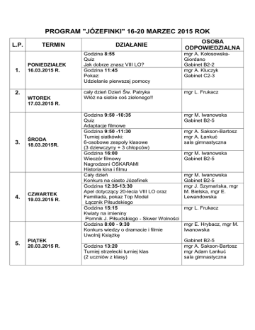 PROGRAM "JÓZEFINKI" 16-20 MARZEC 2015 ROK L.P. 1. TERMIN PONIEDZIAŁEK 16.03.2015 R. 2. WTOREK 17.03.2015 R. 3. 4. 5. ŚRODA 18.03.2015R. CZWARTEK 19.03.2015 R. PIĄTEK 20.03.2015 R. DZIAŁANIE OSOBA ODPOWIEDZIALNA Godzina 8:55 Quiz Jak dobrze znasz VIII LO? Godzina 11:45 Pokaz: Udzielanie pierwszej pomocy mgr A. KołosowskaGiordano Gabinet B2-2 mgr A. Kluczyk Gabinet C2-3 cały dzień Dzień Św. Patryka Włóż na siebie coś zielonego!! mgr L. Frukacz Godzina 9:50 -10:35 Quiz Adaptacje filmowe Godzina 9:50 -11:30 Turniej siatkówki: 6-osobowe zespoły klasowe (3 dziewczyny + 3 chłopców) Godzina 16:00 Wieczór filmowy Nagrodzeni OSKARAMI Historia kina i filmu Cały dzień Konkurs na ciasto Józefinek Godzina 12:35-13:30 Apel dotyczący 20-lecia VIII LO oraz Familiada, pokaz Top Model Łącznik Piłsudskiego Godzina 15:15 Kwiaty na imieniny Pomnik J. Piłsudskiego - Skwer Wolności Godzina 8:00 - 9:30 Konkurs wiedzy o dramacie i filmie Uwolnij Książkę mgr M. Iwanowska Gabinet B2-5 Godzina 13:20 Turniej strzelecki turniej klas (2 uczniów z klasy) mgr A. Sakson-Bartosz mgr A. Łankuć sala gimnastyczna mgr M. Iwanowska Gabinet B2-5 mgr M. Iwanowska Gabinet B2-5 mgr J. Szymańska, mgr M. Bielska, mgr E. Lewandowska mgr L. Frukacz mgr E. Hrybacz, mgr M. Iwanowska Gabinet B2-5 mgr A. Sakson-Bartosz mgr Adam Łankuć sala gimnastyczna