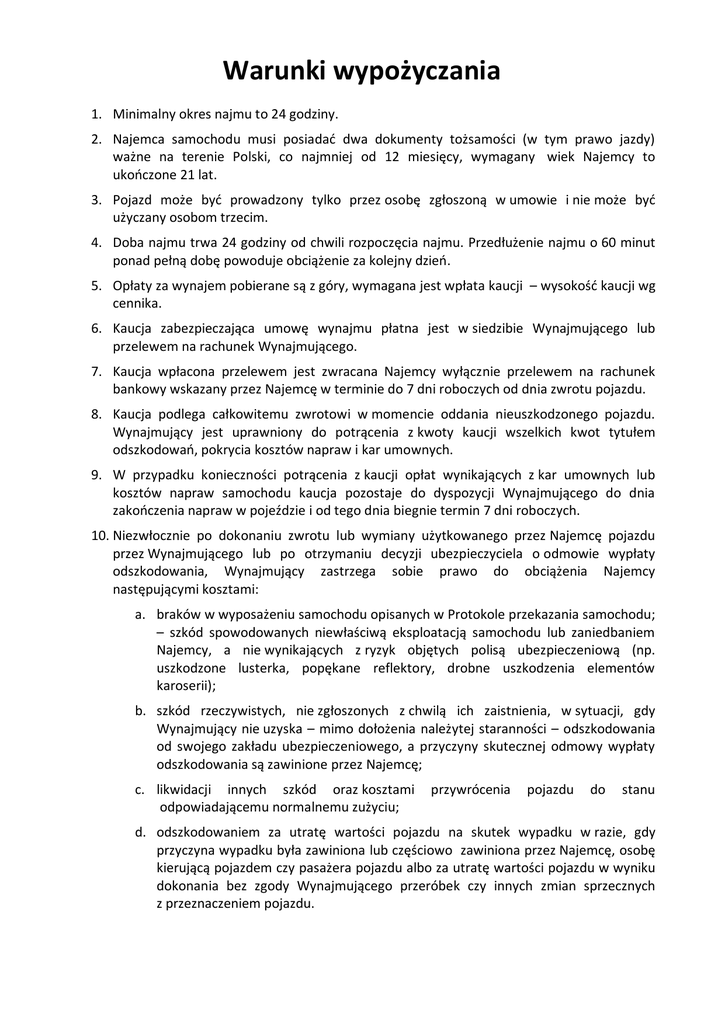 Warunki wypożyczania 1. Minimalny okres najmu to 24 godziny. 2. Najemca samochodu musi posiadać dwa dokumenty tożsamości (w tym prawo jazdy) ważne na terenie Polski, co najmniej od 12 miesięcy, wymagany wiek Najemcy to ukończone 21 lat. 3. Pojazd może być prowadzony tylko przez osobę zgłoszoną w umowie i nie może być użyczany osobom trzecim. 4. Doba najmu trwa 24 godziny od chwili rozpoczęcia najmu. Przedłużenie najmu o 60 minut ponad pełną dobę powoduje obciążenie za kolejny dzień. 5. Opłaty za wynajem pobierane są z góry, wymagana jest wpłata kaucji – wysokość kaucji wg cennika. 6. Kaucja zabezpieczająca umowę wynajmu płatna jest w siedzibie Wynajmującego lub przelewem na rachunek Wynajmującego. 7. Kaucja wpłacona przelewem jest zwracana Najemcy wyłącznie przelewem na rachunek bankowy wskazany przez Najemcę w terminie do 7 dni roboczych od dnia zwrotu pojazdu. 8. Kaucja podlega całkowitemu zwrotowi w momencie oddania nieuszkodzonego pojazdu. Wynajmujący jest uprawniony do potrącenia z kwoty kaucji wszelkich kwot tytułem odszkodowań, pokrycia kosztów napraw i kar umownych. 9. W przypadku konieczności potrącenia z kaucji opłat wynikających z kar umownych lub kosztów napraw samochodu kaucja pozostaje do dyspozycji Wynajmującego do dnia zakończenia napraw w pojeździe i od tego dnia biegnie termin 7 dni roboczych. 10. Niezwłocznie po dokonaniu zwrotu lub wymiany użytkowanego przez Najemcę pojazdu przez Wynajmującego lub po otrzymaniu decyzji ubezpieczyciela o odmowie wypłaty odszkodowania, Wynajmujący zastrzega sobie prawo do obciążenia Najemcy następującymi kosztami: a. braków w wyposażeniu samochodu opisanych w Protokole przekazania samochodu; – szkód spowodowanych niewłaściwą eksploatacją samochodu lub zaniedbaniem Najemcy, a nie wynikających z ryzyk objętych polisą ubezpieczeniową (np. uszkodzone lusterka, popękane reflektory, drobne uszkodzenia elementów karoserii); b. szkód rzeczywistych, nie zgłoszonych z chwilą ich zaistnienia, w sytuacji, gdy Wynajmujący nie uzyska – mimo dołożenia należytej staranności – odszkodowania od swojego zakładu ubezpieczeniowego, a przyczyny skutecznej odmowy wypłaty odszkodowania są zawinione przez Najemcę; c. likwidacji innych szkód oraz kosztami odpowiadającemu normalnemu zużyciu; przywrócenia pojazdu do stanu d. odszkodowaniem za utratę wartości pojazdu na skutek wypadku w razie, gdy przyczyna wypadku była zawiniona lub częściowo zawiniona przez Najemcę, osobę kierującą pojazdem czy pasażera pojazdu albo za utratę wartości pojazdu w wyniku dokonania bez zgody Wynajmującego przeróbek czy innych zmian sprzecznych z przeznaczeniem pojazdu. 11. W cenę wynajmu wliczone jest ubezpieczenie OC i AC. Ubezpieczenie AC nie dotyczy: uszkodzeń szyb, opon, kół, tapicerki , aktów wandalizmu oraz umyślnego uszkodzenia pojazdu tj.; a. Uszkodzenia podczas prowadzenia w stanie nietrzeźwym, po użyciu narkotyków lub środków psychotropowych oraz/lub bez ważnego prawa jazdy; b. Uszkodzenia pojazdu w razie przekroczenia dopuszczalnej prędkości o co najmniej 30 km/godz. albo też w razie dopuszczenia się innego rażącego naruszenia przepisów ruchu drogowego (Ubezpieczyciel zastrzega wówczas udział własny ubezpieczonego lub dochodzi do całkowitego wyłączenia odpowiedzialności ubezpieczyciela za szkodę); c. Przypadku, gdy kierowca zbiegł z miejsca wypadku; d. Szkody powstałej, gdy osobą kierującą była przez Wynajmującego do prowadzenia samochodu; osoba nieupoważniona e. Szkody całkowitej, rozliczanej w ciężar polisy Auto Casco oraz kradzieży samochodu Najemca zostanie obciążony opłatą w związku ze zdarzeniem w wysokości pobranej kaucji lecz nie mniej niż 1000 PLN; f. Wszystkich szkód częściowych objętych polisą AC Najemca zostanie obciążony opłatą w związku ze zdarzeniem w wysokości równowartości pobranej kaucji; g. Wszystkich szkód częściowych nie objętych polisą AC (Najemca zostanie obciążony opłatą w związku ze zdarzeniem w wysokości 1000 PLN); h. Wszystkich szkód częściowych objętych polisą OC Najemca zostanie obciążony opłatą w związku ze zdarzeniem w wysokości 500 PLN; i. Kradzieży samochodu, w wyniku, której zginęły kluczyki lub/i dowód rejestracyjny skradzionego samochodu całkowity koszt ponosi Najemca; j. Włamania, w wyniku, którego skradziono radio wraz z panelem całkowity koszt ponosi Najemca; – Odmowy wypłaty odszkodowania przez firmę ubezpieczeniową; k. W przypadku zagubienia dokumentów zostanie naliczona opłata 500 zł. brutto, a w przypadku zgubienia kluczyków obciążenie zostanie naliczone wg aktualnej ceny nowego kluczyka; l. Wynajmujący oświadcza, że samochód jest w dobrym stanie technicznym, oraz posiada niezbędne dokumenty. 12. Samochód zostaje przekazany Najmującemu z pełnym zbiornikiem paliwa i z taką samą zawartością powinien być zwrócony Wynajmującemu, w przypadku zwrotu z niepełnym zbiornikiem Najmujący zostanie obciążony kosztami brakującego paliwa. 13. W czasie wynajmu Najemca zobowiązany jest do regularnego wykonywania własnym kosztem i staraniem sprawdzania i uzupełniania stanu oleju w silniku ( zapas oleju w ilości 1l. znajduje się w samochodzie) , płynu chłodniczego, ciśnienia w ogumieniu, działania świateł sygnalizacyjnych, mijania i drogowych. 14. W przypadku zwrotu pojazdu przed zakończeniem ważności umowy kwota pobrana za wynajem nie podlega zwrotowi. 15. Użytkownik zobowiązuje się zwrócić pojazd nieuszkodzony, z kompletnym wyposażeniem i z dokumentami w miejscu, gdzie samochód pobrał lub w innym, uzgodnionym najpóźniej w dniu zakończenia umowy. 16. Najemca jest odpowiedzialny za wszelkie przestępstwa, które miały miejsce w trakcie trwania najmu, a które powiązane są z użytkowaniem wynajętego pojazdu, ponieważ Najemca był posiadaczem pojazdu. 17. W przypadku wypadku drogowego, Najem