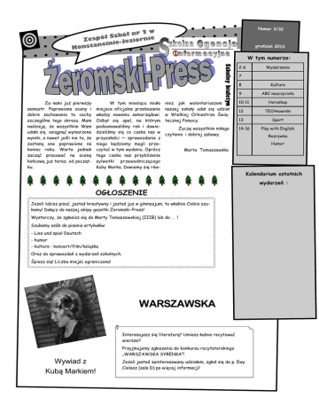 Numer 3/32 nr 2 w Szkół ł ó p s e rnie Z e-Jezio i n i c n Konsta grudzień 2010 W tym numerze: W tym miesiącu miało miejsce oficjalne przekazanie władzy nowemu samorządowi. Odbył się apel, na którym podsumowaliśmy rok i dowiedzieliśmy się co czeka nas w przyszłości — sprawozdanie z niego będziemy mogli przeczytać w tym wydaniu. Oprócz tego czeka nas przybliżenie sylwetki przewodniczącego Kuby Marka. Dowiemy się rów- Szkolny biuletyn Za nami już pierwszy semestr. Poprawione oceny i dobre zachowania to cechy szczególne tego okresu. Mam nadzieję, że wszystkim Wam udało się osiągnąć wymarzone wyniki, a nawet jeśli nie to, że zostaną one poprawione na koniec roku. Warto jednak zacząć pracować na ocenę końcową już teraz, od początku. 2-6 Wydarzenia 7 8 Kultura 9 ABC nauczyciela nież jak wolontariuszom z naszej szkoły udał się udział w Wielkiej Orkiestrze Świątecznej Pomocy. 10-11 Życzę wszystkim miłego czytania i dobrej zabawy. 14-16 Horoskop 12 TECHnowinki 13 Sport Play with English Rozrywka Humor Marta Tomaszewska Kalendarium ostatnich wydarzeń : OGŁOSZENIE Jeżeli lubisz pisać, jesteś kreatywny i jesteś już w gimnazjum, to właśnie Ciebie szukamy! Dołącz do naszej ekipy gazetki Żeromski-Press! Wystarczy, że zgłosisz się do Marty Tomaszewskiej (IIIB) lub do … ! Szukamy osób do pisania artykułów: - Lies und spiel Deutsch - humor - kultura : koncert/film/książka Oraz do sprawozdań z wydarzeń szkolnych. Śpiesz się! Liczba miejsc ograniczona! WARSZAWSKA Interesujesz się literaturą? Umiesz ładnie recytować wiersze? Przyjmujemy zgłoszenia do konkursu recytatorskiego „WARSZAWSKA SYRENKA‖! Wywiad z Kubą Markiem! Jeżeli jesteś zainteresowany udziałem, zgłoś się do p. Ewy Cielesz (sala D) po więcej informacji! CO SŁYCHAĆ W SZKOLE? 07.01 - Konkurs ,,Olimpusek'' dla klas I-III 12.01 - Przekazanie władzy nowemu Samorządowi Uczniowskiemu 12.01 - Wycieczka klas I do Zamku Królewskiego 13.01 - Bal karnawałowy klas 0-III 14.01 - Dyskoteka karnawałowa dla gimnazjum 19.01 - Spotkanie autorskie z Wandą Chotomską dla klas I-III 27.01 - Wycieczka klas I do teatru ,,Guliwer" 04.02 - Dyskoteka walentynkowa dla gimnazjum 14.02 - 27.02 - FERIE ZIMOWE 12 stycznia w naszej szkole odbył się apel z okazji przekazania władzy nowemu samorządowi. Na małej sali zebrali się wszyscy uczniowie gimnazjum, aby zapoznać się z przeszłością starego samorządu oraz planami nowego. Karol Kras, jako były przewodniczący, przygotował dla wszystkich zgromadzonych prezentację multimedialną mówiącą w skrócie o wzlotach i upadkach dawnego samorządu. Przedstawione zostały imprezy, które z pomocą wybranej grupy uczniów możemy wspólnie wspominać. Oczywiście w prezentacji znalazły się również plany, których niestety nie udało się zrealizować. Następnie zostali przedstawieni, a później nagrodzeni gromkimi brawami, byli przewodniczący poszczególnych sekcji. Po przemówieniu Karola głos zabrał Jakub Marek, który pokieruje pracą swojej grupy w tym roku. Po przedstawieniu swoich zastępców, obecny przewodniczący wraz z innymi członkami samorządu przedstawił nowe pomysły i plany na ten rok. Moim zdaniem nowy samorząd sprawdzi się w swojej roli, między innymi dzięki dobrym pomysłom i potencjałowi, jakim wykazują się uczniowie. Trzymam za nich kciuki i życzę powodzenia! Str. 2 Ola Sioch Marta Tomaszewska Żeromski-Press Spotkanie autorskie z panią Wandą Chotomską 19 stycznia naszą szkołę odwiedziła Wielka Dama polskiej literatury dziecięcej i młodzieżowej, autorka wielu nagrodzonych utworów, pomysłodawczyni Dnia Dziadka i Orderu Uśmiechu pani Wanda Chotomska. Spotkanie z poetką zorganizowała i poprowadziła pani Żaneta Misiak. W „Wielkiej uczcie poetyckiej‖ wzięły udział dzieci z klas I-III szkoły podstawowej. Spotkanie zaczęło się od „Przystawki‖, czyli recytacji wierszy autorki przez uczniów. Dzieci starannie przygotowały się do spotkania. Sama autorka była zachwycona tym, że jej wiersze znają kolejne pokolenia Polaków. Następnie nadszedł czas na „Danie dnia‖, w którym poetka pięknie recytowała swoje wiersze. Pomagały jej w tym dzieci, prezentując ilustracje z jej książek lub naśladując postacie, o których pani Chotomska opowiadała. Po obfitym w literaturę „Daniu dnia‖, zaczął się trzeci punkt programu „Dodatki‖, czyli czas, w którym dzieci mogły zadawać pytania pisarce. Po interesujących odpowiedziach na wiele ciekawych pytań, nadszedł czas na „Napoje‖, czyli autografy od gościa. Można było kupić książki poetki, po które (co na pewno nikogo nie dziwiło) ustawiła się spora kolejka. Uczniowie otrzymywali autografy z pięknymi dedykacjami. Gdy już wszyscy chętni otrzymali autografy (co zajęło bardzo dużo czasu), uczniowie ustawili się do wspólnego zdjęcia z panią Chotomską. Na sam koniec gość podsumował spotkanie pytaniem do widowni: „czy się podobało?‖. Usłyszał oczywiście głośną odpowiedź: „TAK!‖. Spotkanie autorskie z panią Wandą Chotomską uważam za udane. Dzieci mogły w formie zabawy wiele się dowiedzieć i zapoznać ze wspaniałymi dziełami autorki. Ten dzień bez wątpienia zostanie na długo w pamięci uczestników „Wielkiej uczty poetyckiej‖. Marcin Mirowski . Menu spotkania 1. Przystawka: recytacja utworów wielkiej poetki. 2. Danie dnia: spotkanie z panią Wandą Chotomską. 3. Dodatki: pytania do gościa. 4. Napoje: autografy od gościa. 5. Deser: wspólne zdjęcie z poetką. 9.01.2011 roku w kościele p.w. Wniebowzięcia Najświętszej Maryi Panny w Konstancinie, po mszy świętej o godzinie 12.30 odbyło się przedstawienie wystawione przez uczniów naszej szkoły pod kierownictwem pani Ewy Cielesz. Str. 3 Jasełka były nietypowe, ponieważ ich akcja rozgrywała się w supermarkecie. Główną myślą przedstawienia było zwrócenie uwagi na prawdzi