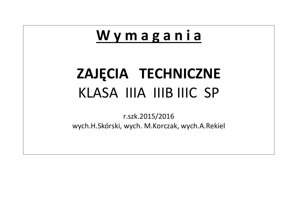 Wymagania ZAJĘCIA TECHNICZNE KLASA IIIA IIIB IIIC SP r.szk.2015/2016 wych.H.Skórski, wych. M.Korczak, wych.A.Rekiel ZAJĘCIA TECHNICZNE Edukacja Zakres umiejętności W zakresie znajomości środowiska technicznego Ocena 5 4 3 2 6 W zakresie realizacji drogi powstawania przedmiotów od pomysłu do wytworu 5 4 3 2 U cz e ń: Samodzielnie potrafi rozpoznać i udzielić bogatej informacji na temat wybranych urządzeń transportowych, wytwórczych, informatycznych i elektrycznych. Określa ich wartość z punktu widzenia cech użytkowych. Wymienia sposoby wykorzystania sił przyrody dawniej i dziś. Potrafi korzystać z podanej informacji technicznej. Wymienia podstawowe zasady stosowania urządzeń technicznych. Wymienia różne rodzaje budowli; potrafi montować modele papierowe i z tworzyw sztucznych według podanych instrukcji. Potrafi rozpoznać podstawowe maszyny i urządzenia wytwórcze; posługuje się urządzeniami zgodnie z ich przeznaczeniem; rozpoznaje różne rodzaje budowli (budynki mieszkalne, biurowe i przemysłowe) i urządzeń elektrycznych. Próbuje korzystać z prostej informacji technicznej. Potrafi wykorzystać wybrane urządzenia. Wymienia podstawowe rodzaje budowli. Rozpoznaje i nazywa niektóre urządzenia wytwórcze. Wykazuje małe zainteresowanie poznaniem i obsługą podstawowych urządzeń technicznych. W działaniach konstrukcyjnych potrzebuje pomocy nauczyciela. W podejmowaniu działań konstrukcyjnych prezentuje samodzielność organizacyjną i oryginalność. Z własnej inicjatywy gromadzi materiały i informacje dotyczące nauki i techniki; zawsze utrzymuje wzorowy porządek w swoim miejscu pracy. Samodzielnie dobiera odpowiednie narzędzia pracy i planuje kolejne czynności rozwiązań technicznych w obrębie realizowanego projektu. Prace konstrukcyjne wykonuje starannie i estetycznie. Zgodnie i odpowiedzialnie współpracuje w zespole. Potrafi ciąć papier, tekturę i wybrane tworzywa sztuczne; posługuje się narzędziami zgodnie z ich przeznaczeniem. Nie zawsze dba o utrzymanie porządku i bezpieczeństwa podczas pracy. Próbuje korzystać z prostej informacji technicznej, ale wytwory działalności odbiegają od projektu lub szablonu. Stara się dobrać materiały i narzędzia; Wykazuje małe zainteresowanie podejmowaniem działań konstrukcyjnych. Ma duże problemy w odmierzaniu, cięciu i montażu często oczekuje pomocy nauczyciela. Zazwyczaj nie utrzymuje porządku w swoim miejscu pracy. 6 W zakresie dbałości o bezpieczeńst wo własne i innych 5 4 3 2 Zawsze pamięta o bezpieczeństwie w trakcie posługiwania się narzędziami i urządzeniami. Zachowuje zasady i przestrzega instrukcji obsługi przy stosowaniu urządzeń technicznych. Odpowiedzialnie i bezpiecznie korzysta ze środków komunikacji Opowiada, jak należy zachować się w sytuacji wypadku. Zna zagrożenia wynikające z niewłaściwego używania narzędzi i urządzeń technicznych; przestrzega przepisy ruchu drogowego. Stosuje dodatkowe zabezpieczenia (odblaski); Opowiada, jak należy się zachować w sytuacji wypadku. Wymienia numery telefonów alarmowych i potrafi z nich skorzystać. Stara się dbać o bezpieczeństwo swoje i innych; zna 3 numery telefonów alarmowych i wymienia je ; stara się przestrzegać przepisów ruchu drogowego. Zapomina o przestrzeganiu przepisów drogowych oraz o stosowaniu dodatkowych zabezpieczeń; potrafi zachować się w środkach komunikacji miejskiej. Wymienia dwa numery telefonów alarmowych Nie orientuje się jak zachować się w sytuacji wypadku. Z pomocą nauczyciela wymienia jeden numer z telefonów alarmowych. Nie przestrzega instrukcji przy stosowaniu urządzeń technicznych. Rozpoczyna prace, lecz ich nie kończy. Nie utrzymuje ładu i porządku w miejscu pracy. Ma problemy z dbałością o bezpieczeństwo podczas pracy.