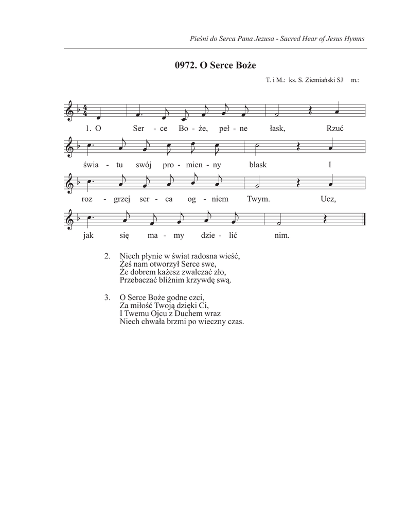 Pieśni do Serca Pana Jezusa - Sacred Hear of Jesus Hymns 0972. O Serce Boże T. i M.: ks. S. Ziemiański SJ m.: 1. O Ser - ce Bo - że, peł - ne łask, Rzuć świa - tu swój pro - mien - ny blask I roz - grzej ser - ca og - niem Twym. Ucz, jak się ma - my dzie - lić nim. 2. Niech płynie w świat radosna wieść, Żeś nam otworzył Serce swe, Że dobrem każesz zwalczać zło, Przebaczać bliźnim krzywdę swą. 3. O Serce Boże godne czci, Za miłość Twoją dzięki Ci, I Twemu Ojcu z Duchem wraz Niech chwała brzmi po wieczny czas.