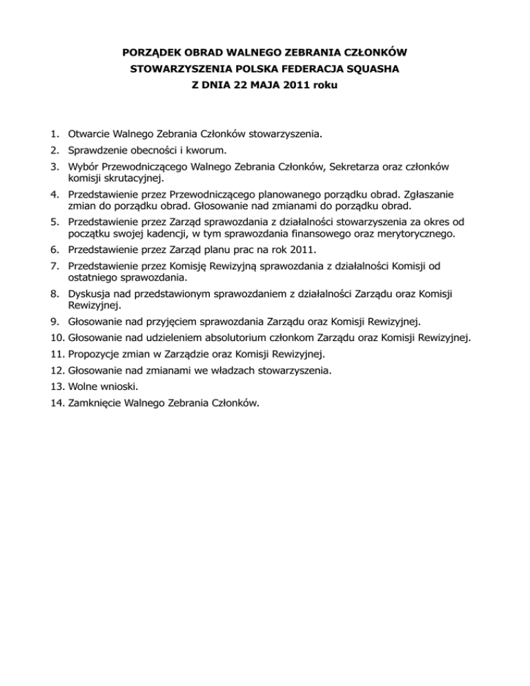PORZĄDEK OBRAD WALNEGO ZEBRANIA CZŁONKÓW STOWARZYSZENIA POLSKA FEDERACJA SQUASHA Z DNIA 22 MAJA 2011 roku 1. Otwarcie Walnego Zebrania Członków stowarzyszenia. 2. Sprawdzenie obecności i kworum. 3. Wybór Przewodniczącego Walnego Zebrania Członków, Sekretarza oraz członków komisji skrutacyjnej. 4. Przedstawienie przez Przewodniczącego planowanego porządku obrad. Zgłaszanie zmian do porządku obrad. Głosowanie nad zmianami do porządku obrad. 5. Przedstawienie przez Zarząd sprawozdania z działalności stowarzyszenia za okres od początku swojej kadencji, w tym sprawozdania finansowego oraz merytorycznego. 6. Przedstawienie przez Zarząd planu prac na rok 2011. 7. Przedstawienie przez Komisję Rewizyjną sprawozdania z działalności Komisji od ostatniego sprawozdania. 8. Dyskusja nad przedstawionym sprawozdaniem z działalności Zarządu oraz Komisji Rewizyjnej. 9. Głosowanie nad przyjęciem sprawozdania Zarządu oraz Komisji Rewizyjnej. 10. Głosowanie nad udzieleniem absolutorium członkom Zarządu oraz Komisji Rewizyjnej. 11. Propozycje zmian w Zarządzie oraz Komisji Rewizyjnej. 12. Głosowanie nad zmianami we władzach stowarzyszenia. 13. Wolne wnioski. 14. Zamknięcie Walnego Zebrania Członków.