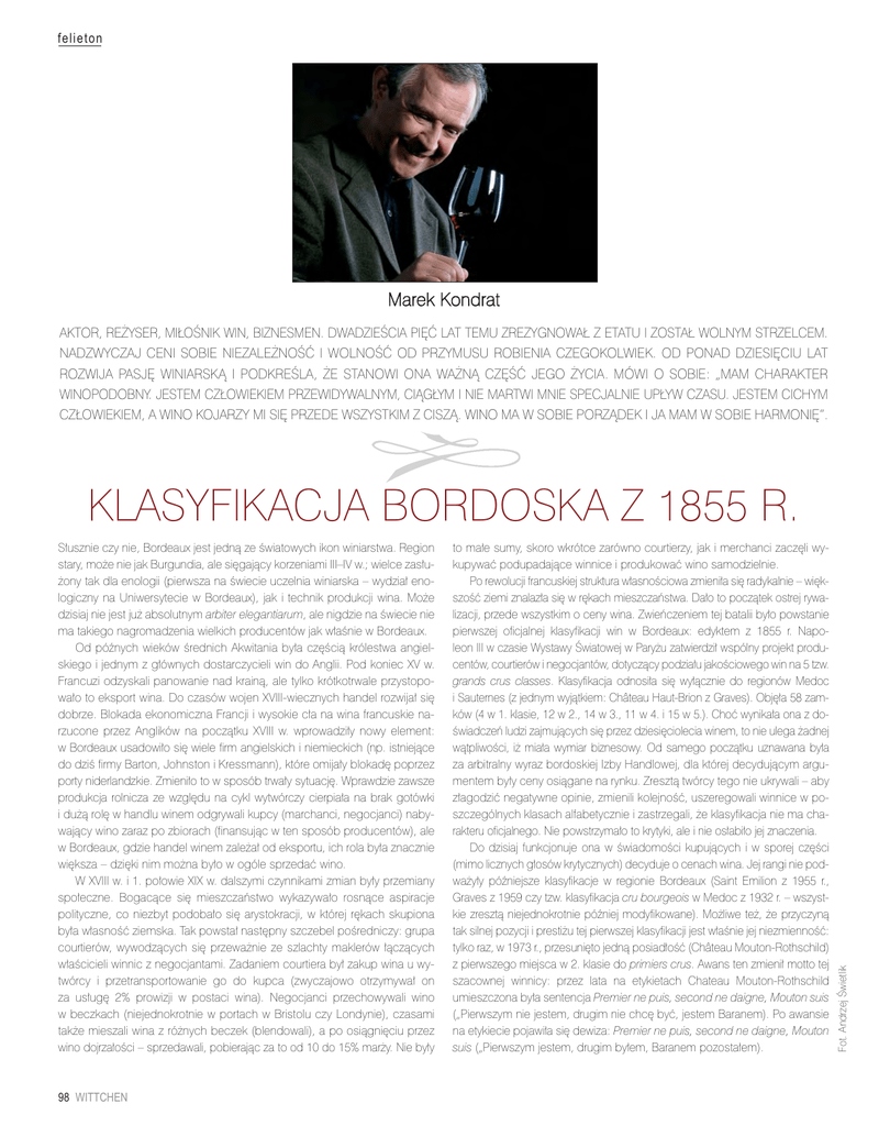 felieton Marek Kondrat AKTOR, REŻYSER, MIŁOŚNIK WIN, BIZNESMEN. DWADZIEŚCIA PIĘĆ LAT TEMU ZREZYGNOWAŁ Z ETATU I ZOSTAŁ WOLNYM STRZELCEM. NADZWYCZAJ CENI SOBIE NIEZALEŻNOŚĆ I WOLNOŚĆ OD PRZYMUSU ROBIENIA CZEGOKOLWIEK. OD PONAD DZIESIĘCIU LAT ROZWIJA PASJĘ WINIARSKĄ I PODKREŚLA, ŻE STANOWI ONA WAŻNĄ CZĘŚĆ JEGO ŻYCIA. MÓWI O SOBIE: „MAM CHARAKTER WINOPODOBNY. JESTEM CZŁOWIEKIEM PRZEWIDYWALNYM, CIĄGŁYM I NIE MARTWI MNIE SPECJALNIE UPŁYW CZASU. JESTEM CICHYM CZŁOWIEKIEM, A WINO KOJARZY MI SIĘ PRZEDE WSZYSTKIM Z CISZĄ. WINO MA W SOBIE PORZĄDEK I JA MAM W SOBIE HARMONIĘ”. Słusznie czy nie, Bordeaux jest jedną ze światowych ikon winiarstwa. Region stary, może nie jak Burgundia, ale sięgający korzeniami III–IV w.; wielce zasłużony tak dla enologii (pierwsza na świecie uczelnia winiarska – wydział enologiczny na Uniwersytecie w Bordeaux), jak i technik produkcji wina. Może dzisiaj nie jest już absolutnym arbiter elegantiarum, ale nigdzie na świecie nie ma takiego nagromadzenia wielkich producentów jak właśnie w Bordeaux. Od późnych wieków średnich Akwitania była częścią królestwa angielskiego i jednym z głównych dostarczycieli win do Anglii. Pod koniec XV w. Francuzi odzyskali panowanie nad krainą, ale tylko krótkotrwale przystopowało to eksport wina. Do czasów wojen XVIII-wiecznych handel rozwijał się dobrze. Blokada ekonomiczna Francji i wysokie cła na wina francuskie narzucone przez Anglików na początku XVIII w. wprowadziły nowy element: w Bordeaux usadowiło się wiele firm angielskich i niemieckich (np. istniejące do dziś firmy Barton, Johnston i Kressmann), które omijały blokadę poprzez porty niderlandzkie. Zmieniło to w sposób trwały sytuację. Wprawdzie zawsze produkcja rolnicza ze względu na cykl wytwórczy cierpiała na brak gotówki i dużą rolę w handlu winem odgrywali kupcy (marchanci, negocjanci) nabywający wino zaraz po zbiorach (finansując w ten sposób producentów), ale w Bordeaux, gdzie handel winem zależał od eksportu, ich rola była znacznie większa – dzięki nim można było w ogóle sprzedać wino. W XVIII w. i 1. połowie XIX w. dalszymi czynnikami zmian były przemiany społeczne. Bogacące się mieszczaństwo wykazywało rosnące aspiracje polityczne, co niezbyt podobało się arystokracji, w której rękach skupiona była własność ziemska. Tak powstał następny szczebel pośredniczy: grupa courtierów, wywodzących się przeważnie ze szlachty maklerów łączących właścicieli winnic z negocjantami. Zadaniem courtiera był zakup wina u wytwórcy i przetransportowanie go do kupca (zwyczajowo otrzymywał on za usługę 2% prowizji w postaci wina). Negocjanci przechowywali wino w beczkach (niejednokrotnie w portach w Bristolu czy Londynie), czasami także mieszali wina z różnych beczek (blendowali), a po osiągnięciu przez wino dojrzałości – sprzedawali, pobierając za to od 10 do 15% marży. Nie były 98 WITTCHEN to małe sumy, skoro wkrótce zarówno courtierzy, jak i merchanci zaczęli wykupywać podupadające winnice i produkować wino samodzielnie. Po rewolucji francuskiej struktura własnościowa zmieniła się radykalnie – większość ziemi znalazła się w rękach mieszczaństwa. Dało to początek ostrej rywalizacji, przede wszystkim o ceny wina. Zwieńczeniem tej batalii było powstanie pierwszej oficjalnej klasyfikacji win w Bordeaux: edyktem z 1855 r. Napoleon III w czasie Wystawy Światowej w Paryżu zatwierdził wspólny projekt producentów, courtierów i negocjantów, dotyczący podziału jakościowego win na 5 tzw. grands crus classes. Klasyfikacja odnosiła się wyłącznie do regionów Medoc i Sauternes (z jednym wyjątkiem: Château Haut-Brion z Graves). Objęła 58 zamków (4 w 1. klasie, 12 w 2., 14 w 3., 11 w 4. i 15 w 5.). Choć wynikała ona z doświadczeń ludzi zajmujących się przez dziesięciolecia winem, to nie ulega żadnej wątpliwości, iż miała wymiar biznesowy. Od samego początku uznawana była za arbitralny wyraz bordoskiej Izby Handlowej, dla której decydującym argumentem były ceny osiągane na rynku. Zresztą twórcy tego nie ukrywali – aby złagodzić negatywne opinie, zmienili kolejność, uszeregowali winnice w poszczególnych klasach alfabetycznie i zastrzegali, że klasyfikacja nie ma charakteru oficjalnego. Nie powstrzymało to krytyki, ale i nie osłabiło jej znaczenia. Do dzisiaj funkcjonuje ona w świadomości kupujących i w sporej części (mimo licznych głosów krytycznych) decyduje o cenach wina. Jej rangi nie podważyły późniejsze klasyfikacje w regionie Bordeaux (Saint Emilion z 1955 r., Graves z 1959 czy tzw. klasyfikacja cru bourgeois w Medoc z 1932 r. – wszystkie zresztą niejednokrotnie później modyfikowane). Możliwe też, że przyczyną tak silnej pozycji i prestiżu tej pierwszej klasyfikacji jest właśnie jej niezmienność: tylko raz, w 1973 r., przesunięto jedną posiadłość (Château Mouton-Rothschild) z pierwszego miejsca w 2. klasie do primiers crus. Awans ten zmienił motto tej szacownej winnicy: przez lata na etykietach Chateau Mouton-Rothschild umieszczona była sentencja Premier ne puis, second ne daigne, Mouton suis („Pierwszym nie jestem, drugim nie chcę być, jestem Baranem). Po awansie na etykiecie pojawiła się dewiza: Premier ne puis, second ne daigne, Mouton suis („Pierwszym jestem, drugim byłem, Baranem pozostałem). Fot. Andrzej Świetlik KLASYFIKACJA BORDOSKA Z 1855 R.