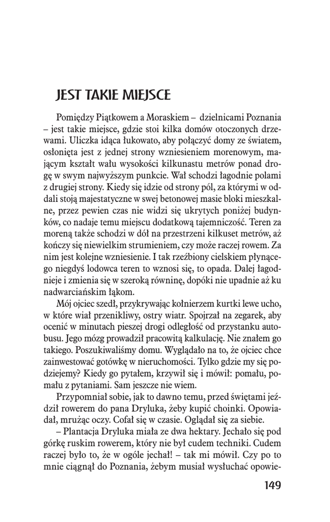 JEST TAKIE MIEJSCE Pomiędzy Piątkowem a Moraskiem – dzielnicami Poznania – jest takie miejsce, gdzie stoi kilka domów otoczonych drzewami. Uliczka idąca łukowato, aby połączyć domy ze światem, osłonięta jest z jednej strony wzniesieniem morenowym, mającym kształt wału wysokości kilkunastu metrów ponad drogę w swym najwyższym punkcie. Wał schodzi łagodnie polami z drugiej strony. Kiedy się idzie od strony pól, za którymi w oddali stoją majestatyczne w swej betonowej masie bloki mieszkalne, przez pewien czas nie widzi się ukrytych poniżej budynków, co nadaje temu miejscu dodatkową tajemniczość. Teren za moreną także schodzi w dół na przestrzeni kilkuset metrów, aż kończy się niewielkim strumieniem, czy może raczej rowem. Za nim jest kolejne wzniesienie. I tak rzeźbiony cielskiem płynącego niegdyś lodowca teren to wznosi się, to opada. Dalej łagodnieje i zmienia się w szeroką równinę, dopóki nie upadnie aż ku nadwarciańskim łąkom. Mój ojciec szedł, przykrywając kołnierzem kurtki lewe ucho, w które wiał przenikliwy, ostry wiatr. Spojrzał na zegarek, aby ocenić w minutach pieszej drogi odległość od przystanku autobusu. Jego mózg prowadził pracowitą kalkulację. Nie znałem go takiego. Poszukiwaliśmy domu. Wyglądało na to, że ojciec chce zainwestować gotówkę w nieruchomości. Tylko gdzie my się podziejemy? Kiedy go pytałem, krzywił się i mówił: pomału, pomału z pytaniami. Sam jeszcze nie wiem. Przypomniał sobie, jak to dawno temu, przed świętami jeździł rowerem do pana Dryluka, żeby kupić choinki. Opowiadał, mrużąc oczy. Cofał się w czasie. Oglądał się za siebie. – Plantacja Dryluka miała ze dwa hektary. Jechało się pod górkę ruskim rowerem, który nie był cudem techniki. Cudem raczej było to, że w ogóle jechał! – tak mi mówił. Czy po to mnie ciągnął do Poznania, żebym musiał wysłuchać opowie- 149 ści o jakimś Dryluku? W ogóle chodził i przeżywał. Ciągle coś widział, ciągle pokazywał jakieś nic nie znaczące szczegóły. – To choposzku… Musisz se wycionć, bo jo ni mom czasu. Jak se wytniesz, to przyndziesz i oddosz toporek. – Dobrze – tata wspominał swoje rozmowy z Drylukiem. – Ino nie tnij wysoko, przy samy zimi tnij. Uwożej i se girów nie uczaśnij! – ojciec mówił gwarą za Drylukiem, a mnie robiło się niedobrze. Podobała mi się tylko gadka góralska. – Dobrze. Będę uważał – kontynuował tata. Tamten chłopak, który teraz jest moim ojcem, do którego jestem podobno kropka w kropkę podobny, choć ja tego nie widzę zupełnie. – A co! – Sapcio zawył tryumfalnie – Lecą latka. Z chłopaka jest mężczyzna, a jego syn – czekałem, że powie: „pożal się Boże” – jest takim samym chłopakiem, jak on kiedyś, tyle, że lepiej ubranym – szepnął mi do ucha Sapcio. – Czas zatacza koła… – powiedział dawny chłopak, Marek Gabrych. Czas zatacza koła? Widać, że znał te pola. Ujeżdżał tu ruskim rowerem. – O, tam była droga wysadzana lipami… teraz nie ma drogi ani lip. Zapadał zmrok. Chudzielec, wysoki i trochę niezdarny w ruchach, wybrał trzydzieści lat temu tę choinkową miss i ściął ją tuż przy ziemi, jak mu pan Dryluk kazał. Obwiązał sznurkiem idącym spiralnie od dołu choinki ku górze, ku czubkowi. – Co tak długo? – pytał Dryluk. Jego głos grzmiał jak ze studni przeszłości, ojciec usiłował naśladować starego Dryluka. – Nie mogłem się zdecydować, miałem kilka na oku… – He, he to z dziewuchą to bym rozumioł. Co tyż twój ojciec, chopoku robi? – pewno mówi o moim dziadku. – A… chorował ostatnio trochę – kontynuował tata opowiadanie w dialogu rozłożonym na role. – Łon? – Jakieś kłopoty z korzonkami nerwowymi. Nie mógł chodzić. – A mówiełem mu! To bez tyn motór, jeżdżoł w samy koszuli, to tero mo. 150 – Ale to chyba dawno było? – Co się nagrzeszy za młodu, to po czasie wychodzi. Jymu akurat wyszło w krzyżu. Pozdrów go i powiedz, że na to najlepszy okład z chrzanu – mój tata w opowiadaniu zmienił się w chłopaka – Marka Gabrycha, dwadzieścia pięć, trzydzieści lat temu szukającego choinki. Wracał tą samą drogą, pchając rower z wielką, pewno trzymetrową choinkową pięknością. Zapłacił staremu Drylukowi monetą z żurawiami przelatującymi nad kolumną Zygmunta. A może monetą… z Kopernikiem? Teraz szliśmy razem i szukaliśmy najpiękniejszego domu na handel. Nie wiem, po co to tacie. Powiedział do mnie: – Chodź, Ryś, zabawimy się w handel nieruchomościami, pojedziesz ze mną do Poznania. Na kartce miał adres z numerem, ale chciał zobaczyć, czy ten najpiękniejszy dom to ten, który jest na sprzedaż. Ciągle szukał dodatkowych argumentów, aby nas przekonać do tego szalonego przedsięwzięcia, do tej radykalnej zmiany sposobu zarobkowania. Czemu nie szukał w Miechowie na wzgórzach… żeby zahandlować? Domy nie były żadną rewelacją. Niestety. Dziesięć minut do autobusu, Ale pola! Czyste powietrze! Przyroda, a i miasto blisko, więc… – jak mówił – duże możliwości. Kiedyś zapewne serce biło mu żywo, kiedy wyszukiwał swoją choinkę. Teraz chłodnym okiem lustrował uliczkę i domy. Musiał być czujny. Dom zawilgocony, – tłumaczył mi – dom o złym fundamencie, złej izolacji, ze złego budulca, byłby klęską. Nacisnął dzwonek. Rozległo się przeraźliwe ujadanie jakiegoś kundla przypominającego pekińczyka. Drzwi domu otwarły się i wyszła starsza pani w laczkach z pomponem. Ufryzowane w kok siwe włosy piętrzyły się na głowie. – Dzień dobry. Ja z synem z ogłoszenia, czy moglibyśmy obejrzeć dom… ? – Ależ oczywiście. Bardzo proszę. Edziu! Edziu! Pies nie gryzie. Oczywiście, pomyślałem, żaden pies nie gryzie. Zwłaszcza właściciela. – Wie pan, jest trochę nieporządku… 151 Stopniowo wyłaniały się kolejne pomieszczen
