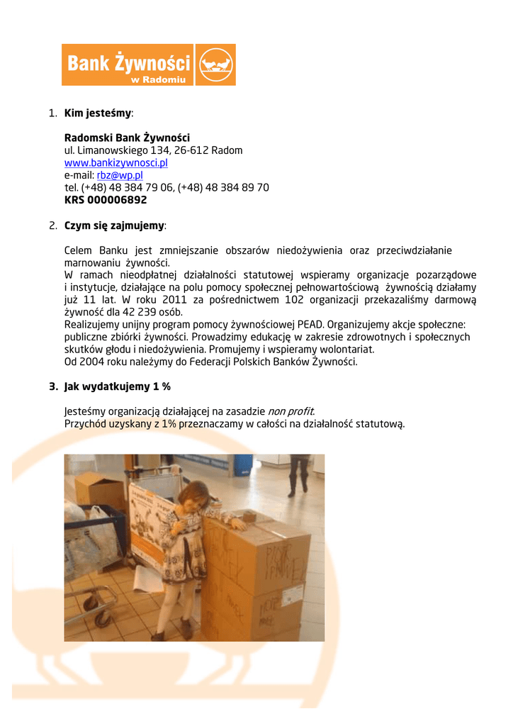 w Radomiu 1. Kim jesteśmy: Radomski Bank Żywności ul. Limanowskiego 134, 26-612 Radom www.bankizywnosci.pl e-mail: [email protected] tel. (+48) 48 384 79 06, (+48) 48 384 89 70 KRS 000006892 2. Czym się zajmujemy: Celem Banku jest zmniejszanie obszarów niedożywienia oraz przeciwdziałanie marnowaniu żywności. W ramach nieodpłatnej działalności statutowej wspieramy organizacje pozarządowe i instytucje, działające na polu pomocy społecznej pełnowartościową żywnością działamy już 11 lat. W roku 2011 za pośrednictwem 102 organizacji przekazaliśmy darmową żywność dla 42 239 osób. Realizujemy unijny program pomocy żywnościowej PEAD. Organizujemy akcje społeczne: publiczne zbiórki żywności. Prowadzimy edukację w zakresie zdrowotnych i społecznych skutków głodu i niedożywienia. Promujemy i wspieramy wolontariat. Od 2004 roku należymy do Federacji Polskich Banków Żywności. 3. Jak wydatkujemy 1 % Jesteśmy organizacją działającej na zasadzie non profit. Przychód uzyskany z 1% przeznaczamy w całości na działalność statutową. RBZ RBZ
