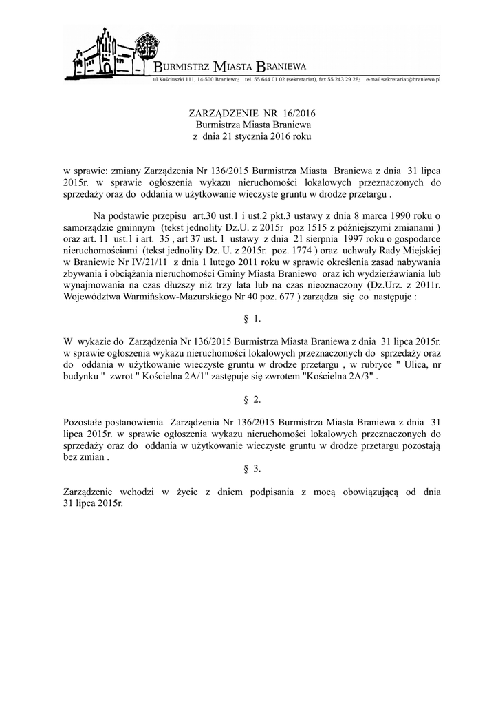 ZARZĄDZENIE NR 16/2016 Burmistrza Miasta Braniewa z dnia 21 stycznia 2016 roku w sprawie: zmiany Zarządzenia Nr 136/2015 Burmistrza Miasta Braniewa z dnia 31 lipca 2015r. w sprawie ogłoszenia wykazu nieruchomości lokalowych przeznaczonych do sprzedaży oraz do oddania w użytkowanie wieczyste gruntu w drodze przetargu . Na podstawie przepisu art.30 ust.1 i ust.2 pkt.3 ustawy z dnia 8 marca 1990 roku o samorządzie gminnym (tekst jednolity Dz.U. z 2015r poz 1515 z późniejszymi zmianami ) oraz art. 11 ust.1 i art. 35 , art 37 ust. 1 ustawy z dnia 21 sierpnia 1997 roku o gospodarce nieruchomościami (tekst jednolity Dz. U. z 2015r. poz. 1774 ) oraz uchwały Rady Miejskiej w Braniewie Nr IV/21/11 z dnia 1 lutego 2011 roku w sprawie określenia zasad nabywania zbywania i obciążania nieruchomości Gminy Miasta Braniewo oraz ich wydzierżawiania lub wynajmowania na czas dłuższy niż trzy lata lub na czas nieoznaczony (Dz.Urz. z 2011r. Województwa Warmińskow-Mazurskiego Nr 40 poz. 677 ) zarządza się co następuje : § 1. W wykazie do Zarządzenia Nr 136/2015 Burmistrza Miasta Braniewa z dnia 31 lipca 2015r. w sprawie ogłoszenia wykazu nieruchomości lokalowych przeznaczonych do sprzedaży oraz do oddania w użytkowanie wieczyste gruntu w drodze przetargu , w rubryce " Ulica, nr budynku " zwrot " Kościelna 2A/1" zastępuje się zwrotem "Kościelna 2A/3" . § 2. Pozostałe postanowienia Zarządzenia Nr 136/2015 Burmistrza Miasta Braniewa z dnia 31 lipca 2015r. w sprawie ogłoszenia wykazu nieruchomości lokalowych przeznaczonych do sprzedaży oraz do oddania w użytkowanie wieczyste gruntu w drodze przetargu pozostają bez zmian . § 3. Zarządzenie wchodzi w życie z dniem podpisania z mocą obowiązującą od dnia 31 lipca 2015r.