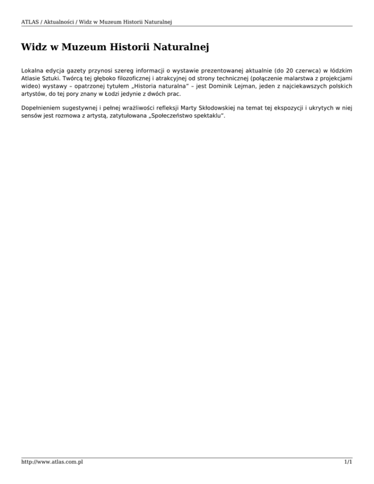 ATLAS / Aktualności / Widz w Muzeum Historii Naturalnej Widz w Muzeum Historii Naturalnej Lokalna edycja gazety przynosi szereg informacji o wystawie prezentowanej aktualnie (do 20 czerwca) w łódzkim Atlasie Sztuki. Twórcą tej głęboko filozoficznej i atrakcyjnej od strony technicznej (połączenie malarstwa z projekcjami wideo) wystawy – opatrzonej tytułem „Historia naturalna” – jest Dominik Lejman, jeden z najciekawszych polskich artystów, do tej pory znany w Łodzi jedynie z dwóch prac. Dopełnieniem sugestywnej i pełnej wrażliwości refleksji Marty Skłodowskiej na temat tej ekspozycji i ukrytych w niej sensów jest rozmowa z artystą, zatytułowana „Społeczeństwo spektaklu”. http://www.atlas.com.pl 1/1
