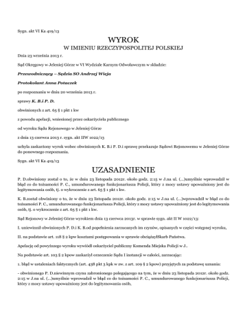Sygn. akt VI Ka 419/13 WYROK W IMIENIU RZECZYPOSPOLITEJ POLSKIEJ Dnia 23 września 2013 r. Sąd Okręgowy w Jeleniej Górze w VI Wydziale Karnym Odwoławczym w składzie: Przewodniczący – Sędzia SO Andrzej Wieja Protokolant Anna Potaczek po rozpoznaniu w dniu 20 września 2013 r. sprawy K. B.i P. D. obwinionych z art. 65 § 1 pkt 1 kw z powodu apelacji, wniesionej przez oskarżyciela publicznego od wyroku Sądu Rejonowego w Jeleniej Górze z dnia 13 czerwca 2013 r. sygn. akt IIW 1022/13 uchyla zaskarżony wyrok wobec obwinionych K. B.i P. D.i sprawę przekazuje Sądowi Rejonowemu w Jeleniej Górze do ponownego rozpoznania. Sygn. akt VI Ka 419/13 UZASADNIENIE P. D.obwiniony został o to, że w dniu 23 listopada 2012r. około godz. 2:15 w J.na ul. (...)umyślnie wprowadził w błąd co do tożsamości P. C., umundurowanego funkcjonariusza Policji, który z mocy ustawy upoważniony jest do legitymowania osób, tj. o wykroczenie z art. 65 § 1 pkt 1 kw. K. B.został obwiniony o to, że w dniu 23 listopada 2012r. około godz. 2:15 w J.na ul. (...)wprowadził w błąd co do tożsamości P. C., umundurowanego funkcjonariusza Policji, który z mocy ustawy upoważniony jest do legitymowania osób, tj. o wykroczenie z art. 65 § 1 pkt 1 kw. Sąd Rejonowy w Jeleniej Górze wyrokiem dnia 13 czerwca 2013r. w sprawie sygn. akt II W 1022/13: I. uniewinnił obwinionych P. D.i K. B.od popełnienia zarzucanych im czynów, opisanych w części wstępnej wyroku, II. na podstawie art. 118 § 2 kpw kosztami postępowania w sprawie obciążayłSkarb Państwa. Apelację od powyższego wyroku wywiódł oskarżyciel publiczny Komenda Miejska Policji w J.. Na podstawie art. 103 § 2 kpow zaskarżył orzeczenie Sądu I instancji w całości, zarzucając: 1. błąd w ustaleniach faktycznych (art. 438 pkt 3 kpk w zw. z art. 109 § 2 kpow) przyjętych za podstawę uznania: - obwinionego P. D.niewinnym czynu zabronionego polegającego na tym, że w dniu 23 listopada 2012r. około godz. 2:15 w J.na ul. (...)umyślnie wprowadził w błąd co do tożsamości P. C., umundurowanego funkcjonariusza Policji, który z mocy ustawy upoważniony jest do legitymowania osób, - obwinionego K. B.niewinnym czynu zabronionego polegającego na tym, że w dniu 23 listopada 2012r. około godz. 2:15 w J.na ul. (...)umyślnie wprowadził w błąd co do tożsamości P. C., umundurowanego funkcjonariusza Policji, który z mocy ustawy upoważniony jest do legitymowania osób, 2. obrazę przepisów prawa procesowego (art. 438 pkt 2 kpk w zw. z art. 109 § 2 kpow), a w szczególności art. 7 kpk w zw. z art. 8 kpow, mającą bezpośredni wpływ na treść orzeczenia. Na podstawie art. 427 § 1 kpk w zw. z art. 109 kpow skarżący wniósł o uchylenie wyroku i przekazanie sprawy do ponownego rozpoznania przez Sąd I instancji. Sąd Okręgowy zważył, co następuje: Apelacja zasługuje na uwzględnienie. Przedstawiona w niej argumentacja a dotycząca sposobu weryfikacji informacji uzyskanej od P. C.nakazuje ocenić zaskarżony wyrok jako przedwczesny. Sąd Rejonowy dał w pełni wiarę (całkowicie trafnie dop. SO zeznaniom policjantów, które w przeciwieństwie do wyjaśnień obwinionych są stanowcze, niezmienne i pochodzą od osób niezainteresowanych sposobem rozstrzygnięcia sprawy. W ich świetle nie ulega wątpliwości, że obaj obwinieni znali nie tylko nazwisko ale i imię legitymowanego kolegi nie mającego przy sobie żadnego dokumentu swojej tożsamości. Nadto ze sporządzonych przez funkcjonariuszy notatek urzędowych wynika (co Sąd I instancji przyjął za udowodnione) że uprzedzali P. D.i K. B.podobnie jak P. C.o odpowiedzialności karnej z art. 65 § 1 kw. Mimo to obaj obwinieni potwierdzili, że P. C.to R. C.tak jak sam podał swoje dane osobowe. Baczyć przy tym należy na brzmienie przepisu stanowiącego podstawę wniosku o ukaranie. W pkt 1 § 1 mówi o wprowadzeniu w błąd co do tożsamości własnej lub innej osoby. Zdaniem Sądu Odwoławczego pewnym uproszczeniem przyjętym w pisemnych motywach zaskarżonego wyroku jest stwierdzenie, że skoro P. C.podał fałszywe swoje dane osobowe to tylko jemu można przypisać popełnienie wykroczenia z art. 65 § 1 pkt 1 kw. Według Sądu Orzekającego fakt, iż wersję tego obwinionego potwierdzili w tym samym czasie i miejscu pozostali obwinieni na wyraźne żądanie dokonujących legitymowania policjantów oraz po uprzedzeniu o ewentualnej odpowiedzialności za wykroczenia z art. 65 kw nie wystarcza do przyjęcia ich zawinienia. Takie rozumowanie wydaje się za daleko idące. Przy podaniu rzeczywistych danych osobowych P. C.przez towarzyszących mu kolegów jego wersji nie mogła by się ostać i wiązałaby się z koniecznością jej dalszej weryfikacji do której ostatecznie oraz faktycznie doszło. Zdaniem Sądu Odwoławczego głównie wyjaśnienia współobwinionych pozwoliły na skuteczne, choć jedynie krótkotrwałe, wprowadzenie w błąd policjantów co do swojej tożsamości przez P. C.. Przywołana teza z komentarza do kodeksu wykroczeń autorstwa T. G.o bezskuteczności wykroczenia z art. 65 kw nie do końca odpowiada poczynionym w sprawie ustaleniom. Organ państwowy (policjanci) dali bowiem wiarę informacji uzyskanej od P. C.ale wyłącznie dlatego, że potwierdzili ją P. D.i K. B.. Samo oświadczenie zainteresowanego bez takiej lub innej weryfikacji nie doprowadziłoby do wprowadzenia w błąd funkcjonariuszy i miałoby znaczenie dla określenia jego odpowiedzialności. Zdaniem Sądu Odwoławczego przywołana wskazanym komentarzem bezskutkowość czynu odnosi się do jego materialnego wydźwięku. Popełnienie wykroczenia z art. 65 § 1 kw nie wniesie ze sobą skutku materialnego ma charakter formalny. W prawidłowo poczynionych w sprawie ustaleniach nie oznacza to jednak, zdaniem Sądu II instancji, że obwinieni nie popełnili zarzucanego im czynu. Niezbędna jest z tego względu ponowna prawna ocena zachowań P. D.i K. B.dlatego tego zaskarżony wyrok n