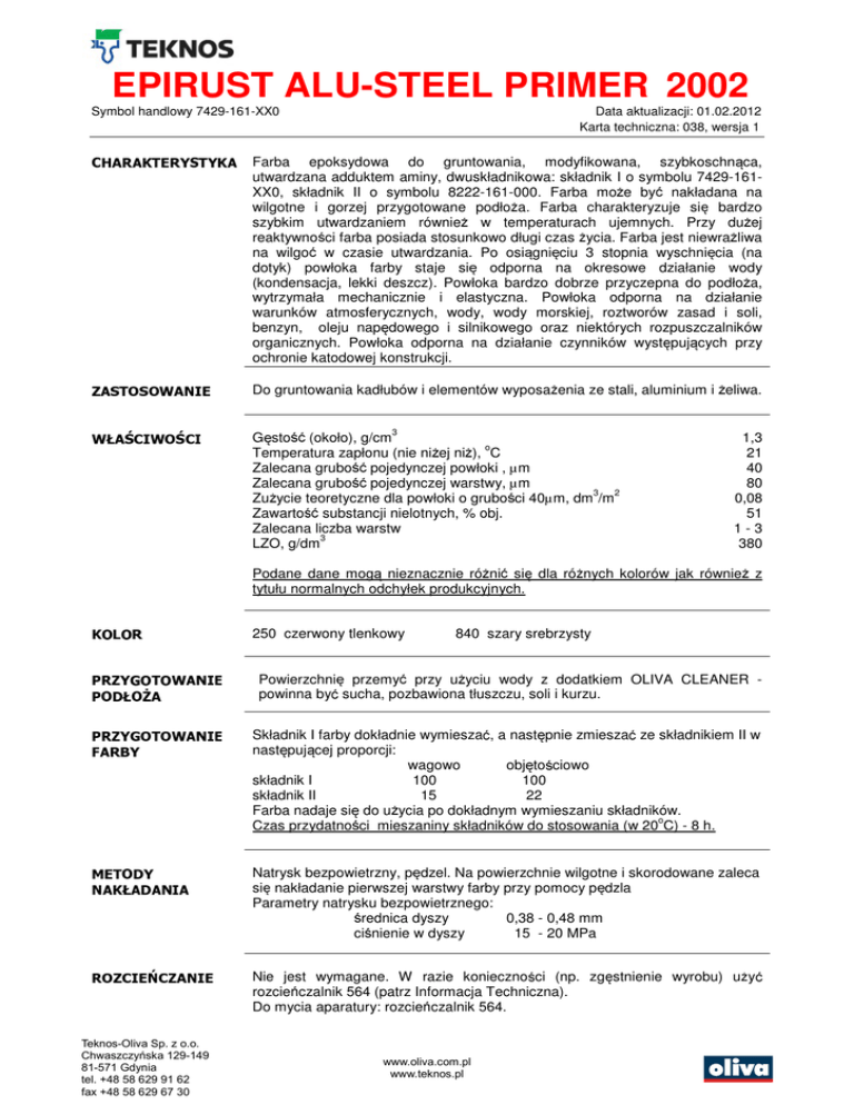 EPIRUST ALU-STEEL PRIMER 2002 Symbol handlowy 7429-161-XX0 Data aktualizacji: 01.02.2012 Karta techniczna: 038, wersja 1 Farba epoksydowa do gruntowania, modyfikowana, szybkoschn ca, utwardzana adduktem aminy, dwuskładnikowa: składnik I o symbolu 7429-161XX0, składnik II o symbolu 8222-161-000. Farba mo e by nakładana na wilgotne i gorzej przygotowane podło a. Farba charakteryzuje si bardzo szybkim utwardzaniem równie w temperaturach ujemnych. Przy du ej reaktywnoci farba posiada stosunkowo długi czas ycia. Farba jest niewra liwa na wilgo w czasie utwardzania. Po osi gniciu 3 stopnia wyschnicia (na dotyk) powłoka farby staje si odporna na okresowe działanie wody (kondensacja, lekki deszcz). Powłoka bardzo dobrze przyczepna do podło a, wytrzymała mechanicznie i elastyczna. Powłoka odporna na działanie warunków atmosferycznych, wody, wody morskiej, roztworów zasad i soli, benzyn, oleju napdowego i silnikowego oraz niektórych rozpuszczalników organicznych. Powłoka odporna na działanie czynników wystpuj cych przy ochronie katodowej konstrukcji. Do gruntowania kadłubów i elementów wyposa enia ze stali, aluminium i eliwa. Gsto (około), g/cm o Temperatura zapłonu (nie ni ej ni ), C Zalecana grubo pojedynczej powłoki , µm Zalecana grubo pojedynczej warstwy, µm 3 2 Zu ycie teoretyczne dla powłoki o gruboci 40µm, dm /m Zawarto substancji nielotnych, % obj. Zalecana liczba warstw 3 LZO, g/dm 3 1,3 21 40 80 0,08 51 1-3 380 Podane dane mog nieznacznie ró ni si dla ró nych kolorów jak równie z tytułu normalnych odchyłek produkcyjnych. 250 czerwony tlenkowy 840 szary srebrzysty Powierzchni przemy przy u yciu wody z dodatkiem OLIVA CLEANER powinna by sucha, pozbawiona tłuszczu, soli i kurzu. Składnik I farby dokładnie wymiesza, a nastpnie zmiesza ze składnikiem II w nastpuj cej proporcji: wagowo objtociowo składnik I 100 100 składnik II 15 22 Farba nadaje si do u ycia po dokładnym wymieszaniu składników. o Czas przydatnoci mieszaniny składników do stosowania (w 20 C) - 8 h. Natrysk bezpowietrzny, pdzel. Na powierzchnie wilgotne i skorodowane zaleca si nakładanie pierwszej warstwy farby przy pomocy pdzla Parametry natrysku bezpowietrznego: 0,38 - 0,48 mm rednica dyszy cinienie w dyszy 15 - 20 MPa Nie jest wymagane. W razie koniecznoci (np. zgstnienie wyrobu) u y rozcieczalnik 564 (patrz Informacja Techniczna). Do mycia aparatury: rozcieczalnik 564. Teknos-Oliva Sp. z o.o. Chwaszczyńska 129-149 81-571 Gdynia tel. +48 58 629 91 62 fax +48 58 629 67 30 www.oliva.com.pl www.teknos.pl EPIRUST ALU-STEEL PRIMER 2002 Symbol handlowy 7429-161-XX0 Data aktualizacji: 01.02.2012 Karta techniczna: 038, wersja 1 Warunki podczas malowania: o - minimalna temperatura podło a -5 C (powierzchnia wolna od lodu i szronu), - temperatura farby co najmniej 15°C, 0 - minimalna temperatura otoczenia -10 C - dobra wentylacja. Farba mo e by nakładana na powierzchnie o temperaturze poni ej punktu rosy albo na powierzchnie wilgotne. Jako powierzchnie wilgotne nale y rozumie : - powierzchnie po obróbce strumieniowo-ciernej na mokro, - powierzchnie o temperaturze poni ej punktu rosy, na których jednak woda jest niezauwa alna, o Czas schni cia (w 20 C): pyłosucho na dotyk - 25 min. - 50 min. Czas do nało!enia kolejnych warstw Czas pomidzy nakładaniem kolejnych warstw zale y od rodzaju farby i pó"niejszych warunków eksploatacji. Dla farb epoksydowych W temperaturze 30ºC 20ºC 10ºC najkrótszy najdłu#szy 35 min 40 min 1h 5ºC 0ºC -5ºC -10ºC 3h 5h nieograniczony 9h 15 h Dla farb winylowych, akrylowych i poliuretanowych W temperaturze 30ºC 20ºC 10ºC 5ºC 0ºC -5ºC -10ºC najkrótszy Najdłu#szy dla kategorii korozyjno$ci $rodowiska od C1 do C4 Najdłu#szy dla kategorii korozyjno$ci $rodowiska C5 50 min 60 min 2h 4h 6h 10 h 20 h 7 dni 12 dni 26 dni nieograniczony 6h 24 h 2 dni 3 dni W ka dym przypadku nakładania farb nawierzchniowych, z uwagi na wiksz wra liwo tych wyrobów na zanieczyszczenia podło a, czas do nakładania kolejnych warstw powinien by mo liwie krótki, najlepiej by był on ograniczony czasem pełnego utwardzenia powłoki w danej temperaturze. Osi gnicie dobrej przyczepnoci midzywarstwowej wymaga uzyskania odpowiedniej czystoci podło a. Jest to szczególnie wa ne w przypadku długich okresów midzy kolejnymi wymalowaniami. W przypadku, gdy farba była nakładana w niekorzystnych warunkach (du a wilgotno, słaba wentylacja) przed nało eniem farby nawierzchniowej powłok nale y przemy słodk wod i osuszy. Podane czasy dotycz powłoki jednowarstwowej o zalecanej gruboci, schn cej w warunkach dobrej wentylacji. Czasy te mog ulec zmianie wraz ze zmian temperatury, warunków wentylacji, iloci warstw i gruboci pokrycia% Warunki podczas utwardzania powłoki: o - minimalna temperatura powietrza -10 C - wilgotno wzgldna powietrza najwy ej 95%, - dobra wentylacja. Teknos-Oliva Sp. z o.o. Chwaszczyńska 129-149 81-571 Gdynia tel. +48 58 629 91 62 fax +48 58 629 67 30 www.oliva.com.pl www.teknos.pl EPIRUST ALU-STEEL PRIMER 2002 Symbol handlowy 7429-161-XX0 Data aktualizacji: 01.02.2012 Karta techniczna: 038, wersja 1 Czas pełnego utwardzenia powłoki: temperatura czas 40ºC 3,5 h 30ºC 14 h 20ºC 38 h 10ºC 60 h 5ºC 4 dni 0ºC 8 dni -5ºC 14 dni -10ºC 28 dni + Farby z linii BOSMAN , • Podczas opracowywania specyfikacji malowania, w zale noci od przeznaczenia i rodzaju konstrukcji mo na zało y grubo pojedynczej warstwy inn ni zalecana w instrukcji stosowania. Przy natrysku bezpowietrznym typowy zakres gruboci jednej powłoki wynosi od 35 do 90 µm. Zmiana gruboci warstwy suchej powoduje zmian zu ycia teoretycznego, gruboci warstwy powłoki mokrej, masy wyschnitej powłoki, czasów schnicia, czasu do nało enia kolejnej warstwy oraz oddania pokrycia do eksploatacji. • Najwy sz odporno chemiczn zestawu powłokowego uzyskuje si wtedy gdy kolejne warstwy farb s nakładane na nie w pełni utwardzon powłok. Podwy szenie stopnia czystoci podło a powoduje wydłu eni