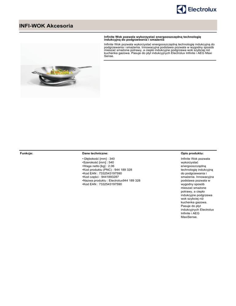 INFI-WOK Akcesoria Infinite Wok pozwala wykorzystać energooszczędną technologię indukcyjną do podgrzewania i smażenia Infinite Wok pozwala wykorzystać energooszczędną technologię indukcyjną do podgrzewania i smażenia. Innowacyjna podstawa pozwala w wygodny sposób mieszać smażone potrawy, a ciepło indukcyjne podgrzewa wok szybciej niż kuchenka gazowa. Pasuje do płyt indukcyjnych Electrolux Infinite i AEG Maxi Sense. Funkcje: Dane techniczne: Opis produktu: • Głębokość [mm] : 340 •Szerokość [mm] : 540 •Waga netto [kg] : 2,06 •Kod produktu (PNC) : 944 189 328 •Kod EAN : 7332543197590 •Kod części : 9441893287 •Nazwa produktu : Electrolux944 189 328 •Kod EAN : 7332543197590 Infinite Wok pozwala wykorzystać energooszczędną technologię indukcyjną do podgrzewania i smażenia. Innowacyjna podstawa pozwala w wygodny sposób mieszać smażone potrawy, a ciepło indukcyjne podgrzewa wok szybciej niż kuchenka gazowa. Pasuje do płyt indukcyjnych Electrolux Infinite i AEG MaxiSense.