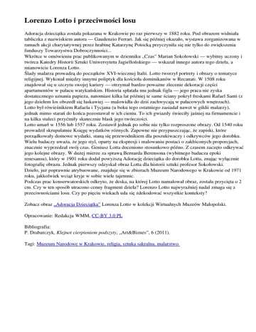 Lorenzo Lotto i przeciwności losu Adoracja dzieciątka została pokazana w Krakowie po raz pierwszy w 1882 roku. Pod obrazem widniała tabliczka z nazwiskiem autora — Gaudenzio Ferrari. Jak się później okazało, wystawa zorganizowana w ramach akcji charytatywnej przez hrabinę Katarzynę Potocką przyczyniła się nie tylko do zwiększenia funduszy Towarzystwa Dobroczynności... Wkrótce w omówieniu prac publikowanym w dzienniku „Czas” Marian Sokołowski — wybitny uczony i twórca Katedry Historii Sztuki Uniwersytetu Jagiellońskiego — wskazał innego autora tego dzieła, a mianowicie Lorenza Lotto. Ślady malarza prowadzą do początków XVIwiecznej Italii. Lotto tworzył portrety i obrazy o tematyce religijnej. Wykonał między innymi poliptyk dla kościoła dominikanów w Recanati. W 1508 roku znajdował się u szczytu swojej kariery — otrzymał bardzo poważne zlecenie dekoracji części apartamentów w pałacu watykańskim. Historia spłatała mu jednak figla — jego praca nie zyska dostatecznego uznania papieża, natomiast kilka lat później te same ściany pokrył freskami Rafael Santi (z jego dziełem los obszedł się łaskawiej — malowidła do dziś zachwycają w pałacowych wnętrzach). Lotto był rówieśnikiem Rafaela i Tycjana (u boku tego ostatniego zasiadał nawet w gildii malarzy), jednak mimo starań do końca pozostawał w ich cieniu. To ich gwiazdy świeciły jaśniej na firmamencie i na kilka stuleci przyćmiły skutecznie blask jego twórczości. Lotto umarł w 1556 lub 1557 roku. Zostawił jednak po sobie nie tylko rozproszone obrazy. Od 1540 roku prowadził skrupulatnie Księgę wydatków różnych. Zapewne nie przypuszczając, że zapiski, które porządkowały domowe wydatki, staną się przewodnikiem dla poszukiwaczy i odkrywców jego dorobku. Wielu badaczy uważa, że jego styl, oparty na ekspresji i malowaniu postaci o zakłóconych proporcjach, znacznie wyprzedzał swój czas. Geniusz Lotta doceniono stosunkowo późno. Z czasem zaczęto odkrywać jego kolejne obrazy. W dużej mierze za sprawą Bernarda Berensona (wybitnego badacza epoki renesansu), który w 1901 roku dodał powyższą Adorację dzieciątka do dorobku Lotta, znając wyłącznie fotografię obrazu. Jednak pierwszy odzyskał obraz Lotta dla historii sztuki profesor Sokołowski. Dzieło, już poprawnie atrybuowane, znajduje się w zbiorach Muzeum Narodowego w Krakowie od 1971 roku, jakkolwiek wciąż kryje w sobie wiele tajemnic. Podczas prac konserwatorskich odkryto, że deska, na której Lotto namalował obraz, została przycięta o 2 cm. Czy w ten sposób utracono cenny fragment dzieła? Lorenzo Lotto najwyraźniej nadal zmaga się z przeciwnościami losu. Czy po pięciu wiekach uda się zdekodować wszystkie konteksty? Zobacz obraz „ A dor acja Dzieciąt ka ” Lorenza Lotto w kolekcji Wirtualnych Muzeów Małopolski. Opracowanie: Redakcja WMM, CCBY 3.0 PL Bibliografia: P. Drabarczyk, Klejnot cierpieniem podszyty, „Art&Biznes”, 6 (2011). Tagi: Muzeum Narodowe w Krakowie, religia, sztuka sakralna, malarstwo