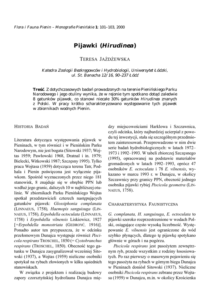 Flora i Fauna Pienin – Monografie Pienińskie 1: 101–103, 2000 Pijawki (Hirudinea) TERESA JAŻDŻEWSKA Katedra Zoologii Bezkre˛ gowców i Hydrobiologii, Uniwersytet Łódzki, ul. St. Banacha 12/16, 90–237 Łódź Treść. Z dotychczasowych badań prowadzonych na terenie Pienińskiego Parku Narodowego i jego otuliny wynika, że w rejonie tym spotkano dota˛d zaledwie 8 gatunków pijawek, co stanowi niecałe 30% gatunków Hirudinea znanych z Polski. W pracy krótko scharakteryzowano wyste˛powanie tych pijawek w zbiornikach wodnych Pienin. HISTORIA BADAŃ Literatura dotycza˛ca wyste˛powania pijawek w Pieninach, w tym również i w Pienińskim Parku Narodowym, nie jest bogata (Sitowski 1937; Wojtas 1959; Pawłowski 1968, Dratnal i in. 1979; Bielecki, Witkowski 1987; Szcze˛sny 1995). Tylko praca Wojtasa (1959) dotycza˛ca terenu Tatr, Podhala i Pienin poświe˛cona jest wyła˛cznie pijawkom. Spośród wyznaczonych przez niego 181 stanowisk, 8 znajduje sie˛ w obre˛bie PPN lub wzdłuż jego granic, dalszych 10 w najbliższej otulinie. W zbiornikach Parku Pienińskiego Wojtas spotkał przedstawicieli czterech naste˛puja˛cych gatunków pijawek: Glossiphonia complanata (LINNAEUS, 1758), Haemopis sanguisuga (LINNAEUS, 1758), Erpobdella octoculata (LINNAEUS, 1758) i Erpobdella vilnensis Liskiewicz, 1927 [=Erpobdella monostriata (GEDROYĆ, 1916)]. Ponadto autor ten przypuszcza, że w odcinku przełomowym Dunajca wyste˛puje również Piscicola respirans TROSCHEL, 1850 (= Cystobranchus respirans (TROSCHEL, 1850). Obecność tego gatunku w Dunajcu zasygnalizował wcześniej Sitowski (1937), a Wojtas (1959) nieliczne osobniki spotykał na rybach złowionych w kilku sa˛siednich stanowiskach. W zwia˛zku z projektem i realizacja˛ budowy zapory czorsztyńskiej hydrofauna Dunajca mie˛- dzy miejscowościami Harklowa i Szczawnica, czyli odcinka, który najbardziej ucierpiał z powodu tej inwestycji, stała sie˛ szczególnym przedmiotem zainteresowań. Przeprowadzono w nim dwie serie badań hydrobiologicznych: w latach 1972– 1973 i 1992–1993. W tabeli zbiorczej Szcze˛snego (1995), opracowanej na podstawie materiałów gromadzonych w latach 1992–1993, oprócz 47 osobników E. octoculata i 78 E. vilnensis, wykazano w marcu 1993 r. w Dunajcu, w okolicy Szczawnicy przy granicy PPN, obecność jednego osobnika pijawki rybiej Piscicola geometra (LINNAEUS, 1758). CHARAKTERYSTYKA FAUNISTYCZNA G. complanata, H. sanguisuga, E. octoculata to pijawki szeroko rozprzestrzenione w wodach Polski, osia˛gaja˛ce cze˛sto wysoka˛ liczebność. Wyste˛powanie E. vilnensis jest ograniczone do wód szybko płyna˛cych, dlatego te˛ pijawke˛ spotykano głównie w górach i na pogórzu. Piscicola respirans jest pasożytem zewne˛trznym ryb, przede wszystkim z rodziny łososiowatych. Po raz pierwszy o masowym pojawieniu sie˛ tego pasożyta na rybach w górnym biegu Dunajca w Pieninach doniósł Sitowski (1937). Nieliczne osobniki Piscicola respirans zebrane przez Wojtasa (1959) w Dunajcu, m.in. w okolicy Krościenka 102 FLORA I FAUNA P IENIN – Monografie Pienińskie, t.1 świadcza˛, że jest to stały element fauny w tej rzece. Ubóstwo swoich zbiorów Wojtas tłumaczy niewłaściwym dla tego gatunku sezonem połowów. Obserwacje biologiczne wykazały, że już w końcu czerwca gina˛ dorosłe osobniki po złożeniu kokonów, a nowe pokolenie pojawia dopiero wczesna˛ wiosna˛ naste˛pnego roku. Ponieważ prowadzone w latach 1957 i 1958 poszukiwania trwały od końca maja do sierpnia, prawdopodobieństwo spotkania tej pijawki było małe. Ostatnie wiadomości o obecności P. respirans w Dunajcu pochodza˛ od Bieleckiego i Witkowskiego (1987). Stwierdzili oni wysoki poziom zarażenia tym pasożytem lipieni odłowionych w 1986 roku w Dunajcu z odcinka mie˛dzy Ostrowskiem a Sromowcami Wyżnymi. P. geometra to także zewne˛trzny pasożyt ryb. Jest on pospolity w naszych wodach nizinnych, znajdowany był nawet w wodach słonawych. Pijawka rybia atakuje przede wszystkim ryby karpiowate. Przed ukazaniem sie˛ publikacji Szcze˛snego (1995) gatunek ten nie był wykazany z Pienin. Pojawienie sie˛ go można wia˛zać ze zmianami, jakie zaszły w rzece po powstaniu zapory czorsztyńskiej. Zaobserwowano bowiem, że wiele gatunków zanikło z zajmowanych wcześniej stanowisk, a w przypadku innych, mniej licznych gatunków, górna granica wyste˛powania przesune˛ła sie˛ ku źródłom. Z przytoczonych informacji wynika, że w wodach w obre˛bie PPN można spodziewać sie˛ obecności naste˛puja˛cych pijawek: Piscicola geometra, P. respirans, Glossiphonia complanata, Haemopis sanguisuga, Erpobdella octoculata i E. vilnensis. Na terenie, który można uznać za otuline˛ parku, poza sześciu wymienionymi wyżej gatunkami pijawek, Wojtas (1959) spotkał jeszcze osobniki należa˛ce do dwóch dalszych gatunków. Jednym z nich był Hemiclepsis marginata (O.F. MÜLLER, 1774), znaleziony w starorzeczu w Sromowcach Wyżnych, a drugim, spotykanym w wodach położonych w otulinie PPN, Helobdella stagnalis (LINNAEUS, 1758); o pijawce tej Wojtas (1959) pisze, że w Dunajcu pojawia sie˛ poniżej Nowego Targu. Podaje również informacje˛, że w małym zbiorniku nad prawobrzeżnym dopływem Grajcarka H. stagnalis była jedynym wyste˛puja˛cym gatunkiem pijawek. W latach siedemdziesia˛tych Dratnal i in. (1979) znaleźli te˛ pijawke˛ w próbach ze stanowiska powyżej Sromowiec Niżnych. Wyste˛powanie i liczebność pijawek uzależnione sa˛ od szeregu czynników ekologicznych, m.in. od wielkości i położenia zbiornika, szybkości pra˛du wody, charakteru dna i nasłonecznienia (Wojtas 1959). W przypadku gatunków pasożytniczych ważna jest także obecność organizmów żywicielskich. Odmienne wymagania poszczególnych gatunków pijawek sprawiaja˛, że wyste˛puja˛ one z niejednakowa˛ liczebnościa˛ w określonych strefach potoków. Erpobdella vilnensis to gatunek, który osia˛gna˛ł najwie˛ksza˛ cze˛sto