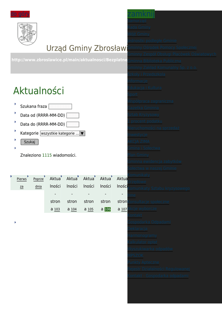 zamknij do góry Samorząd Rada Gminy Wójt Gminy Jednostki podległe Gminie Gminny Ośrodek Pomocy Społecznej Urząd Gminy Zbrosławice Gminny Zespół Obsługi Placówek Oświatowych http://www.zbroslawice.pl/main/aktualnosci/Bezplatne-badania-profilaktyczne-USG-piersi/id/ Gminna Biblioteka Publiczna printpdf/st:106 Gminny Zakład Komunalny Sp. z o.o. Szkoły i Przedszkola Informacje Aktualności Edukacja i Kultura Sport Współpraca zagraniczna Szukana fraza Gazetka Gminna Data od (RRRR-MM-DD) Sztab Kryzysowy 1 procent podatku Data do (RRRR-MM-DD) Nieruchomości na sprzedaż Kategorie wszystkie kategorie ... ▼ Inwestycje AKCJA ZIMA Szukaj Gmina i Sołectwa Plan Gminy Znaleziono 1115 wiadomości. Gminna ewidencja zabytków Sołectwa w naszej Gminie Komunikaty Aktua Aktua Aktua Następ Ostatni Urzędowe lności lności lności na a Komunikaty Sztabu kryzysowego - Inne - Pierws Poprze Aktua Aktua Aktua Aktua za dnia lności lności lności lności - - - - stron stron stron stron stron Konsultacje stron stron społeczne a 103 a 104 a 105 a wyborcze a 107 Akcje a 108 a 109 106 Kontakt Gospodarka Odpadami Deklaracja Harmonogramy Kalkulator opłat Wyszukiwarka odpadów MPSZOK Punkty Apteczne Rejestr Działalności Regulowanej Kontakt - Gospodarka odpadami 20 KWI 2011 kategoria: Siatkarki z Kamieńca IV w województwie Sport 19 kwietnia w sali gimnastycznej ZSP w Miedarach rozegrano Finał Licealiady Województwa Śląskiego w Piłce Siatkowej Dziewcząt. W turnieju wzięły udział reprezentacje: LO z ZSO im. Jana Pawła II w Kamieńcu II LO im. Mikołaja Kopernika w Cieszynie LO ze SMS „EDU-SPORT" w Bielsku Białej I LO im. Walentego Roździeńskiego z ZSO nr 1 w Sosnowcu. 19 KWI 2011 UWAGA – SZANSA NA SOLARY !!! kategoria: Inwestycje Przypominamy, że zgodnie z Uchwałą nr XXXVIII/431/09 Rady Gminy Zbrosławice z dnia 29 grudnia 2009 r. w sprawie warunków i trybu przyznawania wyróżnień i nagród, rodzaju wyróżnień i nagród pieniężnych za osiągnięcie wysokich wyników sportowych we współzawodnictwie międzynarodowym i krajowym, ogłoszoną w Dzienniku Urzędowym Nr 41 poz. 605 z dnia 30 marca 2010 r., wnioski w sprawie wyróżnień i nagród składa się do 14 KWI 2011 Zmiana stawek opłat za dostarczanie wody i odprowadzanie ścieków kategoria: Komunikaty urzędowe Od 1 maja ulegną zmianie stawki opłat za dostarczaną wodę i odprowadzane do oczyszczalni ścieki. Za 1 m3 wody odbiorcy zapłacą 5,18 zł., za ścieki natomiast 6,89 zł. Z budżetu Gminy do każdego metra sześciennego ścieków uchwalona została dopłata w wysokości 5,30 zł. Faktyczny koszt odbioru ścieków stanowi wartość 12,19 zł. za 1 m3. Opłaty abonamentowe wynosić będą 3,89 zł/mc dla gospodarstw domowych oraz 13 KWI 2011 Kontrola posesji - Jaśkowice kategoria: Komunikaty urzędowe Ogłoszenie zgodnie z harmonogramem kontroli. W miejscowości Jaśkowice w dniach od 10.05.2011r. do 14.05.2011r. w godzinach: Wtorek od 12:00 do18:00 Środa – Piątek od 8:00 do 14:00 Sobota od 9:00 do 14:00 (każda ostatnia sobota miesiąca) będzie przeprowadzona kontrola z zakresu przestrzegania przepisów dotyczących posiadania pojemników na nieczystości stałych oraz wywozu nieczystości płynnych z „szamba" 12 KWI 2011 kategoria: Turniej szachowy Sport W sobotę 19 marca, mimo nie najlepszej pogody, w świetlicy w Ziemięcicach była gorąca atmosfera. Rozegrano bowiem indywidualny turniej szachowy o Puchar Wójta Gminy Zbrosławice. Wzięło w nim udział 20 osób z terenu naszej gminy. Najmłodszy uczestnik miał 7 lat, a najstarsza uczestniczka 73 (starowały 4 panie). Rozegrano 7 partii po 20 minut. Wiele pojedynków stało na bardzo wysokim poziomie. Bezkonkurencyjnym mistrzem został 12 KWI 2011 Siłacze w Akcji kategoria: Sport W dniu 6.04.2011 roku odbył się VIII Regionalny Mityng w Trójboju Siłowym Olimpiad Specjalnych zorganizowany przez Sekcję Terenową „ Sokoły” Miedary. Areną zmagań dla 24 zawodników z niepełnosprawnością intelektualną była sala Zespołu szkolno – przedszkolnego w Miedarach a zawodnicy reprezentowali 7 sekcji terenowych z województwa Śląskiego takich jak: „Animusz” Racibórz, „Huragan” Racibórz, Koniczynka 12 KWI 2011 Industriada - zespoły wokalne kategoria: Inne Stowarzyszenie Miłośników Ziemi Tarnogórskiej zaprasza muzyków, wokalistów i zespoły do udziału w Przeglądzie Muzyki Tarnogórskiej „Industriada 2011", który odbędzie się 11 czerwca na terenie Zabytkowej Kopalni Srebra. Aby wziąć udział w przeglądzie, trzeba przesłać lub dostarczyć osobiście płytę CD z 2-3 swoimi utworami na adres: SMZT, ul. Gliwicka 2, 42-600 Tarnowskie Góry. Do płyty należy dołączyć informację o 12 KWI 2011 kategoria: Informacja NFZ Inne Informujemy, że zakładem opieki zdrowotnej, z którym w ramach podstawowej opieki zdrowotnej Śląski Oddział Wojewódzki NFZ zawarł od 1 marca 2011 roku umowę o realizację świadczeń nocnej i świątecznej opieki zdrowotnej jest NZOZ BI-MED z Tarnowskich Gór, ul. Mickiewicza 8. Rejestracja telefoniczna: (32) 381 75 81, 381 75 80, 285 80 80, 606 890 610. Jednocześnie przypominamy, ze od 1 marca pacjent, który będzie chciał 12 KWI 2011 Zbrosławicki Laur kategoria: Inne W związku ze zbliżającym się finałem kolejnej edycji konkursu o „Zbrosławicki Laur”, organizatorzy konkursu proszą o zgłaszanie kandydatur do tego tytułu, wraz z uzasadnieniem wyboru. Zgłoszenia prosimy kierować pisemnie na adres Urzędu Gminy Zbrosławice w terminie do 31 lipca br. O „Zbrosławicki Laur” mogą się ubiegać zarówno osoby jak i grupy (np. sołectwa, grupy sportowe, artystyczne itp.), które odniosły w 12 KWI 2011 kategoria: Wybory uzupełniające do Rady Gminy Zbrosławice Komunikaty urzędowe Przypominamy, że zgodnie z Uchwałą nr XXXVIII/431/09 Rady Gminy Zbrosławice z dnia 29 grudnia 2009 r. w sprawie warunków i trybu przyznawania wyróżnień i nagród, rodzaju wyró
