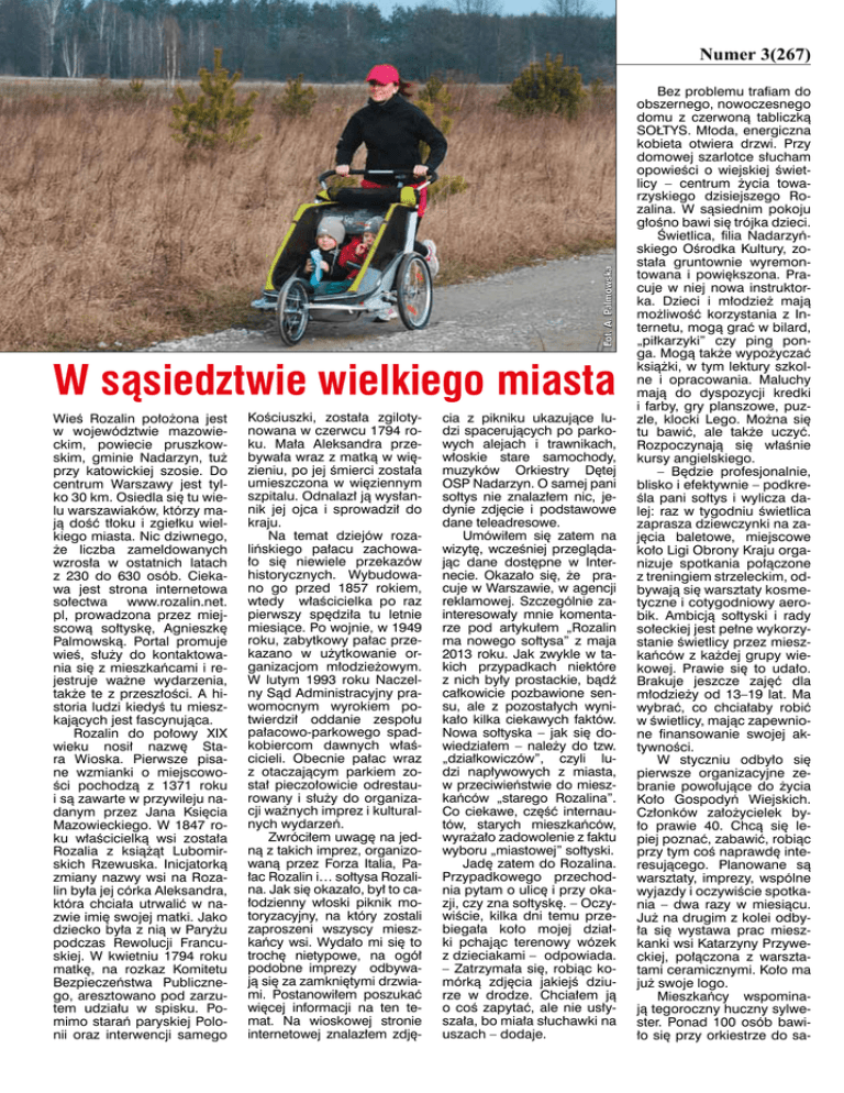 Gazeta Sołecka Numer 3(267) Fot. A. Palmowska 20 W sąsiedztwie wielkiego miasta Wieś Rozalin położona jest w województwie mazowieckim, powiecie pruszkowskim, gminie Nadarzyn, tuż przy katowickiej szosie. Do centrum Warszawy jest tylko 30 km. Osiedla się tu wielu warszawiaków, którzy mają dość tłoku i zgiełku wielkiego miasta. Nic dziwnego, że liczba zameldowanych wzrosła w ostatnich latach z 230 do 630 osób. Ciekawa jest strona internetowa sołectwa www.rozalin.net. pl, prowadzona przez miejscową sołtyskę, Agnieszkę Palmowską. Portal promuje wieś, służy do kontaktowania się z mieszkańcami i rejestruje ważne wydarzenia, także te z przeszłości. A historia ludzi kiedyś tu mieszkających jest fascynująca. Rozalin do połowy XIX wieku nosił nazwę Stara Wioska. Pierwsze pisane wzmianki o miejscowości pochodzą z 1371 roku i są zawarte w przywileju nadanym przez Jana Księcia Mazowieckiego. W 1847 roku właścicielką wsi została Rozalia z książąt Lubomirskich Rzewuska. Inicjatorką zmiany nazwy wsi na Rozalin była jej córka Aleksandra, która chciała utrwalić w nazwie imię swojej matki. Jako dziecko była z nią w Paryżu podczas Rewolucji Francuskiej. W kwietniu 1794 roku matkę, na rozkaz Komitetu Bezpieczeństwa Publicznego, aresztowano pod zarzutem udziału w spisku. Pomimo starań paryskiej Polonii oraz interwencji samego Kościuszki, została zgilotynowana w czerwcu 1794 roku. Mała Aleksandra przebywała wraz z matką w więzieniu, po jej śmierci została umieszczona w więziennym szpitalu. Odnalazł ją wysłannik jej ojca i sprowadził do kraju. Na temat dziejów rozalińskiego pałacu zachowało się niewiele przekazów historycznych. Wybudowano go przed 1857 rokiem, wtedy właścicielka po raz pierwszy spędziła tu letnie miesiące. Po wojnie, w 1949 roku, zabytkowy pałac przekazano w użytkowanie organizacjom młodzieżowym. W lutym 1993 roku Naczelny Sąd Administracyjny prawomocnym wyrokiem potwierdził oddanie zespołu pałacowo-parkowego spadkobiercom dawnych właścicieli. Obecnie pałac wraz z otaczającym parkiem został pieczołowicie odrestaurowany i służy do organizacji ważnych imprez i kulturalnych wydarzeń. Zwróciłem uwagę na jedną z takich imprez, organizowaną przez Forza Italia, Pałac Rozalin i… sołtysa Rozalina. Jak się okazało, był to całodzienny włoski piknik motoryzacyjny, na który zostali zaproszeni wszyscy mieszkańcy wsi. Wydało mi się to trochę nietypowe, na ogół podobne imprezy odbywają się za zamkniętymi drzwiami. Postanowiłem poszukać więcej informacji na ten temat. Na wioskowej stronie internetowej znalazłem zdję- cia z pikniku ukazujące ludzi spacerujących po parkowych alejach i trawnikach, włoskie stare samochody, muzyków Orkiestry Dętej OSP Nadarzyn. O samej pani sołtys nie znalazłem nic, jedynie zdjęcie i podstawowe dane teleadresowe. Umówiłem się zatem na wizytę, wcześniej przeglądając dane dostępne w Internecie. Okazało się, że pracuje w Warszawie, w agencji reklamowej. Szczególnie zainteresowały mnie komentarze pod artykułem „Rozalin ma nowego sołtysa” z maja 2013 roku. Jak zwykle w takich przypadkach niektóre z nich były prostackie, bądź całkowicie pozbawione sensu, ale z pozostałych wynikało kilka ciekawych faktów. Nowa sołtyska – jak się dowiedziałem – należy do tzw. „działkowiczów”, czyli ludzi napływowych z miasta, w przeciwieństwie do mieszkańców „starego Rozalina”. Co ciekawe, część internautów, starych mieszkańców, wyrażało zadowolenie z faktu wyboru „miastowej” sołtyski. Jadę zatem do Rozalina. Przypadkowego przechodnia pytam o ulicę i przy okazji, czy zna sołtyskę. – Oczywiście, kilka dni temu przebiegała koło mojej działki pchając terenowy wózek z dzieciakami – odpowiada. – Zatrzymała się, robiąc komórką zdjęcia jakiejś dziurze w drodze. Chciałem ją o coś zapytać, ale nie usłyszała, bo miała słuchawki na uszach – dodaje. Bez problemu trafiam do obszernego, nowoczesnego domu z czerwoną tabliczką SOŁTYS. Młoda, energiczna kobieta otwiera drzwi. Przy domowej szarlotce słucham opowieści o wiejskiej świetlicy – centrum życia towarzyskiego dzisiejszego Rozalina. W sąsiednim pokoju głośno bawi się trójka dzieci. Świetlica, filia Nadarzyńskiego Ośrodka Kultury, została gruntownie wyremontowana i powiększona. Pracuje w niej nowa instruktorka. Dzieci i młodzież mają możliwość korzystania z Internetu, mogą grać w bilard, „piłkarzyki” czy ping ponga. Mogą także wypożyczać książki, w tym lektury szkolne i opracowania. Maluchy mają do dyspozycji kredki i farby, gry planszowe, puzzle, klocki Lego. Można się tu bawić, ale także uczyć. Rozpoczynają się właśnie kursy angielskiego. – Będzie profesjonalnie, blisko i efektywnie – podkreśla pani sołtys i wylicza dalej: raz w tygodniu świetlica zaprasza dziewczynki na zajęcia baletowe, miejscowe koło Ligi Obrony Kraju organizuje spotkania połączone z treningiem strzeleckim, odbywają się warsztaty kosmetyczne i cotygodniowy aerobik. Ambicją sołtyski i rady sołeckiej jest pełne wykorzystanie świetlicy przez mieszkańców z każdej grupy wiekowej. Prawie się to udało. Brakuje jeszcze zajęć dla młodzieży od 13–19 lat. Ma wybrać, co chciałaby robić w świetlicy, mając zapewnione finansowanie swojej aktywności. W styczniu odbyło się pierwsze organizacyjne zebranie powołujące do życia Koło Gospodyń Wiejskich. Członków założycielek było prawie 40. Chcą się lepiej poznać, zabawić, robiąc przy tym coś naprawdę interesującego. Planowane są warsztaty, imprezy, wspólne wyjazdy i oczywiście spotkania – dwa razy w miesiącu. Już na drugim z kolei odbyła się wystawa prac mieszkanki wsi Katarzyny Przyweckiej, połączona z warsztatami ceramicznymi. Koło ma już swoje logo. Mieszkańcy wspominają tegoroczny huczny sylwester. Ponad 100 os