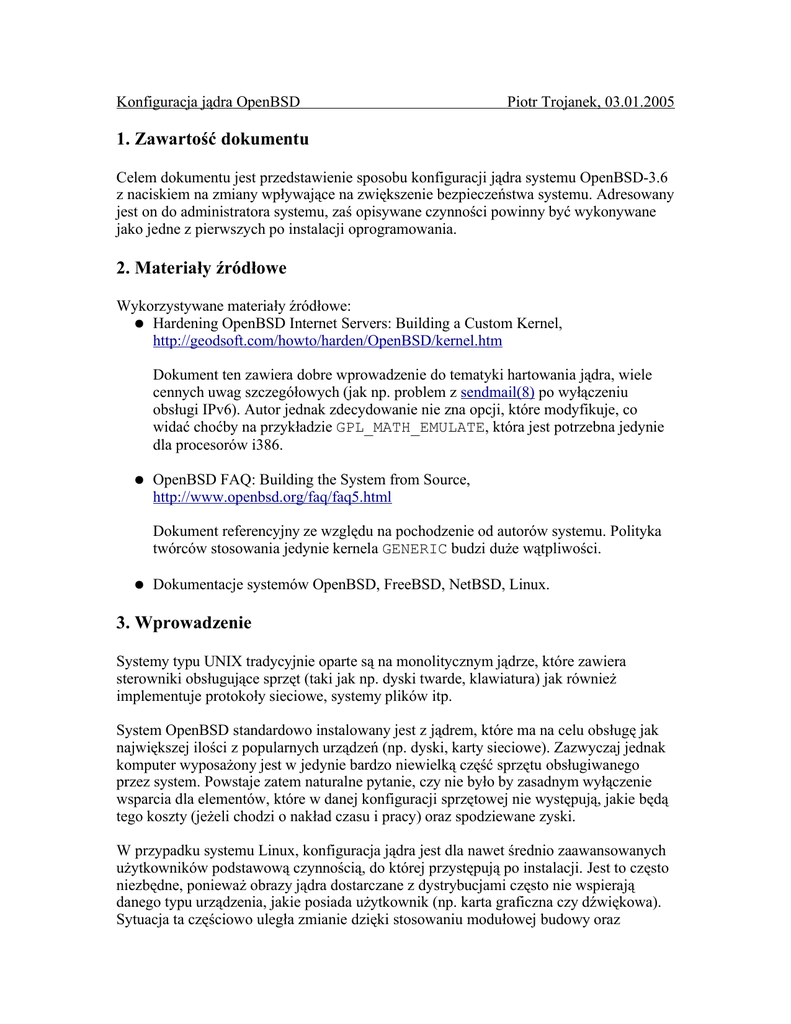 Konfiguracja jądra OpenBSD Piotr Trojanek, 03.01.2005 1. Zawartość dokumentu Celem dokumentu jest przedstawienie sposobu konfiguracji jądra systemu OpenBSD-3.6 z naciskiem na zmiany wpływające na zwiększenie bezpieczeństwa systemu. Adresowany jest on do administratora systemu, zaś opisywane czynności powinny być wykonywane jako jedne z pierwszych po instalacji oprogramowania. 2. Materiały źródłowe Wykorzystywane materiały źródłowe: ● Hardening OpenBSD Internet Servers: Building a Custom Kernel, http://geodsoft.com/howto/harden/OpenBSD/kernel.htm Dokument ten zawiera dobre wprowadzenie do tematyki hartowania jądra, wiele cennych uwag szczegółowych (jak np. problem z sendmail(8) po wyłączeniu obsługi IPv6). Autor jednak zdecydowanie nie zna opcji, które modyfikuje, co widać choćby na przykładzie GPL_MATH_EMULATE, która jest potrzebna jedynie dla procesorów i386. ● OpenBSD FAQ: Building the System from Source, http://www.openbsd.org/faq/faq5.html Dokument referencyjny ze względu na pochodzenie od autorów systemu. Polityka twórców stosowania jedynie kernela GENERIC budzi duże wątpliwości. ● Dokumentacje systemów OpenBSD, FreeBSD, NetBSD, Linux. 3. Wprowadzenie Systemy typu UNIX tradycyjnie oparte są na monolitycznym jądrze, które zawiera sterowniki obsługujące sprzęt (taki jak np. dyski twarde, klawiatura) jak również implementuje protokoły sieciowe, systemy plików itp. System OpenBSD standardowo instalowany jest z jądrem, które ma na celu obsługę jak największej ilości z popularnych urządzeń (np. dyski, karty sieciowe). Zazwyczaj jednak komputer wyposażony jest w jedynie bardzo niewielką część sprzętu obsługiwanego przez system. Powstaje zatem naturalne pytanie, czy nie było by zasadnym wyłączenie wsparcia dla elementów, które w danej konfiguracji sprzętowej nie występują, jakie będą tego koszty (jeżeli chodzi o nakład czasu i pracy) oraz spodziewane zyski. W przypadku systemu Linux, konfiguracja jądra jest dla nawet średnio zaawansowanych użytkowników podstawową czynnością, do której przystępują po instalacji. Jest to często niezbędne, ponieważ obrazy jądra dostarczane z dystrybucjami często nie wspierają danego typu urządzenia, jakie posiada użytkownik (np. karta graficzna czy dźwiękowa). Sytuacja ta częściowo uległa zmianie dzięki stosowaniu modułowej budowy oraz Konfiguracja jądra OpenBSD Piotr Trojanek, 03.01.2005 modyfikacji, które lepiej przystosowują system do typowych zastosowań (Kernel Rebuilding Guide). Podobnie w systemie FreeBSD tworzenie własnego dostosowanego jądra jest zalecane przez twórców (FreeBSD Handbook: Why Build a Custom Kernel). Autorzy OpenBSD przedstawiają jednak zupełnie inne podejście, zdecydowanie odradzając tworzenie własnych kerneli. Uzasadniają to przede wszystkim stwierdzeniem, że korzystanie z własnej, nieprzetestowanej konfiguracji jest w istocie zmniejszeniem bezpieczeństwa, zaś zysk w wydajności i szybkości działania jest niewielki. Wśród powodów, dla których dopuszczają korzystanie z przygotowanego samodzielnie obrazu jądra, jest uruchamianie OpenBSD na maszynie z wyjątkowo małą ilością pamięci RAM (domyślnie sam obraz to plik o rozmiarze ponad 5MB). Przedstawię poniżej opis przystosowania jądra OpenBSD do pracy na wirtualnej maszynie VMWare Workstation 4.5. Emulowany komputer odpowiada typowemu zastosowaniu jako serwer produkcyjny, gdzie nie ma konieczności korzystania z systemu graficznego, czy karty dźwiękowej. Konfiguracja wirtualnego komputera: ● klawiatura, mysz, ● HDD, CDROM, karta sieciowa, ● 64MB pamięci RAM. Zakładam więc, że celem nie jest uruchomienie sprzętu, którego nie obsługuję jądro dostarczane standardowo z systemem, a jedynie usunięcie wszelkich niewykorzystywanych elementów celem zwiększenie bezpieczeństwa systemu. 4. Tworzenie jądra systemu według własnej konfiguracji Budowanie jądra w systemach BSD składa się z trzech etapów: 1. Edycja pliku konfiguracyjnego Zakładając, że w systemie zainstalowano źródła jądra oraz narzędzia potrzebne do kompilacji, ustawienia domyślnego kernela znajdują się w pliku /usr/src/sys/arch/i386/conf/GENERIC Korzystając z dowolnego edytora tekstowego można dokonywać zmian poprzez dodawanie i usuwanie wpisów dla poszczególnych urządzeń i opcji, a w przypadku okrajania systemu poprzez poprzedzanie ich komentarzami. Dobrze jest dokonywać modyfikacji nie w oryginalnym pliku, lecz w jego kopii, którą można utworzyć poleceniem: cd /usr/src/sys/arch/i386/conf/ cp GENERIC MYCONF 2. Skonfigurowanie i przygotowanie do kompilacji Po przygotowaniu konfiguracji należy wykonać polecenie config MYCONF Jeżeli w pliku nie ma błędów, to utworzony zostanie katalog /usr/src/sys/arch/i386/compile/MYCONF zawierający wszelkie niezbędne pliki potrzebne do kompilacji nowego jądra. Zaletą takiego rozwiązania (np. w porównaniu do systemu LINUX) jest możliwość Konfiguracja jądra OpenBSD Piotr Trojanek, 03.01.2005 przechowywania wyników pośrednich kompilacji dla różnych konfiguracji sprzętowych (np. różnych maszyn a nawet architektur). 3. Kompilacja i instalacja Po przejściu do odpowiedniego katalogu: cd ../MYCONF należy wydać polecenie: make depend all install Aktualny obraz jądra zostanie skopiowany do pliku /obsd natomiast nowy zachowany jako /bsd. Dzięki temu na wypadek, gdyby coś poszło źle istnieje możliwość powrócenia do poprzedniej konfiguracji podając ścieżkę do obrazu na etapie bootowania systemu. Okrajanie jądra można podzielić na dwa etapy. Pierwszy to usuwanie sterowników urządzeń, które nie występują w systemie, natomiast drugi to usuwanie funkcjonalności realizowanej przez system operacyjny, takiej jak np. implementowane protokoły oraz systemy plików. 5. Modyfikacja listy sterowników Etap pierwszy – znajdowanie wpisów urządzeń, które faktycznie występują w systemie z