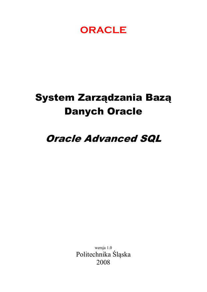 ORACLE System Zarządzania Bazą Danych Oracle Oracle Advanced SQL wersja 1.0 Politechnika Śląska 2008 Plan laboratorium • • • Frazy SQL: group by, rollup, cube, grouping sets funkcje analityczne, budowa modeli SQL dla zadań budżetowania, przewidywania trendów i zastosowań statystycznych (fraza model), Schemat testowy Schemat SH przedstawia bazę danych (hurtownię danych) wspomagającą przeprowadzanie analiz dotyczących wartości sprzedaży oraz poniesionych kosztów ze względu na: okres sprzedaży, produkt, kanał dystrybucji, promocję oraz klienta który dokonał transakcji. Główne tabele schematu SH: • TIMES – wymiar czasu • CHANNELS – wymiar kanału dystrybucji • CUSTOMERS – wymiar klienta • COUNTRIES – wymiar klienta, opis obszaru geograficznego • PRODUCTS – wymiar produktu • PROMOTIONS – wymiar promocji • SALES – fakty o sprzedaży • COSTS – fakty o kosztach Opis tabeli można uzyskać m.in. stosując komendę DESC <nazwa_tabeli>. Z1 Identyfikacja sekcji laboratoryjnej – logowanie 1. Zapytać prowadzącego laboratorium o nazwę podsekcji, nazwę użytkownika laboratoryjnego, hasło oraz opis bazy danych. 2. Ustalić identyfikator sekcji ID<data w formacie rrmmdd>_<nr_sekcji>_<nr_podsekcji>, np. ID051231_1_3 – identyfikator ten należy umieścić w sprawozdaniu Otworzyć SQL*Plus Worksheet lub SQL*Plus, zalogować się do bazy danych. Dla każdego zapytania należy zapisać zapytanie SQL, które je realizuje. Do formatowania wyniku należy użyć poleceń, typu: • • • • COLUMN country_region FORMAT A12 -- format pola 12 znaków COLUMN calendar_year FORMAT 9999 -- format pola 4 liczby set pagesize 100 -- rozmiar strony set linesize 200 -- długość linii Z2 Raportowanie z wykorzystaniem konstrukcji standardu SQL 1. Podać sumaryczną wartość sprzedaży, sumaryczną liczbę sprzedanych jednostek osiągniętą w poszczególnych regionach i krajach (wyświetlić country_iso_code) – wynik uporządkować malejąco wg wartości sprzedaży. 2. Podać zapytania pozwalające na pobranie danych do raportu podsumowującego wartość sprzedaży na poziomach: regionu, podregionu, kraju, roku, kwartału dla regionów „Americas” i „Middle East” i lat 2000-2001 (schemat raportu, wg zamieszczonej tabeli, zawiera ona dane przykładowe). W raporcie należy podać wszystkie sumy częściowe – od poziomu kraj-kwartał do sumy globalnej (wszystkie regiony, we wszystkich latach). Użyć: a. group by <lista kolumn> b. group by grouping sets(…) 2 c. group by rollup(…) d. group by cube (…) Dla każdego zapytania podać: • 20 pierwszych rekordów uzyskanych w wyniku realizacji zapytania posortowanych malejąco wg amount_sold, • całkowitą liczbę zwróconych rekordów • sumaryczny czas wykonania raportu (wszystkich zapytań dla a)-d)) – użyć: set timing on/set timing off). Porównać czasy wykonania wszystkich raportów. region Americas podregion Northern America Southern America kraj rok kwart 2000 Q1 Q2 Q3 Q4 suma 2001 Q1 Q2 Q3 Q4 suma US 1 1 1 1 4 1 1 1 1 4 8 CA suma 1 2 1 2 1 2 1 2 4 8 1 2 1 2 1 2 1 2 4 8 8 16 AR 1 1 1 1 4 1 1 1 1 4 8 suma 1 3 1 3 1 3 1 3 4 12 1 3 1 3 1 3 1 3 4 12 8 24 SA 1 1 1 1 4 1 1 1 1 4 8 suma 1 1 4 1 1 4 1 1 4 1 1 4 4 4 16 1 1 4 1 1 4 1 1 4 1 1 4 4 4 16 8 8 32 suma Middle East Middle East suma suma suma Z3 Raportowanie z wykorzystaniem funkcji analitycznych SQL 1. Podać zapytanie tworzące ranking krajów według sprzedaży całkowitej (użyć RANK) – miejsce I dla kraju o największej wartości sprzedaży. Kraj Poland France Germany Spain US Portugal … Suma 120 90 80 70 60 50 … Ranking 1 2 3 4 5 6 … 2. Podać zapytanie tworzące ranking krajów z regionu „Europe” w poszczególnych latach według sprzedaży całkowitej (użyć RANK). Rok 2001 2000 Kraj Poland France Germany Spain Poland Portugal … Suma 120 90 80 70 100 95 … Ranking 1 2 3 4 1 2 … 3 3. Napisać zapytanie pokazujące sumy wartości sprzedaży w USA kwartalnie i narastająco kwartalnie w danym roku: Rok 2000 2001 Kwartał 1 2 3 4 1 2 … Suma 9 20 10 3 8 4 … arastająco 9 29 39 42 8 12 … 4. Napisać zapytanie pokazujące sumy wartości sprzedaży w USA kwartalnie oraz 3-kwartalną średnią kroczącą: Rok 2000 2001 Kwartał 1 2 3 4 1 2 … Suma 9 20 10 3 8 4 … Średnia 3 kw 9 14,5 13 11 7 5 … Z4 Raportowanie z wykorzystaniem modeli SQL Utworzyć perspektywę: CREATE VIEW sales_view AS SELECT country_name country, prod_name product, calendar_year year, SUM(amount_sold) sales, COUNT(amount_sold) cnt, MAX(calendar_year) KEEP (DENSE_RANK FIRST ORDER BY SUM(amount_sold) DESC) OVER (PARTITION BY country_name, prod_name) best_year, MAX(calendar_year) KEEP (DENSE_RANK LAST ORDER BY SUM(amount_sold) DESC) OVER (PARTITION BY country_name, prod_name) worst_year FROM sales, times, customers, countries, products WHERE sales.time_id = times.time_id AND sales.prod_id = products.prod_id AND sales.cust_id =customers.cust_id AND customers.country_id=countries.country_id GROUP BY country_name, prod_name, calendar_year; W oparciu o SALES_VIEW utworzyć jeden model o następującej charakterystyce: 1. model skoryguje, że po roku 1999 wartość sprzedaży podkładki pod mysz (‘Mouse Pad’) w Polsce wynosiła 5, 2. model zakłada, że wartość sprzedaży produktu '128MB Memory Card' w roku 2006 w USA i Wielkiej Brytanii wzrośnie o 15% w stosunku do średniej sprzedaży w latach 1999-2005, 3. model zakłada, że wartość sprzedaży produktu 'Mouse Pad' w roku 2006 w Polsce wzrośnie o 5% w stosunku do maksymalnej wartości dotychczas zarejestrowanej sprzedaży tego produktu, 4. model wypisze przewidywaną wartość wszystkich produktów, których sprzedaż prognozuje się w roku 2006 4 5