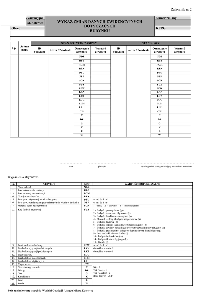 Załącznik nr 2 Jednostka ewidencyjna 246901_1 Numer zmiany WYKAZ ZMIAN DANYCH EWIDENCYJNYCH DOTYCZĄCYCH BUDYNKU M. Katowice Obręb STAN DOTYCHCZASOWY Lp. Arkusz mapy ID budynku Adres / Położenie Oznaczenie atrybutu KERG STAN NOWY Wartość atrybutu ID budynku Adres / Położenie NDZ Oznaczenie atrybutu NDZ RBB RBB ROM ROM RZN RZN PEU PEU PPP PPP SCN SCN FUZ FUZ PEW LKN PEW LKN LKP LGG LKP LGG LLM LLM LLU LLU CW CW C C DZ DZ G G K K E E W W ---------------- ------------------- data pieczątka ------------------------------------------czytelny podpis osoby posiadającej uprawnienia zawodowe Wyjaśnienia atrybutów : Lp. 1. 2. 3. 4. 5. 6. 7. 8. 9. 10. 11. 12. 13. 14. 15. 16. 17. 18. 19. 20. 21. Wartość atrybutu ATRYBUT Numer działki Rok zakończenia budowy Rok ostatniej modernizacji Nr rejestru zabytków Pole pow. użytkowej lokali w budynku Pole pow. pomieszczeń przynależnych do lokalu w budynku Materiał ścian zewnętrznych KOD NDZ RBB ROM RZN PEU PPP SCN Kod funkcji użytkowej FUZ Powierzchnia zabudowy Liczba kondygnacji nadziemnych Liczba kondygnacji podziemnych Liczba garaży Liczba lokali mieszkalnych Liczba lokali użytkowych Ciepła woda Centralne ogrzewanie Dźwig Gaz Kanalizacja Prąd Woda PEW LKN LKP LGG LLM LLU CW C DZ G K E W Pola zacieniowane wypełnia Wydział Geodezji Urzędu Miasta Katowice WARTOŚCI DOPUSZCZALNE w m², do 1 m² w m², do 1 m² 1 - mur, 2 - drewno, 3 - inne materiały 1 - Budynki przemysłowe ( p) 2 - Budynki transportu i łączności (t) 3 - Budynki handlowo – usługowe (h) 4 - Zbiorniki, silosy i budynki magazynowe (s) 5 - Budynki biurowe (b) 6 - Budynki szpitali i zakładów opieki medycznej (z) 7 - Budynki oświaty, nauki i kultury oraz budynki kultury fizycznej (k) 8 - Budynki produkcyjne, usługowe i gospodarcze dla rolnictwa (g) 9 - Inne budynki niemieszkalne (i) 10 - Budynki mieszkalne (m) 14 - Budynki kultu religijnego (k) 15 - Garaże (t) w m², do 1 m² domyślna wartość 1 domyślna wartość 0 Nie - 0 Tak (sieć) - 1 Tak (lokalna) - 2 Brak danych - „bd”