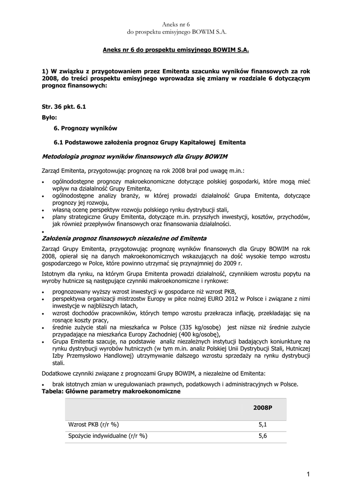 Aneks nr 6 do prospektu emisyjnego BOWIM S.A. Aneks nr 6 do prospektu emisyjnego BOWIM S.A. 1) W związku z przygotowaniem przez Emitenta szacunku wyników finansowych za rok 2008, do treści prospektu emisyjnego wprowadza się zmiany w rozdziale 6 dotyczącym prognoz finansowych: Str. 36 pkt. 6.1 Było: 6. Prognozy wyników 6.1 Podstawowe załoŜenia prognoz Grupy Kapitałowej Emitenta Metodologia prognoz wyników finansowych dla Grupy BOWIM Zarząd Emitenta, przygotowując prognozę na rok 2008 brał pod uwagę m.in.: • • • • ogólnodostępne prognozy makroekonomiczne dotyczące polskiej gospodarki, które mogą mieć wpływ na działalność Grupy Emitenta, ogólnodostępne analizy branŜy, w której prowadzi działalność Grupa Emitenta, dotyczące prognozy jej rozwoju, własną ocenę perspektyw rozwoju polskiego rynku dystrybucji stali, plany strategiczne Grupy Emitenta, dotyczące m.in. przyszłych inwestycji, kosztów, przychodów, jak równieŜ przepływów finansowych oraz finansowania działalności. • ZałoŜenia prognoz finansowych niezaleŜne od Emitenta Zarząd Grupy Emitenta, przygotowując prognozę wyników finansowych dla Grupy BOWIM na rok 2008, opierał się na danych makroekonomicznych wskazujących na dość wysokie tempo wzrostu gospodarczego w Polce, które powinno utrzymać się przynajmniej do 2009 r. Istotnym dla rynku, na którym Grupa Emitenta prowadzi działalność, czynnikiem wzrostu popytu na wyroby hutnicze są następujące czynniki makroekonomiczne i rynkowe: • • • • • prognozowany wyŜszy wzrost inwestycji w gospodarce niŜ wzrost PKB, perspektywa organizacji mistrzostw Europy w piłce noŜnej EURO 2012 w Polsce i związane z nimi inwestycje w najbliŜszych latach, wzrost dochodów pracowników, których tempo wzrostu przekracza inflację, przekładając się na rosnące koszty pracy, średnie zuŜycie stali na mieszkańca w Polsce (335 kg/osobę) jest niŜsze niŜ średnie zuŜycie przypadające na mieszkańca Europy Zachodniej (400 kg/osobę), Grupa Emitenta szacuje, na podstawie analiz niezaleŜnych instytucji badających koniunkturę na rynku dystrybucji wyrobów hutniczych (w tym m.in. analiz Polskiej Unii Dystrybucji Stali, Hutniczej Izby Przemysłowo Handlowej) utrzymywanie dalszego wzrostu sprzedaŜy na rynku dystrybucji stali. Dodatkowe czynniki związane z prognozami Grupy BOWIM, a niezaleŜne od Emitenta: brak istotnych zmian w uregulowaniach prawnych, podatkowych i administracyjnych w Polsce. Tabela: Główne parametry makroekonomiczne • 2008P Wzrost PKB (r/r %) 5,1 SpoŜycie indywidualne (r/r %) 5,6 1 Aneks nr 6 do prospektu emisyjnego BOWIM S.A. Nakłady brutto na środki trwałe (r/r %) 12,8 Stopa bezrobocia (%, na koniec roku) 8,5 Inflacja (r/r %, na koniec roku) 3,5 Kurs wymiany EUR/PLN 3,51 Wzrost wynagrodzeń w sektorze przedsiębiorstw (r/r %) 6,5 Źródło: BZ WBK S.A. ZałoŜenia, na które mogą mieć wpływ członkowie organów zarządzających lub nadzorczych spółek Grupy Emitenta. Zarząd Grupy Emitenta, przygotowując prognozę na rok 2008, opierał się na następujących głównych załoŜeniach: • • • • • • • • Grupa Emitenta będzie realizowała strategię przedstawioną w punkcie 8.2.6 Prospektu, ze szczególnym uwzględnieniem dalszego rozwoju działalności podstawowej, Stanem bazowym dla prognoz poziomu przychodów, kosztów i marŜ były dane zawarte w skonsolidowanym sprawozdaniu finansowym sporządzonym na dzień 31.12.2007 r., które zostało poddane badaniu przez biegłego rewidenta, Prognoza wyników na 2008 uwzględnia cele strategiczne i emisyjne opisane w pkt 3.1 oraz w pkt 8.3.3, w szczególności proces inwestycyjny związany z rozbudową bazy logistyczno-dystrybucyjnej w Wielkopolsce i Mazowszu, Źródła finansowania – finansowanie działalności opierać się będzie o środki własne wygospodarowane podczas prowadzonej działalności gospodarczej, kredyty bankowe oraz o środki pozyskane z emisji Akcji Serii D, Liczba zatrudnionych – zakłada się wzrost zatrudnienia oraz rozwój kadry pod kątem prowadzonej działalności wynikającej ze strategii Grupy Emitenta, Koszty finansowe ponoszone przez Grupę Emitenta, obejmują koszty finansowania działalności bieŜącej oraz koszty planowanych inwestycji, obciąŜenie uzyskiwanego przez Grupę BOWIM zysku brutto podatkiem na poziomie 19%, przeznaczenie nie podzielonych zysków z 2007 r. na finansowanie programu inwestycyjnego oraz zasilenie kapitału obrotowego. 6.2 Raport niezaleŜnych księgowych lub biegłych rewidentów na temat prawidłowości sporządzenia szacunku wyników RAPORT NIEZALEśNEGO BIEGŁEGO REWIDENTA ze sprawdzenia wybranych elementów prognozowanych informacji finansowych okres od 01.01.2008 r. do 31.12.2008 r. dla Akcjonariuszy, Rady Nadzorczej, Zarządu BOWIM S.A. Sprawdziliśmy wybrane elementy prognozowanych informacji finansowych Grupy Kapitałowej spółki Bowim S.A. z siedzibą w Sosnowcu przy ul. Niwecka 1 E, na które składają się sporządzone na dzień 10.04.2008 roku w formie projekcji i oparte na szacunkach następujące elementy rachunku zysków i strat za okres roczny od 01.01. do 31.12.2008: przychody netto ze sprzedaŜy produktów, towarów i materiałów w wysokości 1.219.239.783,00 złotych, wynik finansowy EBITDA w wysokości 41.398.988,00 złotych, zysk z działalności operacyjnej w wysokości 38.698.377,00 złotych, zysk brutto w wysokości 25.668.400,00 złotych , zysk netto w wysokości 20.547.692,00 złotych , Prognozowane informacje finansowe zostały przygotowane w celu zamieszczenia ich w Prospekcie Emisyjnym i zaprezentowania potencjalnym inwestorom. 2 Aneks nr 6 do prospektu emisyjnego BOWIM S.A. Za sporządzenie prognozowanych informacji finansowych, w tym takŜe za załoŜenia obejmujące równieŜ hipotezy przyszłych zdarzeń i działań kierownictwa, na których je oparto, odpowiada Zarząd Bowim S.A. Naszym zadaniem było dokonanie sprawdzenia progn