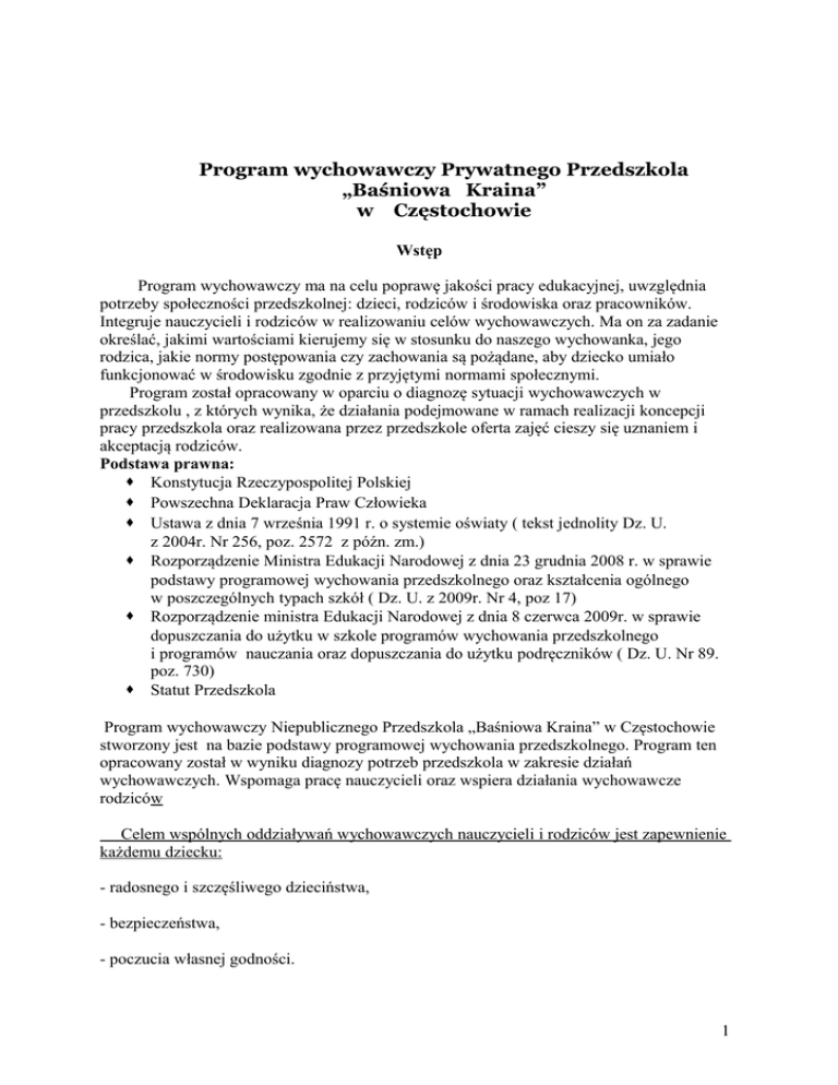Program wychowawczy Prywatnego Przedszkola „Baśniowa Kraina” w Częstochowie Wstęp Program wychowawczy ma na celu poprawę jakości pracy edukacyjnej, uwzględnia potrzeby społeczności przedszkolnej: dzieci, rodziców i środowiska oraz pracowników. Integruje nauczycieli i rodziców w realizowaniu celów wychowawczych. Ma on za zadanie określać, jakimi wartościami kierujemy się w stosunku do naszego wychowanka, jego rodzica, jakie normy postępowania czy zachowania są pożądane, aby dziecko umiało funkcjonować w środowisku zgodnie z przyjętymi normami społecznymi. Program został opracowany w oparciu o diagnozę sytuacji wychowawczych w przedszkolu , z których wynika, że działania podejmowane w ramach realizacji koncepcji pracy przedszkola oraz realizowana przez przedszkole oferta zajęć cieszy się uznaniem i akceptacją rodziców. Podstawa prawna: Konstytucja Rzeczypospolitej Polskiej Powszechna Deklaracja Praw Człowieka Ustawa z dnia 7 września 1991 r. o systemie oświaty ( tekst jednolity Dz. U. z 2004r. Nr 256, poz. 2572 z późn. zm.) Rozporządzenie Ministra Edukacji Narodowej z dnia 23 grudnia 2008 r. w sprawie podstawy programowej wychowania przedszkolnego oraz kształcenia ogólnego w poszczególnych typach szkół ( Dz. U. z 2009r. Nr 4, poz 17) Rozporządzenie ministra Edukacji Narodowej z dnia 8 czerwca 2009r. w sprawie dopuszczania do użytku w szkole programów wychowania przedszkolnego i programów nauczania oraz dopuszczania do użytku podręczników ( Dz. U. Nr 89. poz. 730) Statut Przedszkola Program wychowawczy Niepublicznego Przedszkola „Baśniowa Kraina” w Częstochowie stworzony jest na bazie podstawy programowej wychowania przedszkolnego. Program ten opracowany został w wyniku diagnozy potrzeb przedszkola w zakresie działań wychowawczych. Wspomaga pracę nauczycieli oraz wspiera działania wychowawcze rodziców Celem wspólnych oddziaływań wychowawczych nauczycieli i rodziców jest zapewnienie każdemu dziecku: - radosnego i szczęśliwego dzieciństwa, - bezpieczeństwa, - poczucia własnej godności. 1 Cele programu Cel ogólny: Usystematyzowanie pracy wychowawczej prowadzonej w przedszkolu Cele szczegółowe: -budowanie systemu wartości, w tym wychowanie dzieci tak, żeby lepiej orientowały się w tym co dobre a co złe, -rozwijanie umiejętności społecznych postaw dzieci, -stwarzanie warunków sprzyjających wspólnej i zgodnej zabawie oraz nabywaniu umiejętności przez dzieci o zróżnicowanych możliwościach fizycznych i intelektualnych, -kształtowanie u dzieci poczucia przynależności społecznej (do rodziny, grupy rówieśniczej i wspólnoty narodowej) oraz postawy patriotycznej. Charakterystyka programu Treści zawarte w programie uwzględniają świadome wprowadzanie dziecka w system pożądanych zachowań, zapewnienie warunków do pełnego rozwoju osobowego każdego wychowanka, poprawę jakości pracy wychowawczej, uwzględnienie potrzeb społeczności przedszkolnej: dzieci, rodziców, środowiska oraz pracowników. Program zawiera cele, które ukierunkowują działalność nauczycieli oraz wspomagają kształtowanie prawidłowych postaw funkcjonowania dzieci w grupie w oparciu o wzmocnienia pozytywne. Program wychowawczy jest zgodny z podstawą programową wychowania przedszkolnego i zawiera następujące zadania do realizacji: Kształtowanie umiejętności społecznych dzieci: promowanie działań kształtujących szacunek do każdego człowieka, jego godności osobistej. Kształtowanie u dzieci postawy prozdrowotnej oraz wdrażanie ich do dbałości o bezpieczeństwo własne oraz innych. Wychowanie dla poszanowania roślin i zwierząt oraz kształtowanie postaw proekologicznych. Kształtowanie u dzieci poczucia własnej tożsamości, budzenie świadomości narodowej i postawy patriotycznej. Wprowadzanie dzieci w świat wartości estetycznych i rozwijanie umiejętności wypowiadania się poprzez muzykę, taniec i ruch oraz małe formy teatralne i sztuki plastyczne. Poznanie środowiska wychowawczego każdego dziecka oraz śledzenie jego ogólnego rozwoju. Warunki realizacji 2 Programem wychowawczym objęte są dzieci przedszkolne. Zadania wychowawcze realizowane będą w sposób ciągły przez wszystkich nauczycieli poprzez odpowiedni dobór metod i form pracy, literaturę, pomoce dydaktyczne oraz stosowanie środków wychowawczych wzmacniających pozytywne zachowania dzieci. Nauczyciele będą współpracować z rodziną dziecka w celu ujednolicenia oddziaływań wychowawczych. Pracownicy niepedagogiczni będą wspierać działania nauczycieli. Zadania: I. Kształtowanie umiejętności społecznych dzieci: promowanie działań kształtujących szacunek do każdego człowieka, jego godności osobistej: Cele szczegółowe: - rozróżnianie pozytywnych i negatywnych form zachowania, - akceptowanie drugiego człowieka, - rozróżnianie dobra od zła, - przestrzeganie kompromisu w zabawie, - rozwiązywanie konfliktów, - pomaganie niepełnosprawnym, - rozpoznawanie i nazywanie uczuć innych, - stosowanie się do kontraktów ustalonych w grupie, - kształtowanie samodzielności, - kształtowanie odporności emocjonalnej. Sposób realizacji: - wyrabianie nawyków kulturalnych oraz prawidłowego zachowania się poprzez zabawy integracyjne, tematyczne, dydaktyczne, konstrukcyjne, ruchowe, - wdrażanie do podporządkowania się ustalonym normom postępowania w grupie rówieśniczej, - zwracanie uwagi na właściwe zachowanie wobec dorosłych i rówieśników, - dostrzeganie i rozumienie wartości koleżeństwa i przyjaźni. II. Kształtowanie u dzieci postawy prozdrowotnej oraz wdrażanie dzieci do dbałości o bezpieczeństwo własne oraz innych: Cele szczegółowe: 3 - kształtowanie świadomej i czynnej postawy w dążeniu do zachowania zdrowia, - nabywanie właściwych nawyków higienicznych, żywieniowych i aktywności ruchowej, -poznanie ogólnych zasad bezpieczeństwa oraz egzekwowanie ich przestrzegania, -rozu