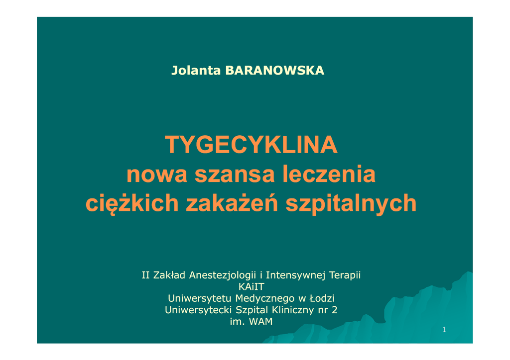 Jolanta BARANOWSKA TYGECYKLINA nowa szansa leczenia ciężkich zakażeń szpitalnych II Zakład Anestezjologii i Intensywnej Terapii KAiIT Uniwersytetu Medycznego w Łodzi Uniwersytecki Szpital Kliniczny nr 2 im. WAM 1 ZAKAŻENIA SZPITALNE TO CENA ZA POSTĘP W MEDYCYNIE 1. Liczne rezerwuary MDR w środowisku szpitalnym 2. Wzrastająca populacja pacjentów z deficytami immunologicznymi( onkologia, hematologia, OIT). 3. Wzrost ilości procedur inwazyjnych 4. Zmiana wrażliwości bakterii na antybiotyki. 5. Wzrost ilości szczepów opornych i wieloopornych 6. Pojawianie się nowych mechanizmów odporności. 7. Niewielki postęp we wprowadzaniu nowych antybiotyków ( trudna rejestracja, wątpliwe zyski, firmy farmaceutyczne nastawione na choroby przewlekłe). 2 TYGECYKLINA Pierwszy antybiotyk nowej grupy -glicylcyklin -pochodnych minocykliny. Zarejestrowana w 2005 roku przez FDA (US Food and Drug Administration) W lutym 2006 w Europie przez EMEA (European Medicines Agency) 3 Udowodniona skuteczność TYGECYKLINY wobec: Gram dodatnich 1. Enterococcus spp. w tym VRE 2. Streptococcus w tym S.pneumoniae, S.pneumoniae, także aktywna wobec szczepów opornych na penicylinę, tetracykliny i makrolidy. 3. S.aureus w tym MRSAMRSA-0,5mg/l VISA VISA--1mg/l. 4. CoNS( S.epidermidis) S.epidermidis) 4 Gram ujemnych 1.Haemophilus influenzae 2.Enterobacteriacae także dla szczepów ESBL i AmpC; MIC dlatych szczepów w przedziale 0,060,06-8mg/l -E. coli, -Klebsiella, -Serratia, -Stenotrophomonas maltophilia) 5 Beztlenowców 1.Bacteroides( najmniej aktywna wobec Bacteroides fragilis) 2.Clostridium perfringens 3.Peptococcus 6 Inne drobnoustroje wrażliwe 1.Mycoplasma pneumoniae 2.Chlamydia pneumoniae 3.Mycobacterium 7 ZMIENNA AKTYWNOŚĆ (oporność nabyta) wobec 1.Acinetobacter spp. aktywna jeśli zakażenie przebiega bez bakteriemii (stężenia w surowicy <MIC) 2.Proteus mirabilis 3.Morganella morgani 4.Providencia spp. 8 BRAK SKUTECZNOŚCI ! ! ! wobec Pseudomonas aeruginosa (oporność dziedziczna) 9 Farmakodynamika 1.Półsyntetyczna pochodna minocykliny należąca do grupy tzw GLICYLCYKLIN. Unikatowa struktura pozwoliła na ominięcie mechanizmów oporności na tetracykliny, które rozwinęły się w czasie 50 lat stosowania tej grupy antybiotyków 2.Pokonuje machanizmy oporności na tetracykliny blokowania rybosomu oraz efflux 3.Działa przez hamowanie syntezy białka; wiąże się z podjednostką 30S rybosomu, hamuje translację w komórce bakteryjnej . 4. Wykazuje głównie działanie bakteriostatyczne , niekiedy bakteriobójcze* ((S. S. aureus Kl. pneumoniae E. coli)* coli)* 10 Farmakokinetyka 1.Podawana wyłącznie dożylnie. 2.W 60% wiąże się z białkami osocza 3.Dobra dystrybucja tkankowa 4.Żle penetruje do kości, torebki maziowej i OUN. 5.Dobra penetracja do płuc, płynu zapalnego, płynu otrzewnowego. 11 Farmakokinetyka c.d. 6.Metabolizowana w wątrobie ale bez udziału enzymów cytochromu P P--45 7.Eliminacja drogą żółci(60%) 8.Średni okres półtrwania po podaniu wielu dawek wynosi 42 godziny 9.Aby uzyskać efekt terapeutyczny tygecyklina powinna osiągnąć poziom powyżej MIC przez ponad 50% czasu pomiędzy( zależność od AUC) 12 Wskazania CIĘŻKIE POWIKŁANE ZAKAŻENIA SKÓRY I TKANEK MIĘKKICH. POWIKŁANE ZAKAŻENIA WEWNĄTRZBRZUSZNE 13 Dawkowanie TYGECYKLINA podawana jest w dawce uderzeniowej 100 mg mg,, a następnie w dawce 50mg co 12 godzin w infuzji 30 30--60minut 14 Szczególne grupy pacjentów. 1.Brak rekomendacji do stosowania u dzieci i kobiet w ciąży. 2.U pacjentów z ciężką niewydolnością wątroby( grupa C (Child (Child-- Pugh) zmiana dawkowania: 1 dawka - 100mg, potem 25mg co12 h 3.Nie konieczności modyfikacji dawki w niewydolności nerek i u chorych dializowanych. 15 Podsumowanie: 1. 1.Tygacyklina Tygacyklina (rej . 2006) cechuje się wysoką aktywnością i szerokim spektrum. 2.Skuteczna w zakażeniach wieloopornych także mieszanych. 3. Doskonała dystrybucja w tkankach -w jamie brzusznej skuteczność porównywalna z Imipenemem -w tkankach miękkich i skórze z Wankomycyną+Aztreonam 16 PRZYPADEKPRZYPADEK- 1 PACJENTA LECZONEGO W ODDZIALE INTENSYWNEJ TERAPII USK NR 2 im. WAM 17 22-LETNI PACJENT 22SKIEROWANY ZOSTAŁ ZE SZPITALA WOJEWÓDZKIEGO DO OIT USK NR2 Z ROZPOZNANIEM „NACIEK ZAPALNY W MIEDNICY MAŁEJ ’’ 18 WYWIAD CHOROBOWY 1. Wielomiejscowe obrażenia w postaci: a. złamania mostka z obustronną odmą opłucnową b. złamania kręgu Th8 z przemieszczeniem i uciskiem rdzenia na tym poziomie 2. Po 19. dniowej hospitalizacji w szpitalu wojewódzkim przyjęty do USK im. WAM z powodu niewydolnoŚci oddechowej i tu rozpoznano: a. ropniak opłucnej b. stłuczenie i zapalenie płuc c. porażenie lewego fałdu głosowego (przedłużona intubacja) 19 3. Chory był leczony w ścisłej współpracy z torakochirurgami torakochirurgami:: a. Drenaż ssący jam opłucnowych b. Bronchoskopie c. HFJV d. Antybiotykoterapia zgodna z posiewem (MRSE) 4. Operacyjne zespolenie złamania kręgosłupa (diapason) 5. Pacjent z poprawą wypisany do domu (paraplegia (paraplegia--rehabilitacja rehabilitacja) ) 20 PO 6 TYGODNIACH OD OPUSZCZENIA SZPITALA – PODEJRZENIE ZAKAŻENIA UKŁADU MOCZOWEGO CHORY (rodzice) NIE WYRAZIŁ ZGODY NA LECZENIE W TAMTEJSZYM SZPITALU I ZOSTAŁ PONOWNIE PRZYJĘTY DO OIT USK NR2 W ŁODZI 21 BADANIE PRZEDMIOTOWE postępujĄce osłabienie tachykardia do 140/min RR 140/80 mm Hg gorączka do 38,5– 38,5–390 C bladość skóry i śluzówek niewielkie owrzodzenia i odleżyny na kończynach dolnych od dermatomu Th11 zaburzenia czucia paraplegia rana po operacji n n--chir. zagojona bez odczynu zapalnego 22 BADANIA LABORATORYJNE anemizacja 2,9 mlnµ/L HB HB--7,7G/dL nadpłytkowość 900 TYS/µL WBC 18,5TYS/ µL jonogram, glikemia, mleczany – wartości prawidłowe badanie moczu: pH 7,5 pojedyncze leukocyty, obecne białko białko--0,14g/l POSIEWY mocz - Staphylococcus aureus – MRSA krew - 3x posiew - wyhodowano MRSA tkanki pobrane śródoperacyjnie - 