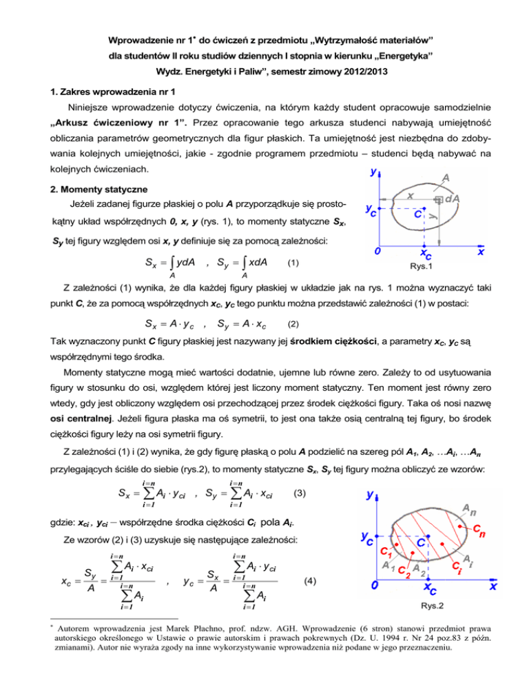 Wprowadzenie nr 1∗ do ćwiczeń z przedmiotu „Wytrzymałość materiałów” dla studentów II roku studiów dziennych I stopnia w kierunku „Energetyka” Wydz. Energetyki i Paliw”, semestr zimowy 2012/2013 1. Zakres wprowadzenia nr 1 Niniejsze wprowadzenie dotyczy ćwiczenia, na którym kaŜdy student opracowuje samodzielnie „Arkusz ćwiczeniowy nr 1”. Przez opracowanie tego arkusza studenci nabywają umiejętność obliczania parametrów geometrycznych dla figur płaskich. Ta umiejętność jest niezbędna do zdobywania kolejnych umiejętności, jakie - zgodnie programem przedmiotu – studenci będą nabywać na kolejnych ćwiczeniach. 2. Momenty statyczne JeŜeli zadanej figurze płaskiej o polu A przyporządkuje się prostokątny układ współrzędnych 0, x, y (rys. 1), to momenty statyczne Sx, Sy tej figury względem osi x, y definiuje się za pomocą zaleŜności: Sx = ∫ ydA , Sy = ∫ xdA A (1) Rys.1 A Z zaleŜności (1) wynika, Ŝe dla kaŜdej figury płaskiej w układzie jak na rys. 1 moŜna wyznaczyć taki punkt C, Ŝe za pomocą współrzędnych xC, yC tego punktu moŜna przedstawić zaleŜności (1) w postaci: S x = A ⋅ y c , Sy = A ⋅ xc (2) Tak wyznaczony punkt C figury płaskiej jest nazywany jej środkiem cięŜkości, a parametry xC, yC są współrzędnymi tego środka. Momenty statyczne mogą mieć wartości dodatnie, ujemne lub równe zero. ZaleŜy to od usytuowania figury w stosunku do osi, względem której jest liczony moment statyczny. Ten moment jest równy zero wtedy, gdy jest obliczony względem osi przechodzącej przez środek cięŜkości figury. Taka oś nosi nazwę osi centralnej. JeŜeli figura płaska ma oś symetrii, to jest ona takŜe osią centralną tej figury, bo środek cięŜkości figury leŜy na osi symetrii figury. Z zaleŜności (1) i (2) wynika, Ŝe gdy figurę płaską o polu A podzielić na szereg pól A1, A2, …Ai, …An przylegających ściśle do siebie (rys.2), to momenty statyczne Sx, Sy tej figury moŜna obliczyć ze wzorów: Sx = i =n i =n i =1 i =1 ∑ Ai ⋅ y ci , Sy = ∑ Ai ⋅ xci (3) gdzie: xci , yci – współrzędne środka cięŜkości Ci pola Ai. Ze wzorów (2) i (3) uzyskuje się następujące zaleŜności: i =n xc = Sy A = i =1 i =n ∑ Ai i =1 ∗ i =n ∑ Ai ⋅ xci , S yc = x = A ∑ Ai ⋅ y ci i =1 i =n (4) ∑ Ai i =1 Rys.2 Autorem wprowadzenia jest Marek Płachno, prof. ndzw. AGH. Wprowadzenie (6 stron) stanowi przedmiot prawa autorskiego określonego w Ustawie o prawie autorskim i prawach pokrewnych (Dz. U. 1994 r. Nr 24 poz.83 z późn. zmianami). Autor nie wyraŜa zgody na inne wykorzystywanie wprowadzenia niŜ podane w jego przeznaczeniu. 2 ZaleŜności (4) są wykorzystywane w praktyce inŜynierskiej do wyznaczania środka cięŜkości figury złoŜonej, którą moŜna podzielić na przylegające ściśle do siebie figury proste o znanych połoŜeniach środków cięŜkości. Takimi figurami prostymi są m. in. kwadraty, prostokąty i koła. 3. Przykład 1 3.1. Temat Wyznaczyć współrzędne xc , yc połoŜenia środka cięŜkości figury płaskiej (rys. 3), względem zadanych osi x2, y. Wymiary figury podano na rys. 3 w milimetrach. Wyniki obliczeń współrzędnych podać w centymetrach. 3.2. ZałoŜenia • PoniewaŜ oś y jest osią symetrii figury, współrzędna xC jest równa zero. Obliczyć naleŜy tylko współrzędną yC. • Figurę pokazaną na rys. 3 moŜna podzielić na przylegające ściśle do siebie trzy prostokąty o polach A1, A2, A3 mające środki cięŜkości C1, C2 , C3 o znanych połoŜeniach. Z tego powodu, do obliczenia współrzędnej yC moŜna zastosować wzór (4). Rys.3 3.3. Obliczenie pól A1, A2, A3 A1 = 60 ⋅ 20 = 12 ⋅ 10 2 mm2 = 12 cm 2 A2 = 20 ⋅ 120 = 24 ⋅ 10 2 mm2 = 24 cm 2 A3 = 100 ⋅ 20 = 20 ⋅ 10 2 mm2 = 20 cm 2 3.4.Określenie współrzędnych yc1, yc2, yc3 y c1 = 70 mm = 7 cm , y c2 = 0 , y c3 = −70 mm = −7 cm , 3.5. Obliczenie współrzędnej yc i =3 ∑ yc = Ai i =1 i =3 ⋅ y ci ∑ Ai = 12 ⋅ 7 + 24 ⋅ 0 + 20 ⋅ ( −7 ) = −1 cm 12 + 24 + 20 i =1 Ujemna wartość współrzędnej yc potwierdza, Ŝe środek cięŜkości C figury z rys. 3 jest usytuowany poniŜej osi x2. 3 4. Momenty bezwładności JeŜeli zadanej figurze płaskiej o polu A przyporządkuje się prostokątny układ współrzędnych 0, x, y (rys.4), to dla tej figury definiuje się trzy następujące rodzaje momentów bezwładności • momenty bezwładności osiowe: J x = ∫ y 2 dA , J y = ∫ x 2 dA A • moment bezwładności biegunowy: (5) A J ρ = ∫ ρ 2 dA = J x + J y (6) A • moment bezwładności dewiacji: D xy = ∫ xydA Rys. 4 (7) A Momenty bezwładności osiowe i biegunowe są zawsze wielkościami dodatnimi, natomiast moment dewiacji moŜe być dodatni, ujemny lub równy zero. Moment dewiacji jest równy zero wtedy, gdy przynajmniej jedna z osi x, y jest osią symetrii figury. W tym przypadku osie x, y są nazywane osiami głównymi figury. Gdy osie główne figury płaskiej przecinają się w środku jej cięŜkości, są one takŜe centralnymi osiami tej figury. Takie osie figury płaskiej nazywa się głównymi centralnymi osiami figury. JeŜeli momenty bezwładności figury płaskiej zostały obliczone względem jej głównych centralnych osi, to takie momenty są nazywane głównymi centralnymi momentami bezwładności. W tab. 1 zestawiono wzory algebraiczne do obliczeń głównych centralnych momentów bezwładności figur symetrycznych prostych oraz odpowiadających im figur symetrycznych złoŜonych z tzw. wybraniem. Tab.1. Figura symetryczna prosta Moment osiowy bezwładności Jx Jx = πd 4 64 A4 Jx = 12 Jx = BH 3 12 Jy Jy = Moment osiowy bezwładności Figura symetryczna złoŜona z wybraniem Jx πd 4 64 A4 Jy = 12 Jy = B3H 12 Jx = π ( D4 − d 4 ) 64 Jy = π ( D4 − d 4 ) 64 A4 − a 4 12 Jy = A4 − a 4 12 BH 3 − bh 3 12 Jx = B3 H − b3 h 12 Jx = Jx = Jy 4 Ze wzorów podanych w tab. 1 wynika, Ŝe gdy odpowiadające sobie figury syme
