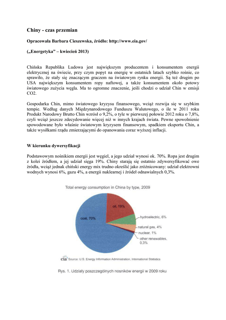 Chiny - czas przemian Opracowała Barbara Cieszewska, źródło: http://www.eia.gov/ („Energetyka” – kwiecień 2013) Chińska Republika Ludowa jest największym producentem i konsumentem energii elektrycznej na świecie, przy czym popyt na energię w ostatnich latach szybko rośnie, co sprawiło, że stały się znaczącym graczem na światowym rynku energii. Są też drugim po USA największym konsumentem ropy naftowej, a także konsumentem około potowy światowego zużycia węgla. Ma to ogromne znaczenie, jeśli chodzi o udział Chin w emisji CO2. Gospodarka Chin, mimo światowego kryzysu finansowego, wciąż rozwija się w szybkim tempie. Według danych Międzynarodowego Funduszu Walutowego, o ile w 2011 roku Produkt Narodowy Brutto Chin wzrósł o 9,2%, o tyle w pierwszej połowie 2012 roku o 7,8%, czyli wciąż jeszcze zdecydowanie więcej niż w innych krajach świata. Pewne spowolnienie spowodowane było właśnie światowym kryzysem finansowym, spadkiem eksportu Chin, a także wysiłkami rządu zmierzającymi do opanowania coraz wyższej inflacji. W kierunku dywersyfikacji Podstawowym nośnikiem energii jest węgiel, a jego udział wynosi ok. 70%. Ropa jest drugim z kolei źródłem, a jej udział sięga 19%. Chiny starają się ostatnio zdywersyfikować owe źródła, wciąż jednak chiński energy mix trudno określić jako zróżnicowany: udział elektrowni wodnych wynosi 6%, gazu 4%, a energii nuklearnej i źródeł odnawialnych 0,3%. Rząd chiński postawił sobie jednak za cel zwiększenie udziału paliw niekopalnych (non-fossil fuel) do 11,4% do roku 2015. Jest to część ostatniego planu 12-letniego. Międzynarodowa Agencja Energii (IEA) prognozuje, że udział węgla spadnie do roku 2035 do 59%. Stanie się tak dzięki między innymi podnoszeniu efektywności energetycznej i planom obniżenia emisji COr Nie mniej jednak, ponieważ zużycie energii szybko rośnie, absolutne zużycie węgla wzrośnie w tym czasie dwukrotnie. Zainstalowana w Chinach moc elektryczna wyniosła w roku 2011 - 1073 GW, jak informuje FACTS Global Energy, co jest największą na świecie mocą zainstalowaną w jednym kraju. Popyt na energię wciąż rośnie. Tylko w ciągu 5 lat, od 2005 roku, kiedy wynosiło 519 GW, do 2010 roku wzrosło o ponad 50%. W najbliższych latach spodziewany jest dalszy wzrost popytu na energię elektryczną, szczególnie w głównych zurbanizowanych obszarach, we wschodniej i południowej części Chin. Według FACTS Global Energy należy spodziewać się, że do roku 2030 zainstalowana moc podwoi się i wyniesie 2 390 GW. Najszybciej rośnie tempo budowy źródeł wykorzystujących gaz. Z ostatnich dostępnych danych (2010 r.) wynika, że produkcja energii wynosiła łącznie 3965 TWh i w ciągu roku, od 2009 r. wzrosła o 15% (dla porównania - produkcja energii w Polsce wynosiła w tym samym roku niespełna 160 TWh, czyli 25 razy mniej). Blisko 80% energii produkowanej jest ze źródeł konwencjonalnych, głównie z węgla. Międzynarodowa Agencja Energii przewiduje, że do roku 2035 zużycie energii elektrycznej powiększy się do 9583 TWh, a więc trzykrotnie, w porównaniu z rokiem 2010. Trzy czwarte energii elektrycznej zużywa w Chinach przemysł. Organizacja chińskiego sektora energetycznego W 2002 roku rząd przeorganizował monopolistyczną State Power Corporation (SPC) i stworzył oddzielne przedsiębiorstwa zajmujące się wytwarzaniem, przesyłem i usługami energetycznymi. Od czasów owej reformy chiński sektor energetycznych wytwórców zdominowany jest przez pięć państwowych holdingów: • • • • • China Huaneng Group, China Datang Group, China Huandian, Guodian Power, China Power lnvestment. Pięć wymienionych koncernów energetycznych wytwarza około połowy energii elektrycznej. Drugą połowę wytwarzają prywatni producenci, często powiązani z „prywatnymi" firmami związanymi z koncernami państwowymi. Tak więc deregulacja w części otwarła chiński rynek energetycznym na firmy zachodnie, jednak dostęp do niego jest, jak widać, wciąż limitowany, różnymi zresztą sposobami. Z kolei przesył i dystrybucja energii podzielone zostały pomiędzy dwie nowe kompanie: • • Southern Power Company, State Power Grid Company. Druga z wymienionych, State Power Grid Company, zajmuje się przesyłem energii w północnej części kraju, pierwsza natomiast, zgodnie z jej nazwą, w południowej. Także w 2002 roku ustanowiony został urząd regulatora: State Electricity Regulatory Commission (SERC). Zadaniem jego jest wymuszać wyższą efektywność energetyczną i działać na rzecz konkurencji w sektorze. Rząd Chin przywiązuje też ogromną wagę do kwestii Smart Grid. Pierwszy etap planu został zakończony w 2012 roku, kiedy to zakończono 238 projektów związanych z inteligentnymi sieciami. Energetyka cieplna Ponad 70% zainstalowanych mocy uzyskuje się z konwencjonalnych źródeł. W najbliższych latach węgiel i gaz pozostaną, jak się prognozuje, podstawą chińskiej energetyki cieplnej. Zainstalowane moce sięgały w 2011 roku 766 GW, jak podaje FACTS Global Energy. Dzieje się tak dlatego, że rezerwy węgla są wielkie, stąd jego udział pozostanie wciąż duży, mimo że rosnąć też będzie udział energii ze źródeł odnawialnych. Rząd chiński stara się zamykać lub modernizować wiele małych, nieefektywnych elektrowni na korzyść tych średniej wielkości (300-600 MW) i dużych (1000 MW i więcej). Celem rządu było wyeliminowanie elektrowni do 50 MW, a pozostawienie jedynie siłowni powyżej 70 MW. Więcej gazu Wprawdzie w Chinach gwałtownie rośnie zużycie gazu, wciąż jednak bloki gazowe produkują tylko około 4% energii elektrycznej. Ocenia się, że Chiny mają drugie co do wielkości zasoby gazu w rejonie Azja-Pacyfik. Wydobycie gazu naturalnego potroiło się w ciągu ostatniej dekady, jednak wobec gwałtownie rosnącego popytu Chiny od roku 2007 stały się importerem gazu. W 2011 roku
