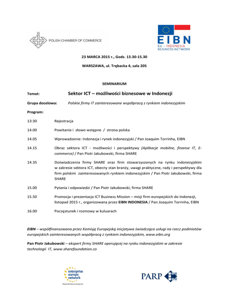 23 MARCA 2015 r., Godz. 13.30-15.30 WARSZAWA, ul. Trębacka 4, sala 205 SEMINARIUM Temat: Sektor ICT – możliwości biznesowe w Indonezji Grupa docelowa: Polskie firmy IT zainteresowane współpracą z rynkiem indonezyjskim Program: 13:30 Rejestracja 14.00 Powitanie i słowo wstępne / strona polska 14.05 Wprowadzenie: Indonezja i rynek indonezyjski / Pan Joaquim Torrinha, EIBN 14.15 Obraz sektora ICT - możliwości i perspektywy (Aplikacje mobilne, finanse IT, Ecommerce) / Pan Piotr Jakubowski, firma SHARE 14.35 Doświadczenia firmy SHARE oraz firm stowarzyszonych na rynku indonezyjskim w zakresie sektora ICT, obecny stan branży, uwagi praktyczne, rady i perspektywy dla firm polskim zainteresowanych rynkiem indonezyjskim / Pan Piotr Jakubowski, firma SHARE 15.00 Pytania i odpowiedzi / Pan Piotr Jakubowski, firma SHARE 15.50 Promocja i prezentacja ICT Business Mission – misji firm europejskich do Indonezji, listopad 2015 r., organizowana przez EIBN INDONESIA / Pan Joaquim Torrinha, EIBN 16.00 Poczęstunek i rozmowy w kuluarach EIBN – współfinansowana przez Komisję Europejską inicjatywa świadcząca usługi na rzecz podmiotów europejskich zainteresowanych współpracą z rynkiem indonezyjskim, www.eibn.org Pan Piotr Jakubowski – ekspert firmy SHARE operującej na rynku indonezyjskim w zakresie technologii IT, www.sharefoundation.co