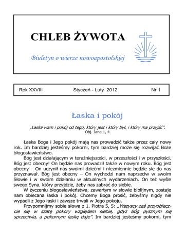 CHLEB ŻYWOTA Biuletyn o wierze nowoapostolskiej Rok XXVIII Styczeń - Luty 2012 Nr 1 Łaska i pokój „Łaska wam i pokój od tego, który jest i który był, i który ma przyjść”. Obj. Jana 1, 4 Łaska Boga i Jego pokój mają nas prowadzić także przez cały nowy rok. Im bardziej jesteśmy pokorni, tym bardziej może się rozwijać Boże błogosławieństwo. Bóg jest działającym w teraźniejszości, w przeszłości i w przyszłości. Bóg jest obecny! On będzie nas prowadził także w nowym roku. Bóg jest obecny – On uczynił nas swoimi dziećmi i niezmiennie będzie się do nas przyznawał. Bóg jest obecny – On wychodzi nam naprzeciw w swoim Słowie i w swoim działaniu w aktualnych wydarzeniach. On też wyśle swego Syna, który przyjdzie, żeby nas zabrać do siebie. W życzeniu błogosławieństwa, zawartym w słowie biblijnym, zostaje nam obiecana łaska i pokój. Chcemy Boga prosić, żebyśmy nigdy nie wypadli z Jego łaski i zawsze trwali w Jego pokoju. Przypomnijmy sobie słowa z 1. Piotra 5, 5: „Wszyscy zaś przyoblecz- cie się w szatę pokory względem siebie, gdyż Bóg pysznym się sprzeciwia, a pokornym łaskę daje”. Im bardziej jesteśmy pokorni, tym bardziej może przy nas działać łaska Boża. Bycie zawsze pokornym nie jest łatwe. Pokora obejmuje: poznanie, że jest się zależnym od Boga. Ezaw nie był pokorny i zlekceważył pierworództwo. poznanie własnej grzeszności. Kain zabił swojego brata, a pomimo to usiłował wymigać się z odpowiedzi na pytanie Boga i powiedział: „Czyż jestem stróżem brata mego?”. (por. 1. Mojżeszowa 4, 9) To nie była pokorna postawa. zaufanie do Pana i Jego prowadzenia bez nastawienia na żądania. Korachowi i jego poplecznikom zabrakło pokory i zapytali Mojżesza i Aarona: „...dlaczego więc wynosicie się ponad zgromadzenie Pańskie?”. (por. 4. Mojżeszowa 16, 3) Złoczyńca, który wisiał na krzyżu obok Pana także nie wykazał pokory, ponieważ powiedział: „Czy nie Ty jesteś Chrystusem? Ratuj siebie i nas”. (por. Ew. Łukasza 23, 39) Pozostańmy pokornymi! Pokora przed Bogiem ma także cechować nasze zachowanie pomiędzy sobą i to zgodnie ze słowami z Filipian 2, 3: „...w pokorze uważajcie jedni drugich za wyższych od siebie”. Pokorę traci się wtedy, kiedy siebie i swoje zdanie stawia się w centrum. Pamiętajmy o słowie: „On [Jezus Chrystus] jest pokojem naszym”. (Efezjan 2, 14) Chrystus przyniósł pokój z Bogiem. Poprzez uchwycenie łaski ciągle na nowo uzyskujemy ten pokój. Pokój z Bogiem ma prowadzić do pokoju między ludźmi. Doświadczenie pokazuje, że pokój pomiędzy ludźmi szybko może zostać zakłócony. Apostoł Paweł napominał omawiając zagadnienie zachowania małżeństwa bądź rozwodu: „do pokoju powołał was Bóg”. (por. 1. Koryntian 7, 15) A więc we wszystkich sytuacjach trzeba świadomie przypominać sobie o sile pokoju. Błogosławieństwem jest, jeśli w duchu pokoju zwraca się do tych spraw, które „służą do błogosławieństwa”. Już Psalmista się użalał: „Nie mówią bowiem o pokoju...”. (por. Psalm 35, 20) Zawsze starajmy się i zabiegajmy o zachowanie pokoju. Podsumowując można powiedzieć, że Bóg jest wszechobecny i niezmienny; On zwraca się do nas ciągle na nowo. Jego Syn wkrótce przyjdzie, aby swoich zabrać do siebie. Słowo biblijne zawiera życzenie błogosławieństwa: Łaska i pokój mają być z nami. Możemy przyczynić się do tego, aby to życzenie błogosławieństwa się wypełniło. Im bardziej jesteśmy pokorni, tym 2 więcej może działać przy nas łaska. A poprzez uchwycenie łaski mamy pokój. Pokój należy utrzymywać. To udaje się wtedy, kiedy czynimy to, co służy pokojowi. Pewność przez Chrystusa „On też jest przed wszystkimi rzeczami i wszystko na nim jest ugruntowane, On także jest Głową Ciała, Kościoła; On jest początkiem, pierworodnym z umarłych, aby we wszystkim był pierwszy, ponieważ upodobał sobie Bóg, żeby w nim zamieszkała cała pełnia boskości”. Kolosan 1, 17-19 Obecność Chrystusa w Kościele stwarza ufność i nadzieję, prowadzi do działania podobającego się Bogu. Na początku roku porusza nas myśl, co spotka nas w tym nowym okresie kalendarzowym. Przy tym budzi się pewnie niejedna troska o przyszłość i dokończenie dzieła Bożego. Co dawało siły naszym braciom i siostrom pierwotnego Kościoła w ciężkich okolicznościach, a nawet w sytuacjach zagrożenia życia i w prześladowaniach do pozostania wytrwałym? Oczywiście była to świadomość obecności Chrystusa w Kościele. (por. Rzymian 8, 34-39) Ta świadomość, że Chrystus jest Głową Kościoła, przemawia także z pieśni pierwotnych chrześcijan, której wstęp znajduje się w Liście do Kolosan. Jest to świadectwem wielkiego poznania mocy i siły Chrystusa. Chciejmy i my żyć w takim poznaniu, jak pierwsi chrześcijanie. To zapewnia ufność, pomimo jakiegoś zagrożenia ze strony wrogich Bogu mocy. Wbrew każdemu ludzkiemu doświadczeniu, gdzie wszystko ma początek i koniec, żyje w nas nadzieja na wieczne życie. Tą nadzieją jedynie jest Chrystus. On jest początkiem, Słowem, które utwierdza stworzenie. (por. Ew. Jana 1, 1-3) On jest także Stwórcą swojego Kościoła, za który nie uważa się zrzeszenia ludzi z jednakowymi poglądami i celami. Ci, którzy należą do Kościoła, mają wieczne przeznaczenie. (por. Efezjan 1, 3-5. 11. 12) Ważne jest okazywanie Synowi Bożemu pełnego zaufania i pozostawanie w naśladownictwie oraz w Jego Kościele, żeby w Nim zostać dokończonym w wierze. (por. Hebrajczyków 12, 1. 2) 3 Chrystus jest pierworodnym z umarłych, ponieważ jest pierwszym, który otrzymał od Boga ciało zmartwychwstalne. Przynależność do Kościoła Chrystusa jest właściwą podstawą nadziei na nasze własne zmartwychwstanie przy ponownym przyjściu Pana. (por. 1. Koryntian 15, 20-23) To daje nam obfite pocieszenie w smutku i w żałobi