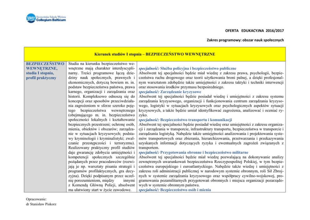 OFERTA EDUKACYJNA 2016/2017 Zakres programowy: obszar nauk społecznych Kierunek studiów I stopnia – BEZPIECZEŃSTWO WEWNĘTRZNE BEZPIECZEŃSTWO WEWNĘTRZNE, studia I stopnia, profil praktyczny Opracowanie: dr Stanisław Piskorz Studia na kierunku bezpieczeństwo wewnętrzne mają charakter interdyscyplinarny. Treści programowe łączą dziedziny nauk społecznych, prawnych i ekonomicznych, dotyczą bowiem m. in. podstaw bezpieczeństwa państwa, prawa karnego, organizacji i zarządzania oraz historii. Kompleksowo odnoszą się do koncepcji oraz sposobów przeciwdziałania zagrożeniom w sferze szeroko pojętego bezpieczeństwa wewnętrznego (obejmującego m. in. bezpieczeństwo społeczności lokalnych i kształtowanie bezpiecznych przestrzeni; ochronę osób, mienia, obiektów i obszarów; zarządzanie w sytuacjach kryzysowych; podstawy kryminologii i kryminalistyki; zwalczanie przestępczości i terroryzmu). Realizowany praktyczny profil studiów daje gwarancję zdobycia umiejętności i kompetencji społecznych szczególnie pożądanych przez pracodawców (rozwijają je np. warsztaty pisania strategii i programów profilaktycznych, gra decyzyjna). Dzięki podpisanym przez uczelnię porozumieniom, między innymi z Komendą Główną Policji, absolwent ma ułatwiony start w życie zawodowe. specjalność: Służba policyjna i bezpieczeństwo publiczne Absolwent tej specjalności będzie miał wiedzę z zakresu prawa, psychologii, bezpieczeństwa ruchu drogowego oraz teorii użytkowania broni palnej, a dzięki profesjonalnym warsztatom zdobędzie także umiejętności z zakresu taktyki i techniki interwencji oraz stosowania środków przymusu bezpośredniego. specjalność: Zarządzanie kryzysowe Absolwent tej specjalności będzie posiadał wiedzę i umiejętności z zakresu systemu zarządzania kryzysowego, organizacji i funkcjonowania centrum zarządzania kryzysowego, logistyki w sytuacjach kryzysowych oraz psychologicznych aspektów sytuacji kryzysowych, a także będzie umiał identyfikować zagrożenia, analizować i oceniać ryzyko. specjalność: Bezpieczeństwo transportu i komunikacji Absolwent tej specjalności będzie posiadał wiedzę oraz umiejętności z zakresu organizacji i zarządzania w transporcie, infrastruktury transportu, bezpieczeństwa w transporcie i zarządzania logistyką. Nabędzie także umiejętności analizowania i projektowania systemów transportowych oraz zbierania, hierarchizowania, przetwarzania i przekazywania uzyskanych informacji dotyczących ryzyka i ewentualnych zagrożeń związanych z transportem. specjalność: Przygotowania obronne i bezpieczeństwo militarne Absolwent tej specjalności będzie miał wiedzę pozwalającą na dokonywanie analizy zewnętrznych uwarunkowań bezpieczeństwa Rzeczypospolitej Polskiej, w tym bezpieczeństwa europejskiego i euroatlantyckiego. Nabędzie także wiedzę i umiejętności z zakresu roli administracji publicznej w narodowym systemie obronnym, roli Sił Zbrojnych w systemie zarządzania kryzysowego oraz współpracy cywilno-wojskowej, programowania pozamilitarnych przygotowań obronnych i miejsca organizacji pozarządowych w systemie obronnym państwa. specjalność: Bezpieczeństwo osób i mienia OFERTA EDUKACYJNA 2016/2017 Zakres programowy: obszar nauk społecznych Twoja przyszłość Absolwent będzie przygotowany do pracy w administracji publicznej z ukierunkowaniem na jednostki organizacyjne służb państwowych i samorządowych odpowiedzialnych za bezpieczeństwo wewnętrzne, np.: Policja, Wojsko Polskie, Służba Więzienna, Urząd Celny, Straż Graniczna, centra zarządzania kryzysowego istniejące przy urzędach wojewódzkich, powiatowych i gminnych, formacje obrony cywilnej kraju, agencje ochrony mienia, agencje detektywistyczne, służby odpowiedzialne za bezpieczeństwo portów morskich i lotniczych, inne instytucje wykorzystujące w swej działalności różnorodne formy zapewnienia bezpieczeństwa wewnętrznego. Opracowanie: dr Stanisław Piskorz Absolwent tej specjalności będzie miał wiedzę i umiejętności z zakresu struktury i działalności agencji ochrony osób i mienia, zabezpieczania imprez masowych, konwojowania oraz psychologicznych aspektów sytuacji kryzysowych. Będzie znał problematykę detektywistyczną, a także wykazywał się umiejętnościami z zakresu taktyki i techniki interwencji. specjalność: Penitencjarystyka Absolwent tej specjalności będzie miał wiedzę i umiejętności z zakresu systemów penitencjarnych, służby więziennej, patologii społecznej oraz resocjalizacji osób niedostosowanych społecznie. Będzie też umiał wykorzystywać wiedzę psychologiczną w sytuacjach zagrożenia, a także identyfikować przestępczość nieletnich i jej przeciwdziałać.