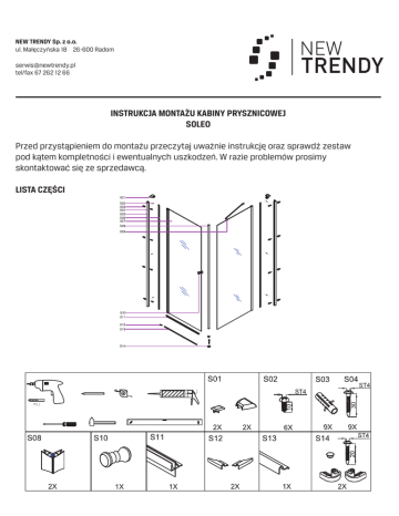 NEW TRENDY Sp. z o.o. ul. Małęczyńska 18 26-600 Radom [email protected] tel/fax 67 262 12 66 INSTRUKCJA MONTAŻU KABINY PRYSZNICOWEJ SOLEO Przed przystąpieniem do montażu przeczytaj uważnie instrukcję oraz sprawdź zestaw pod kątem kompletności i ewentualnych uszkodzeń. W razie problemów prosimy skontaktować się ze sprzedawcą. LISTA CZĘŚCI Prosimy o czyszczenie aluminiowych powierzchni kabiny oraz szyb miękką szmatka używając łagodnych środków czyszczących. W celu zapewnienia prawidłowego działania rolek należy je raz w miesiącu zabezpieczyć wazeliną sanitarną. Stosowanie środków nie zalecanych przez producenta i niewłaściwa konserwacja rolek może narazić Państwa na utratę gwarancji. ŻYCZYMY PRZYJEMNEGO UŻYTKOWANIA NASZEGO PRODUKTU.