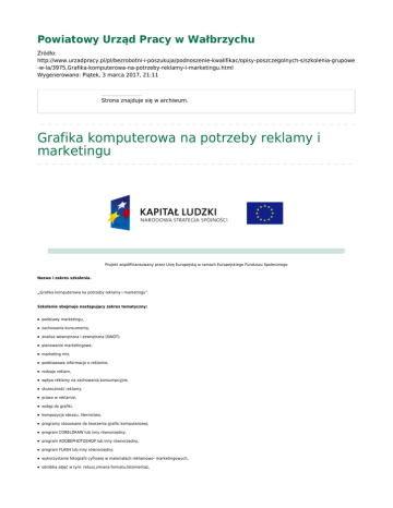 Powiatowy Urząd Pracy w Wałbrzychu Źródło: http://www.urzadpracy.pl/pl/bezrobotni-i-poszukuja/podnoszenie-kwalifikac/opisy-poszczegolnych-s/szkolenia-grupowe -w-la/3975,Grafika-komputerowa-na-potrzeby-reklamy-i-marketingu.html Wygenerowano: Piątek, 3 marca 2017, 21:11 Strona znajduje się w archiwum. Grafika komputerowa na potrzeby reklamy i marketingu Projekt współfinansowany przez Unię Europejską w ramach Europejskiego Funduszu Społecznego Nazwa i zakres szkolenia. „Grafika komputerowa na potrzeby reklamy i marketingu”. Szkolenie obejmuje następujący zakres tematyczny: ● podstawy marketingu, ● zachowanie konsumenta, ● analiza wewnętrzna i zewnętrzna (SWOT), ● planowanie marketingowe, ● marketing mix, ● podstawowe informacje o reklamie, ● rodzaje reklam, ● wpływ reklamy na zachowania konsumpcyjne, ● skuteczność reklamy, ● prawo w reklamie, ● wstęp do grafiki, ● kompozycja obrazu, liternictwo, ● programy stosowane do tworzenia grafiki komputerowej, ● program CORELDRAW lub inny równorzędny, ● program ADOBEPHOTOSHOP lub inny równorzędny, ● program FLASH lub inny równorzędny, ● wykorzystanie fotografii cyfrowej w materiałach reklamowo- marketingowych, ● obróbka zdjęć w tym: retusz,zmiana formatu,fotomontaż, ● przygotowanie materiałów reklamowych na potrzeby internetu, ● tworzenie reklam, ogłoszeń prasowych, ● przygotowanie materiałów reklamowych do druku. Liczba uczestników szkolenia: 5 osób bezrobotnych. Liczba godzin szkolenia: 250 godzin lekcyjnych, w tym: ● zajęcia teoretyczne 65 godzin lekcyjnych, ● zajęcia praktyczne 180 godzin lekcyjnych, ● egzamin 5 godzin lekcyjnych. Miejsce realizacji szkolenia: Ośrodek Szkolenia Technicznego Sp. z o. o., Plac Skarżyńskiego 1, 58-301 Wałbrzych. Termin realizacji szkolenia: 07.09.2009r. - 23.10.2009r. Wymagania: Szkolenie przeznaczone dla osób bezrobotnych z wykształceniem minimum średnim posiadających bardzo dobrą umiejętność obsługi komputera. Rodzaje zaświadczeń i innych dokumentów potwierdzających ukończenie szkolenia i nabycie kwalifikacji zawodowych: ● zaświadczenie ukończenia szkolenia zgodne z rozporządzeniem Ministra Edukacji i Nauki z dnia 3 lutego 2006r. w sprawie uzyskania i uzupełnienia przez osoby dorosłe wiedzy ogólnej, umiejętności i kwalifikacji zawodowych w formach pozaszkolnych, ● certyfikat (z odpowiednim oznakowaniem promocyjnym) potwierdzający ukończenie szkolenia. SZKOLENIE WSPÓŁFINANSOWANE ZE ŚRODKÓW EUROPEJSKIEGO FUNDUSZU SPOŁECZNEGO REALIZOWANE W RAMACH PROJEKTU pn. „ PRZECIW BEZROBOCIU” 6.1.3. PO KL Metryka strony Data publikacji 12.03.2009 Data modyfikacji 19.02.2010Rejestr zmian Osoba publikująca: Przemysław Pęcak Autor: Magdalena Oleś Liczba wejść: 1021 Drukuj Generuj PDF Powiadom znajomego Wstecz
