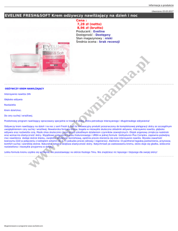 Informacje o produkcie Utworzono 03-03-2017 EVELINE FRESH&SOFT Krem odżywczy nawilżający na dzień i noc Cena : 7,28 zł (netto) 8,96 zł (brutto) nn a .p l Producent : Eveline Dostępność : Dostępny Stan magazynowy : niski Średnia ocena : brak recenzji aa ODŻYWCZY KREM NAWILŻAJĄCY Intensywnie nawilża 24h ni Głęboko odżywia Rozświetla w Krem dzień/noc. ur to Do cery suchej i wrażliwej. Przełomowy program nawilżający opracowany specjalnie w trosce o skórę, która potrzebuje intensywnego i długotrwałego odżywienia! w w .h Odżywczy krem nawilżający na dzień i na noc z serii Fresh & Soft to innowacyjny produkt przeznaczony do kompleksowej pielęgnacji skóry ze szczególnym uwzględnieniem cery suchej i wrażliwej. Nowatorska formuła kremu, bogata w niezwykle skuteczne składniki aktywne, intensywnie nawilża, głęboko odżywia oraz rozświetla cerę. Masło shea skutecznie chroni przed szkodliwym działaniem czynników zewnętrznych. Olejek arganowy zmiękcza naskórek oraz wzmacnia elastyczność skóry. Wyjątkowe połączenie kwasu hialuronowego i UREA w jednej formule bioHyaluron Plus Complex, zapewnia podwójną moc nawilżenia dodaje skórze blasku, zwiększa aktywność komórkową, opóźnia proces starzenia się oraz intensywnie nawilża. Wysoka zawartość koenzymu Q10 w połączeniu z koktajlem witamin (A, E, F) pobudza proces odnowy i regeneracji. Alantoina i D-panthenol łagodzą podrażnienia, przynoszą komfort suchej i szorstkiej skórze. Naturalna betaina zwiększa elastyczność skóry. Natychmiast po zastosowaniu kremu, skóra staje się gładka, widocznie rozświetlona i niezwykle przyjemna w dotyku. w Lekka formuła kremu szybko się wchłania, nie pozostawiając na skórze tłustego ?lmu. Nie znajdziesz nic lepszego i lżejszego dla swojej skóry! Wygenerowano w programie www.oscGold.com